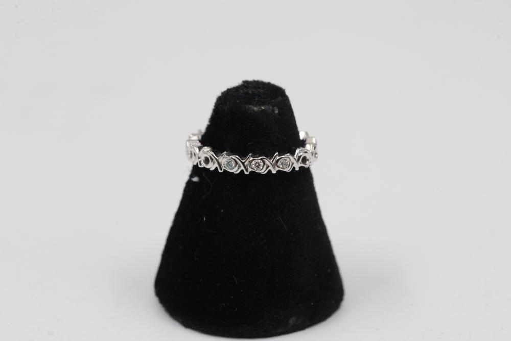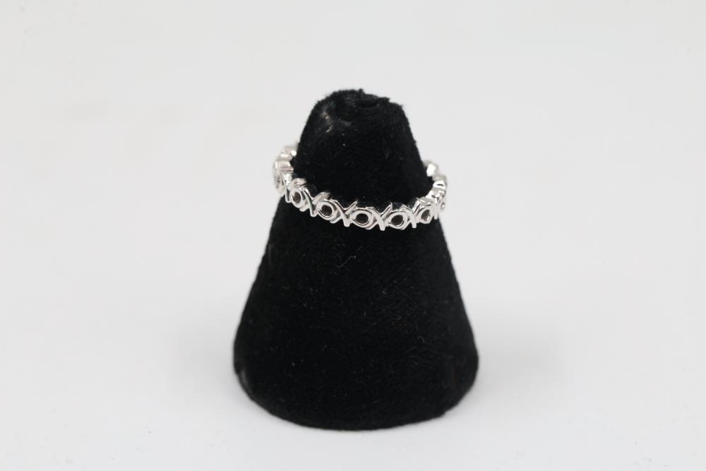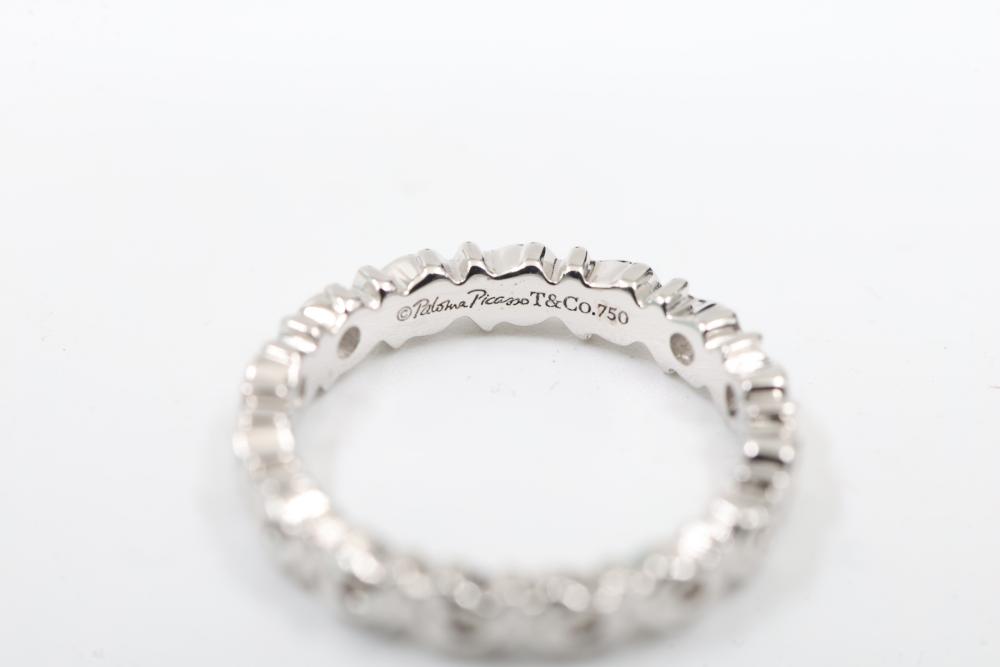 New 18K White Gold & Diamonds Tiffany & Co. Paloma Picasso Graffiti Narrow Love Kisses Ring. Designed by Paloma Picasso, this ring features a graffiti-inspired design with "love" and "kisses" motifs. Crafted in 18K White gold, it is a striking addition to any jewelry collection. Size 5.5. Total weight being 3.3 grams. Retail value of $2,500.