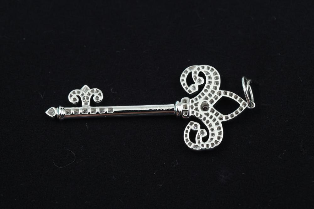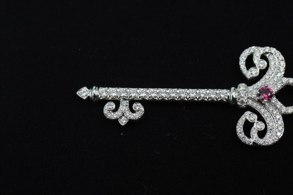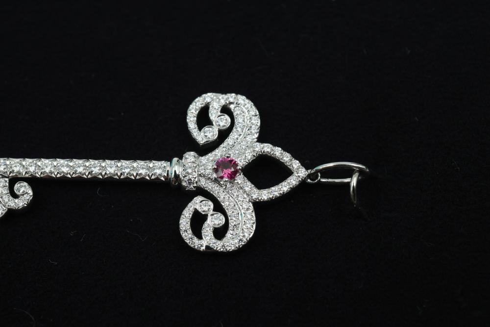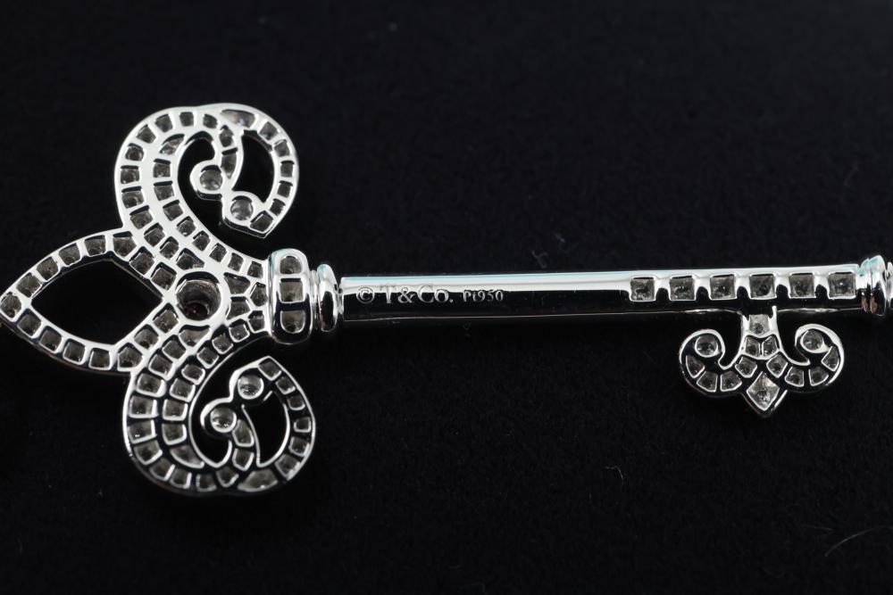 New Tiffany & Co. Platinum "Enchant" Key Pendant with Diamonds and Ruby. This intricately designed key-shaped pendant is crafted from platinum and features numerous diamonds set throughout, with a single ruby accent at the center. Hallmarked with Tiffany & Co. and Pt950. Excellent condition and presented in the original Tiffany & Co. box. Total weight being 4.8 grams. Retail value of $8,500.