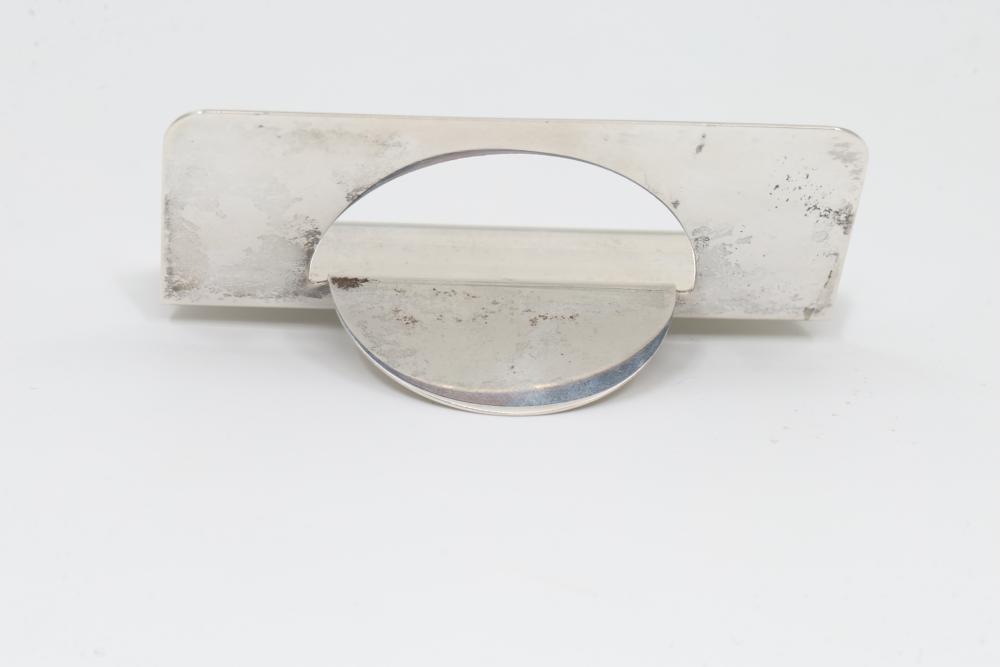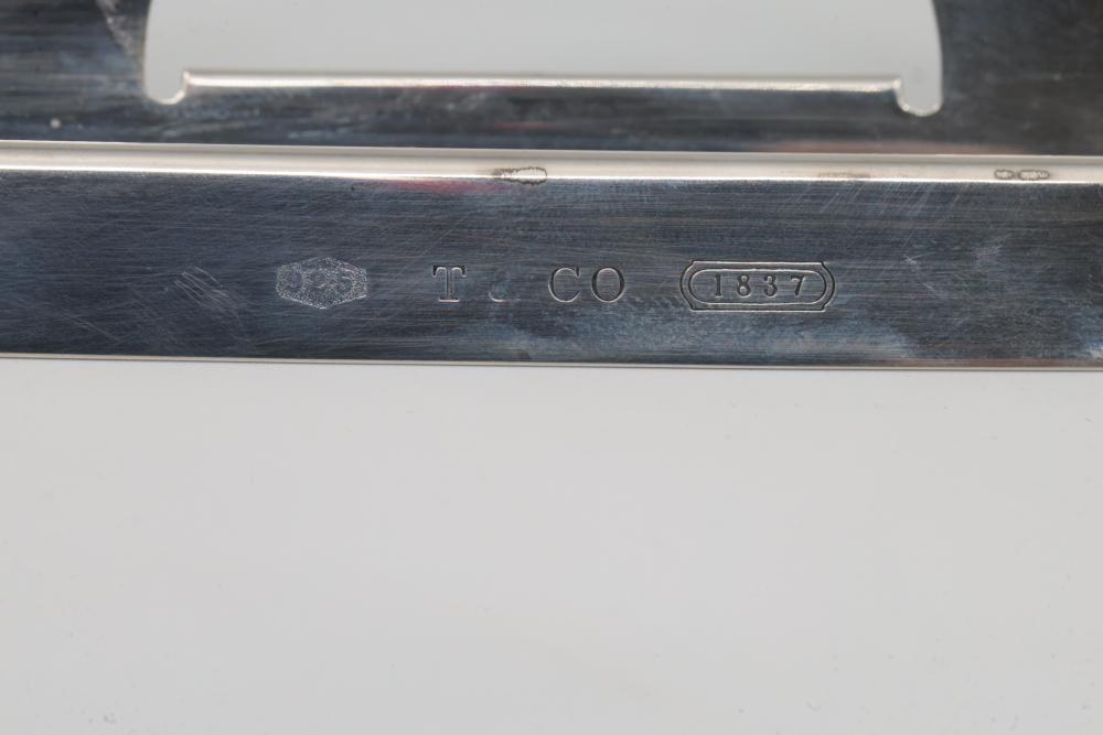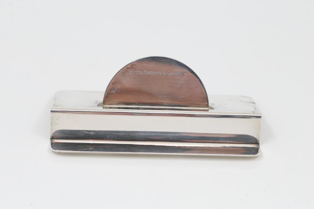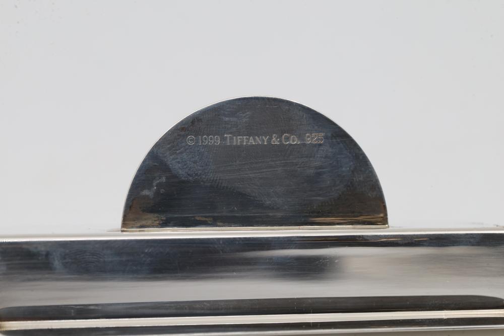 Tiffany & Co. Sterling Silver 925 Letter Holder. Crafted from sterling silver with visible hallmarks including "T&CO 1837" and "925." Stamped with "1999 Tiffany & Co." Polished metal surface and functional letter-slot design. Total weight being 43.