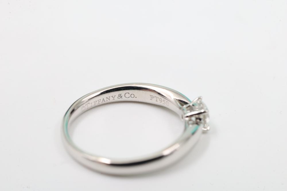 Tiffany & Co. Platinum "Harmony" Engagement Ring with Diamond and Certification. Features a platinum band marked PT950, set with a round brilliant diamond weighing 0.22 carats, color grade F, clarity grade VS2, and graded with excellent symmetry and polish. Includes original Tiffany & Co. pouch and diamond certification document. Size 3.75, total weight being 3 grams.