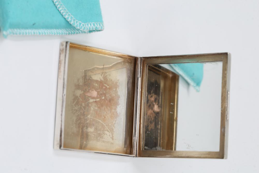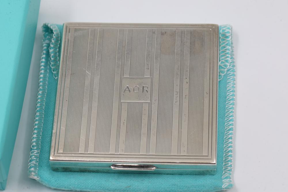 Vintage Tiffany & Co. Sterling Silver Compact With Monogram A.G.R. Features a textured exterior and includes a mirror and interior compartment. Marked Tiffany & Co. Sterling on the side rim. Comes with a teal protective pouch. Total weight of 102 grams.