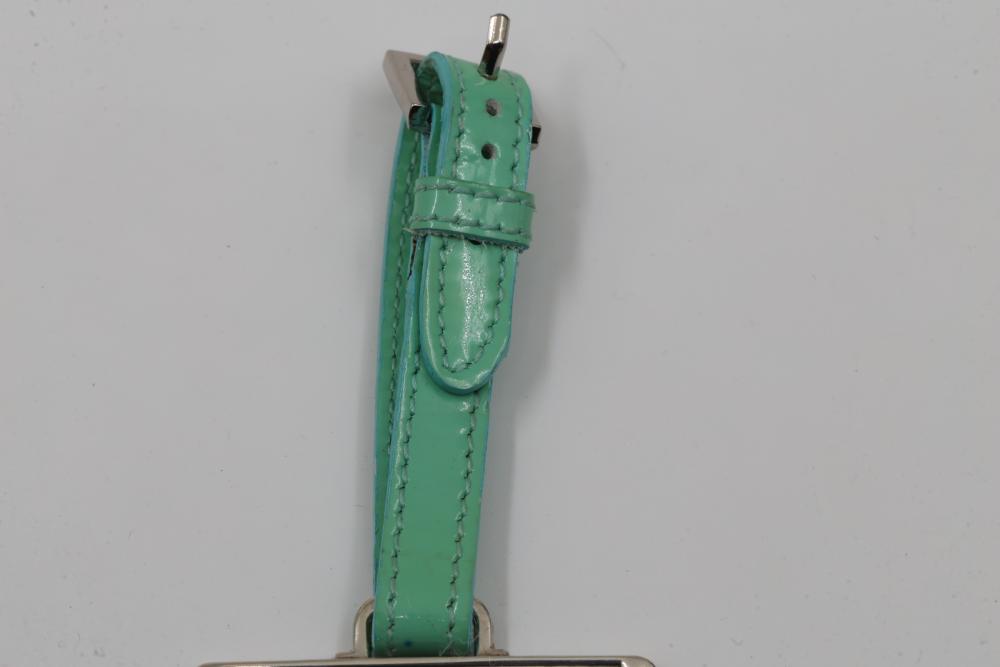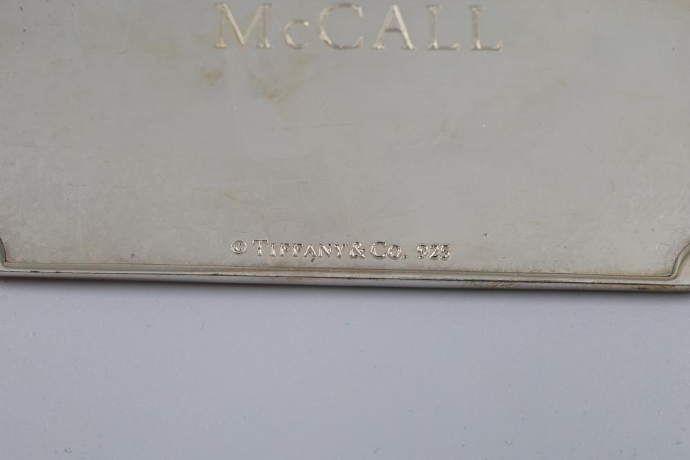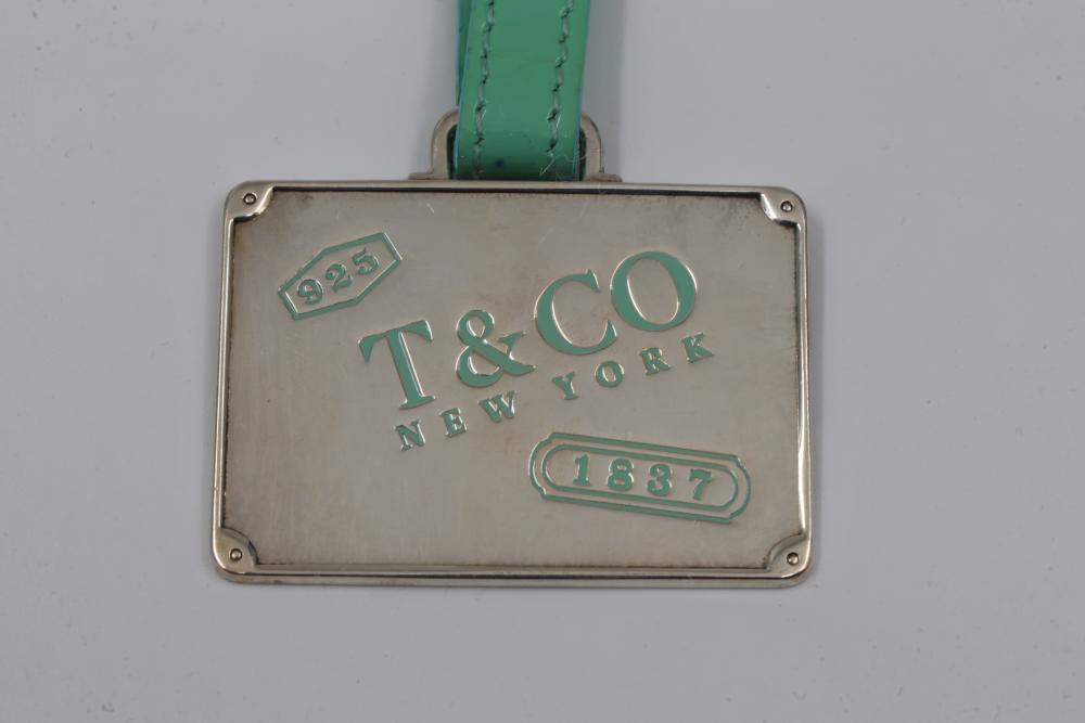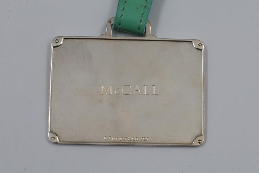 Tiffany & Co. Sterling Silver Luggage Tag with Green Leather Strap. Features an engraved front with the brand's signature style and "McCall"� engraved on the back. Made of .925 sterling silver and connected to a stitched green leather adjustable strap. Total weight being 39 grams.