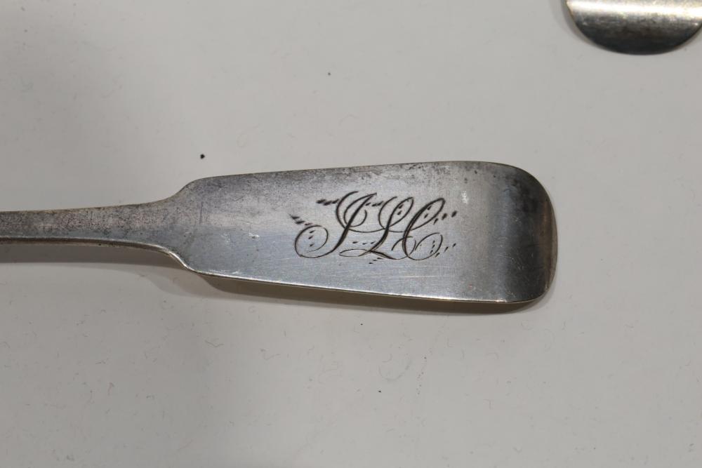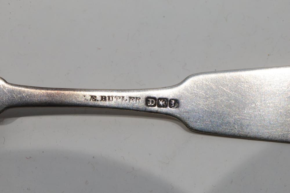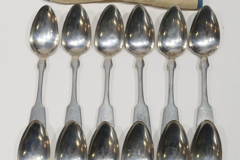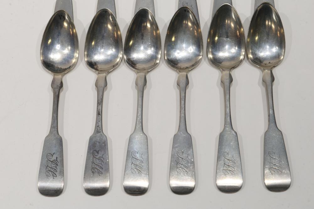 12 G.E. Butler coin silver spoons featuring engraved details and hallmarks on the handle. Each spoon has a monogram and is stamped with the maker's mark and other identifying hallmarks. Total weight being 256 grams.