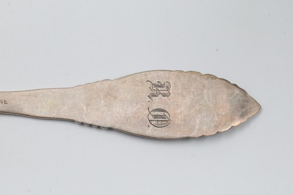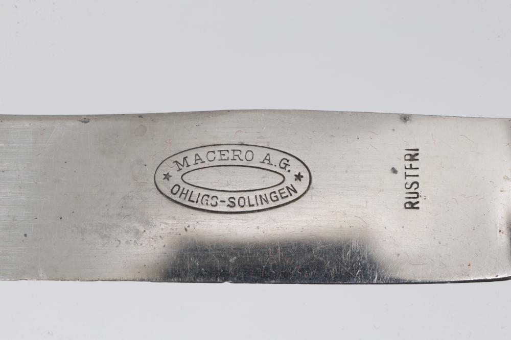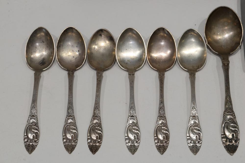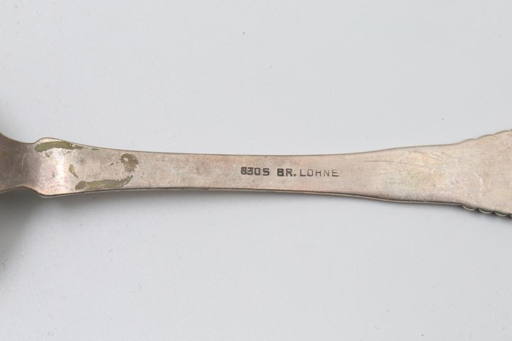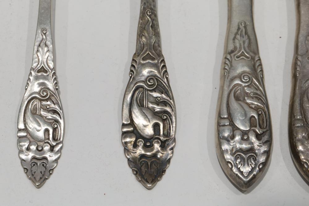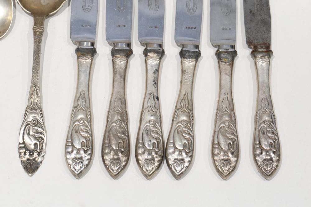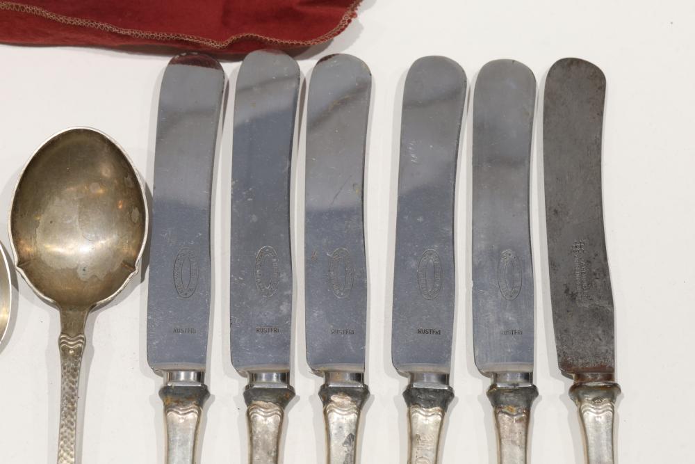 Sterling Silver Flatware including six spoons and six knives with ornate designs, and one serving spoon. Items feature intricate patterns and are marked with details, including '830S BR. Lohne' and 'Mastro A.G. Ohligs-Solingen Rustfrei.' The set includes a rolled storage case. Total weight of spoons being 241 grams, total weight of sterling handle knives being 491 grams.