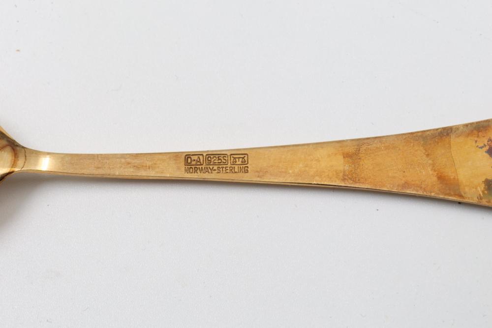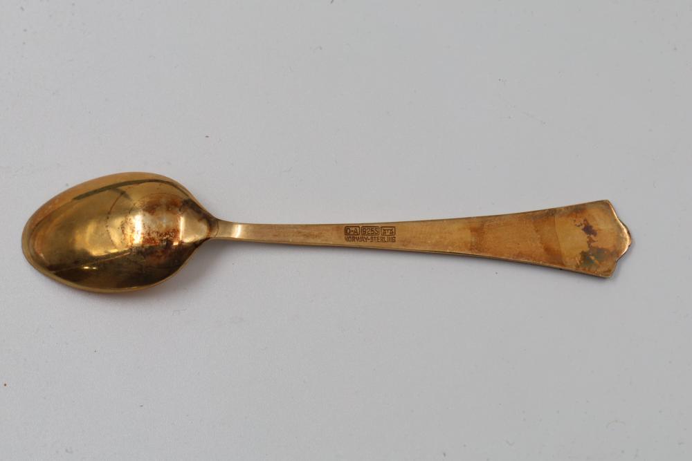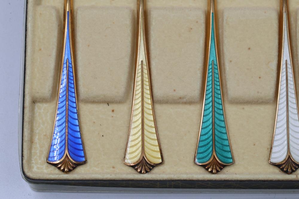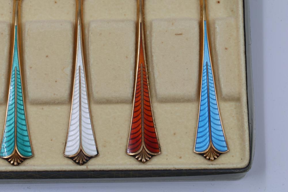 6 Sterling Silver and Enamel Demitasse Spoons featuring gold-washed bowls and handles with brightly colored enamel detailing in blue, green, yellow, white, light blue, and red. Each is marked 925S and Norway Sterling. Total weight being 59 grams.