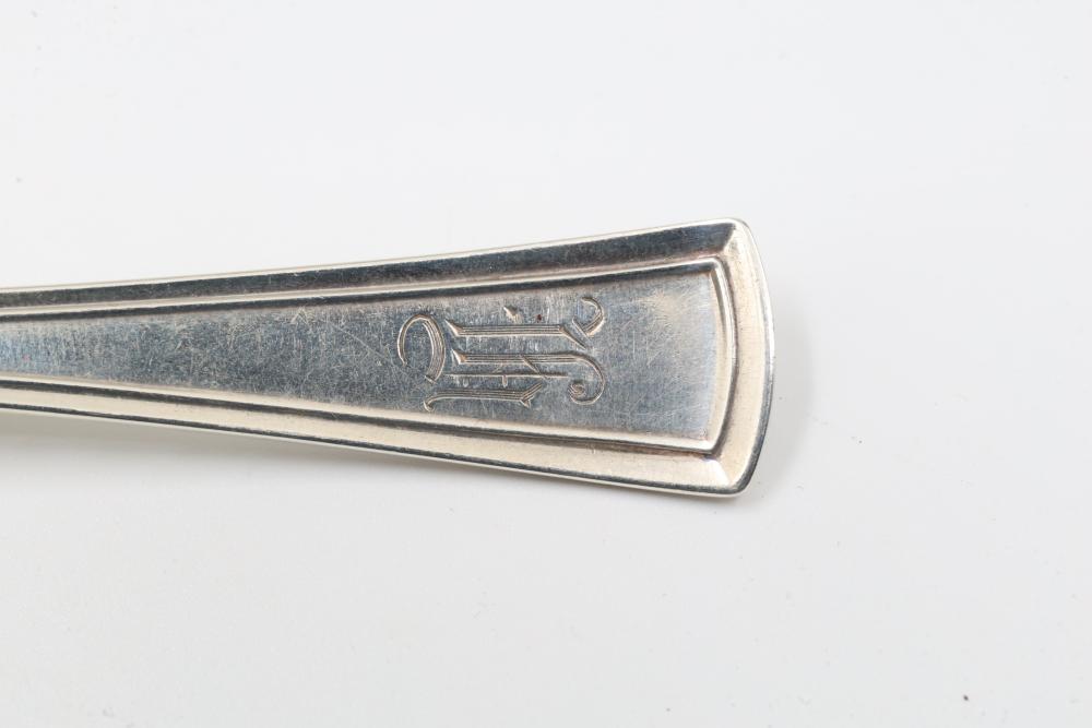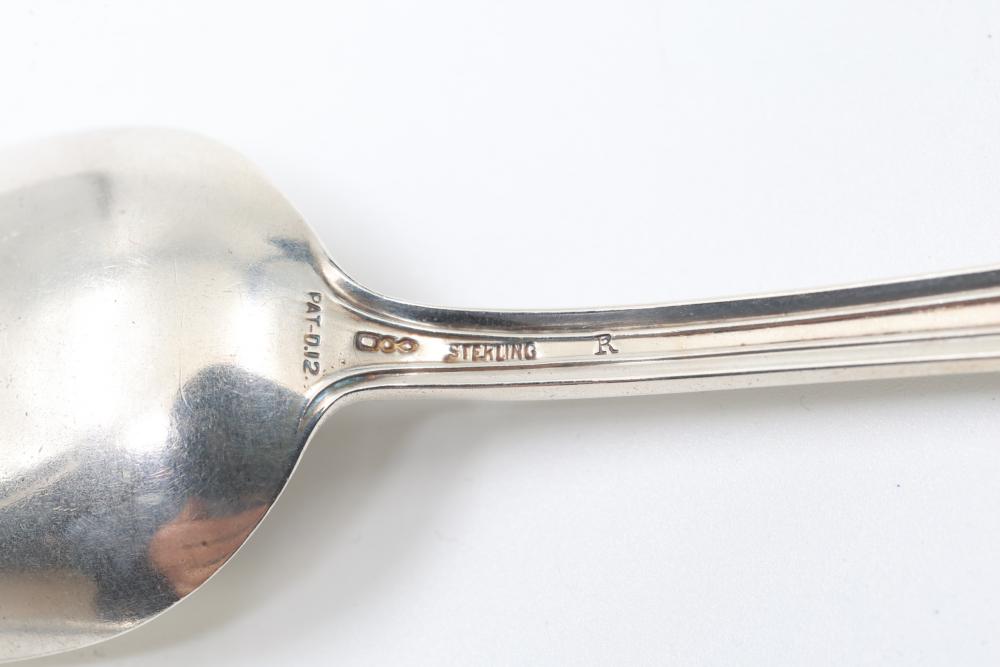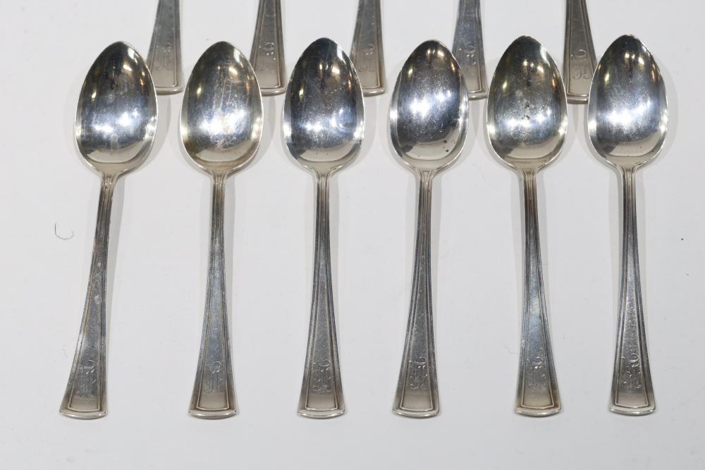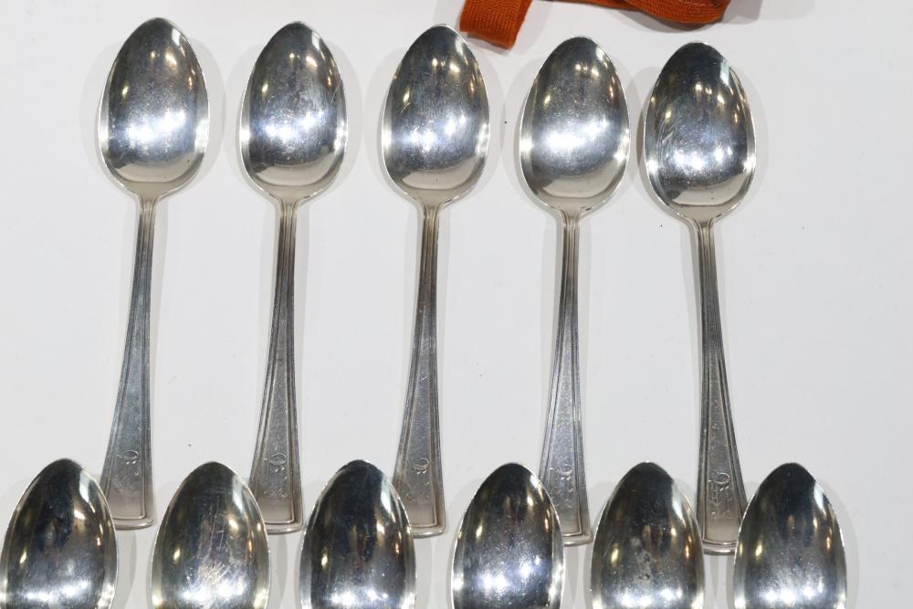 11 Sterling Silver Spoons with Monogram. Marked "Sterling" on the back of each handle. Features an engraved monogram on each spoon and comes in fabric storage wrap. Total weight being 221 grams.