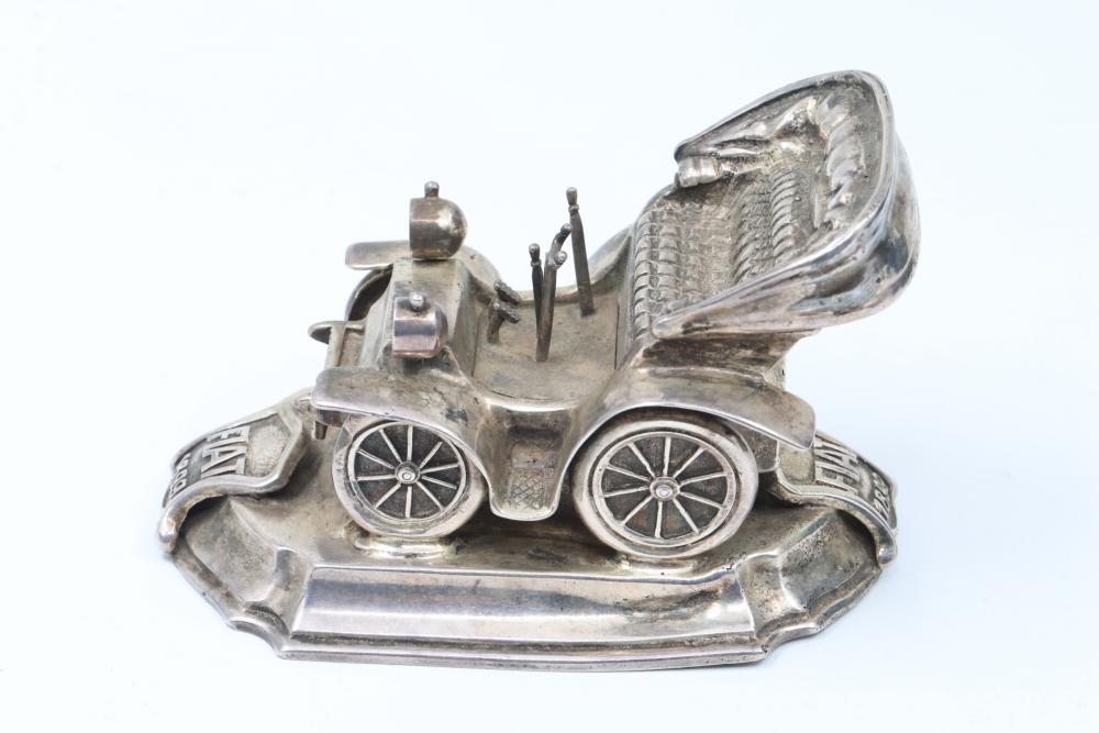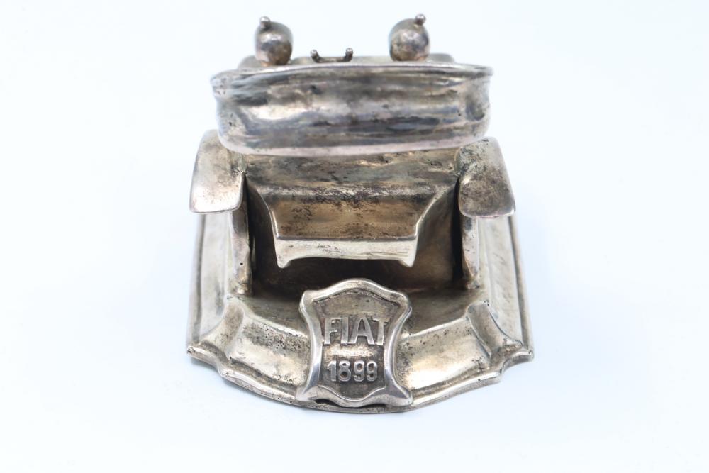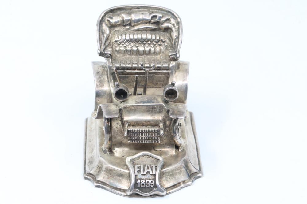 Believed to be "800"� Silver, Silver-Toned Fiat 1899 Model Car Figurine. Cast in a vintage automobile design with intricate detailing, including visible seating, wheels, and headlights. Features an engraved Fiat 1899 plaque on the front of the vehicle. Total weight being 712 grams.