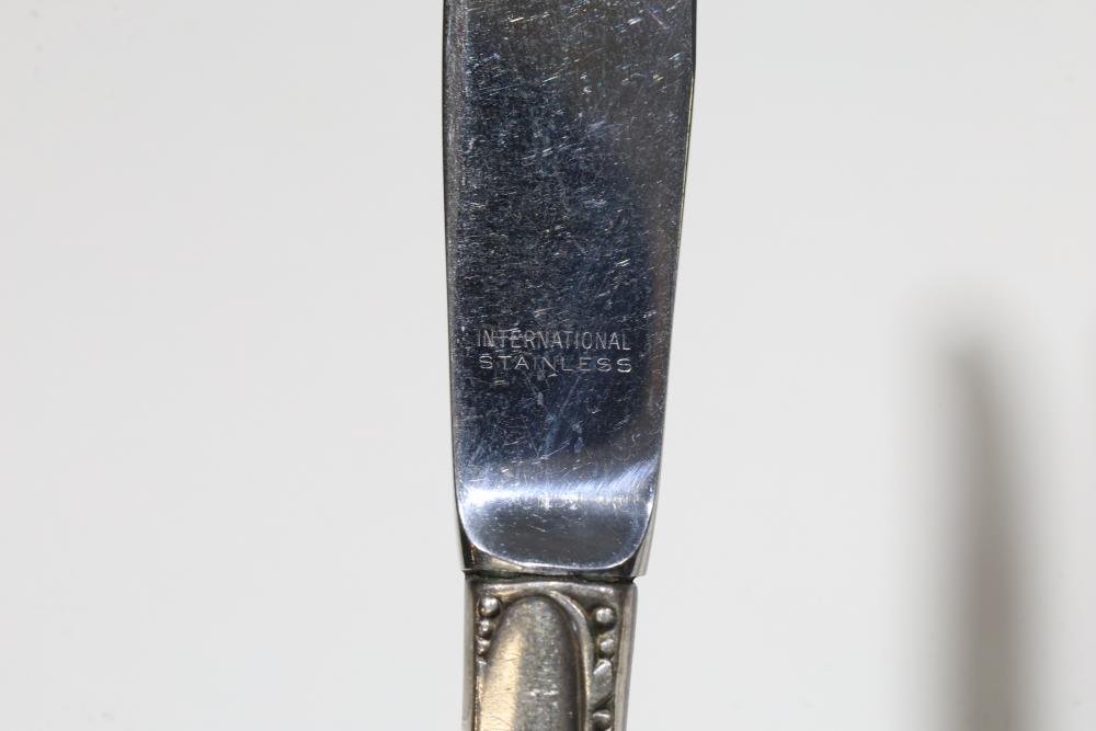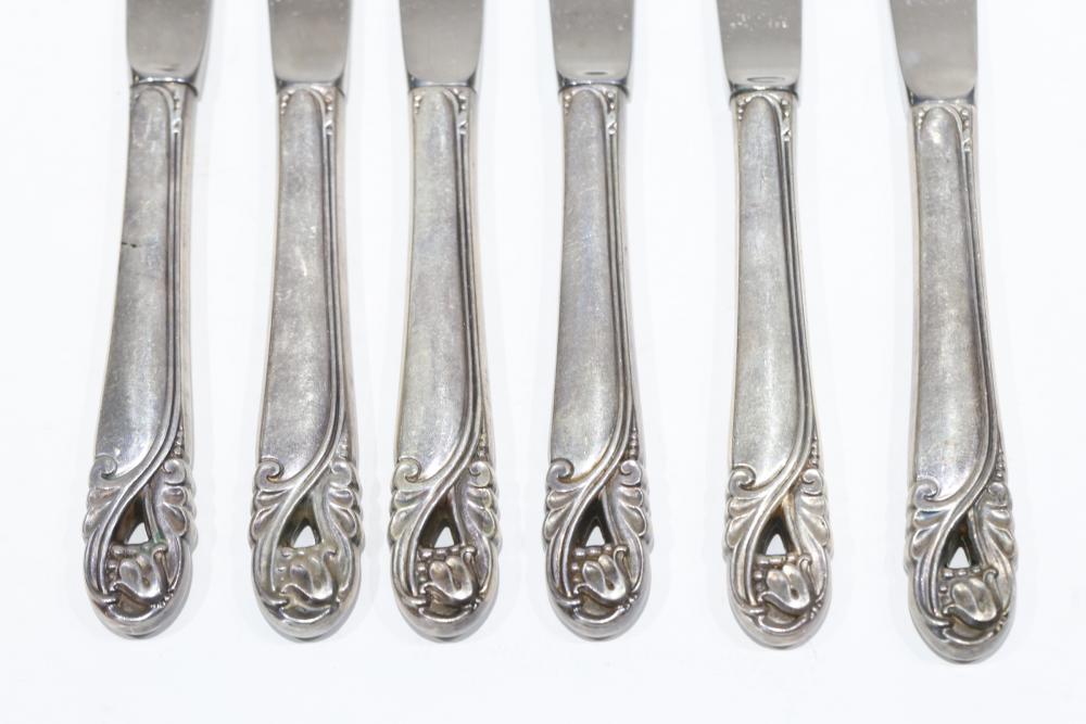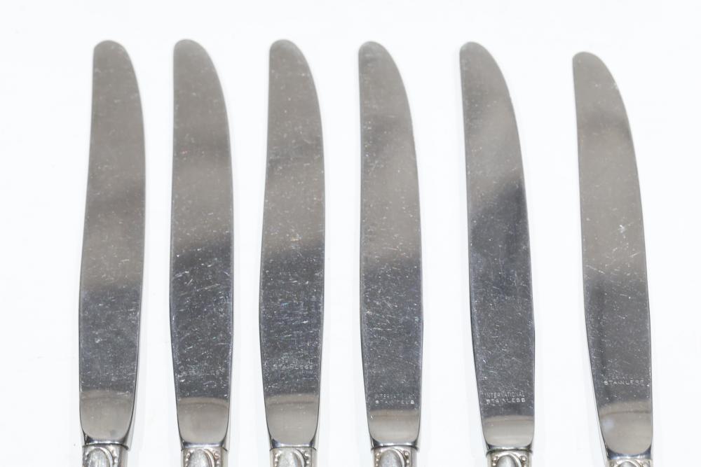 12 International Sterling handle knives with decorative handles. Each knife features an ornate design and the engraved letters 'DE P'. The blades are stainless steel, total weight being 884 grams.
