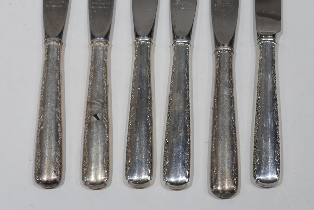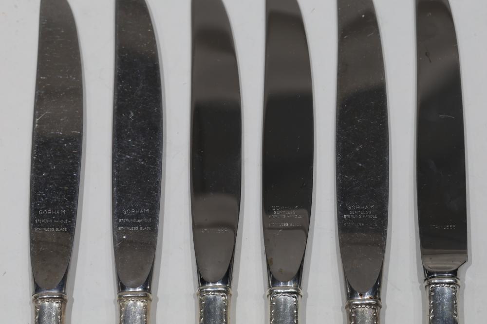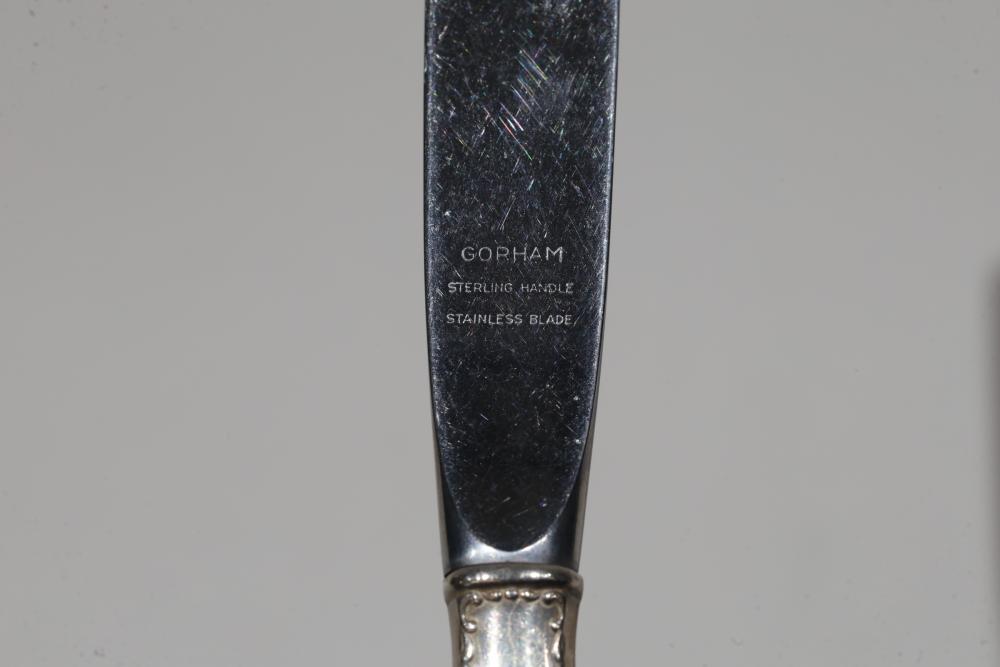 11 Gorham Sterling Handle Knives. Each knife features a stainless-steel blade and a handle adorned with an intricate patterned design. Total weight being 777 grams.