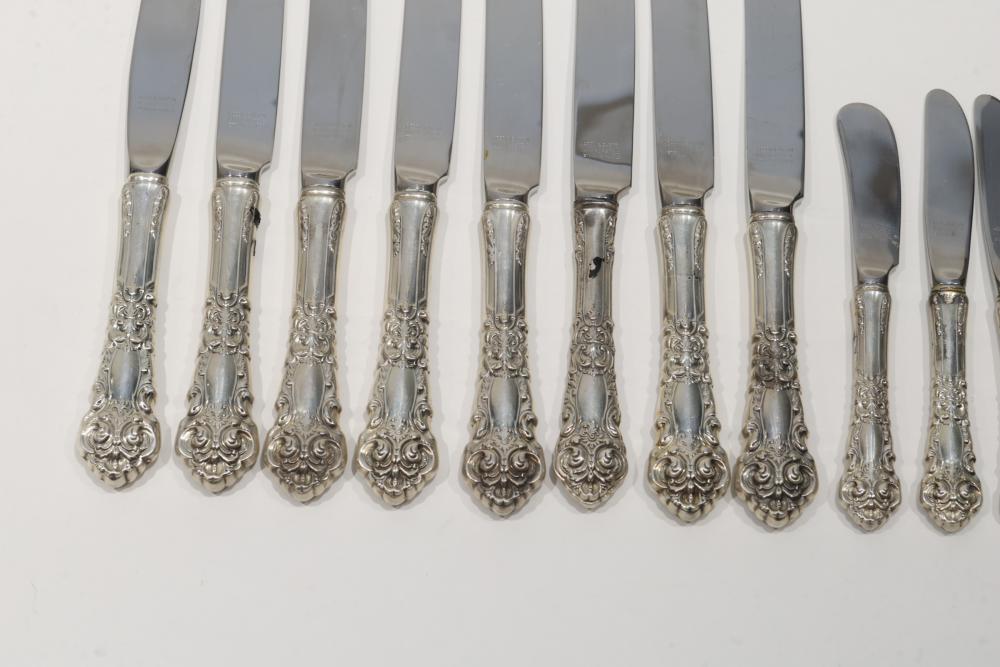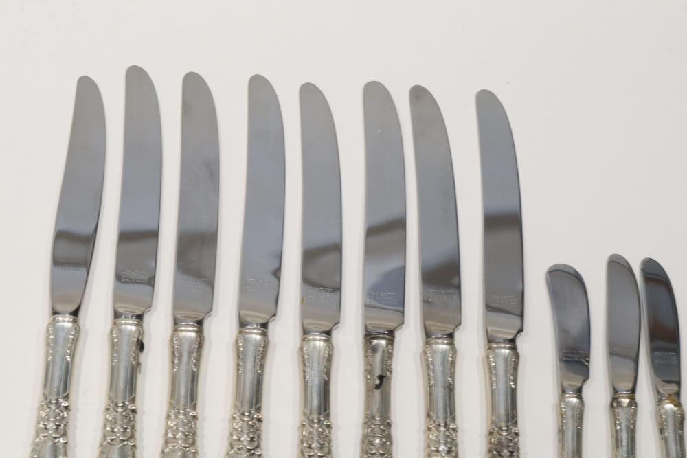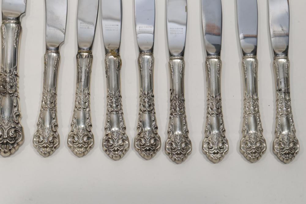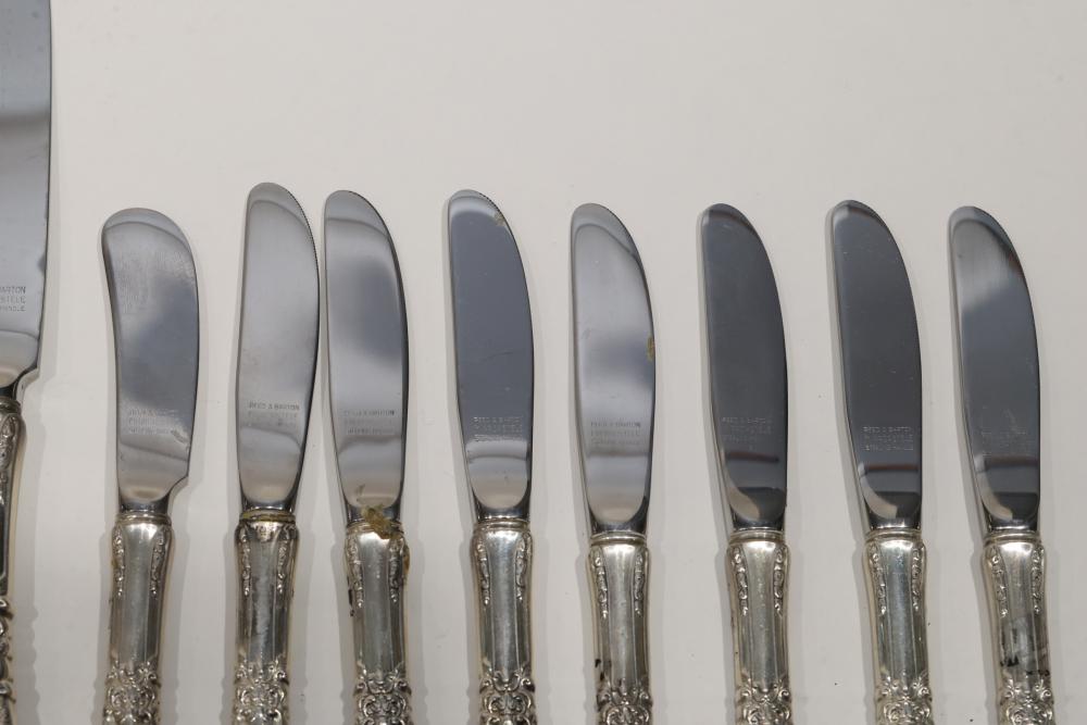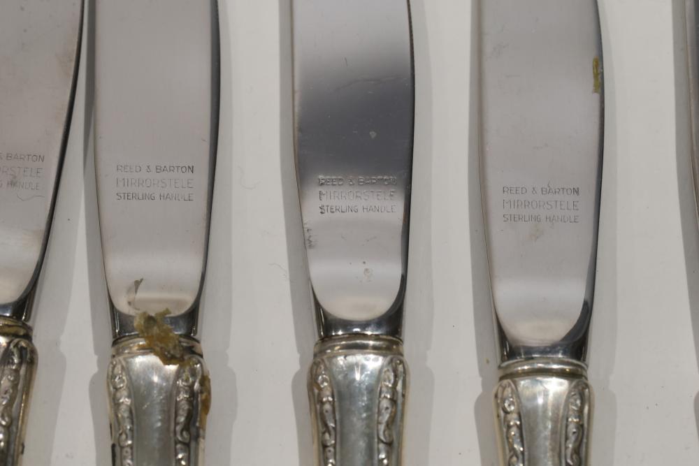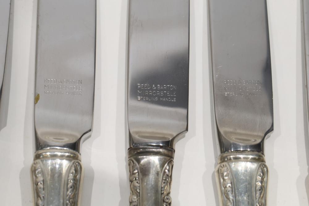 Reed & Barton Mirrosteel Sterling Knives and Butter Spreaders. Includes eight knives and eight butter spreaders, crafted with ornate sterling handles. Pieces are marked Reed & Barton Mirrostele Sterling Handle. Total weight being 1,045.