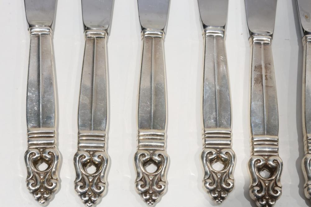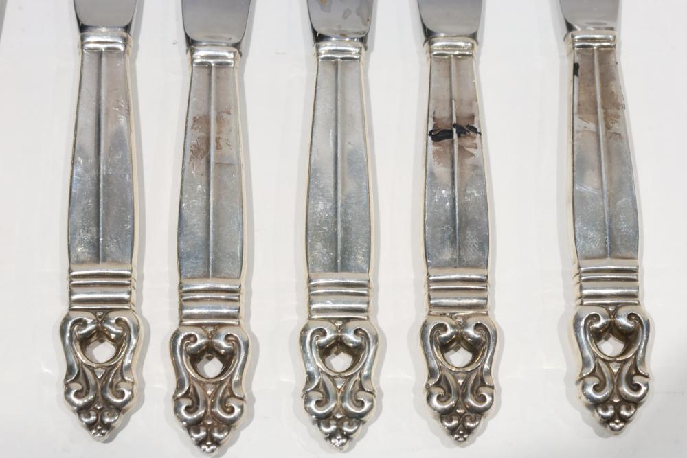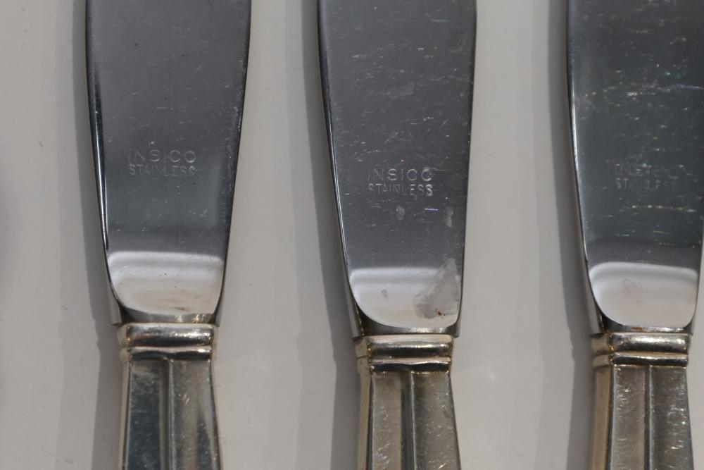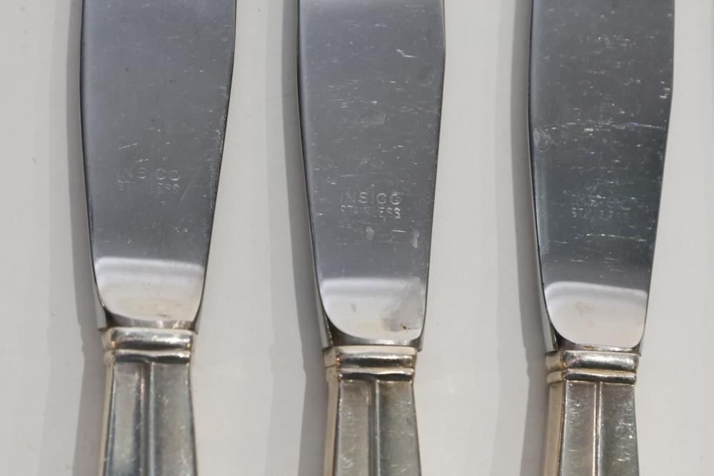 Eight Insico Sterling Handle Knives. Featuring a decorative handle with an engraved pattern and a stainless steel blade. Total weight being 553 grams.