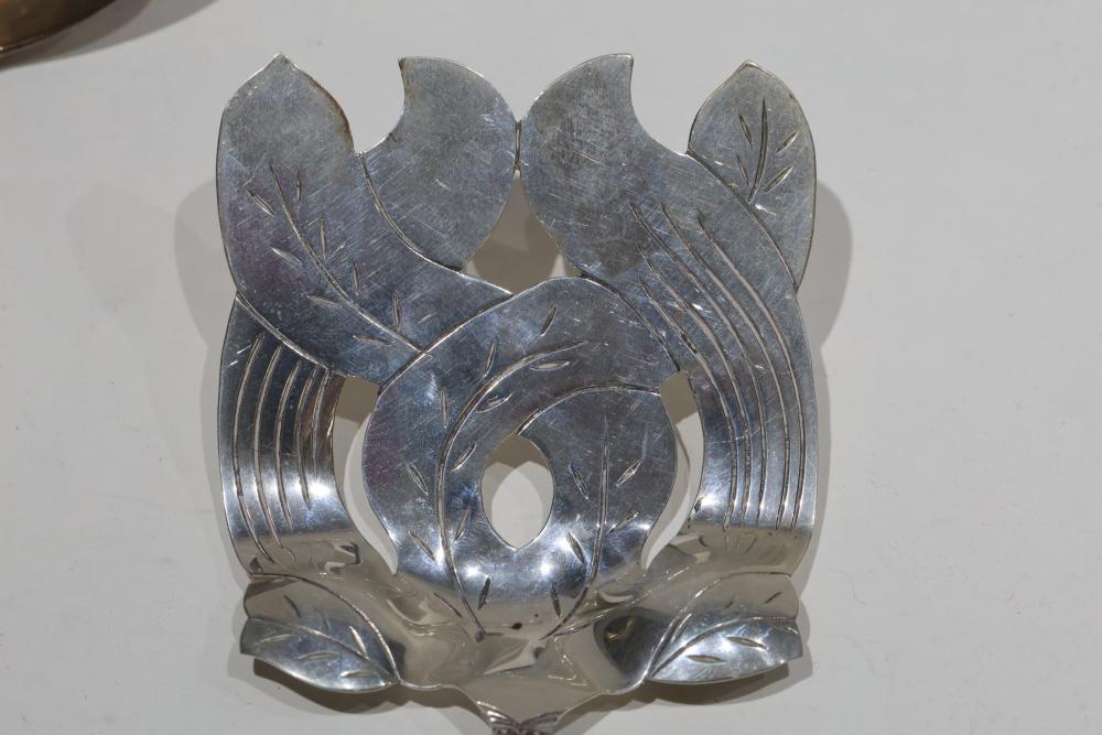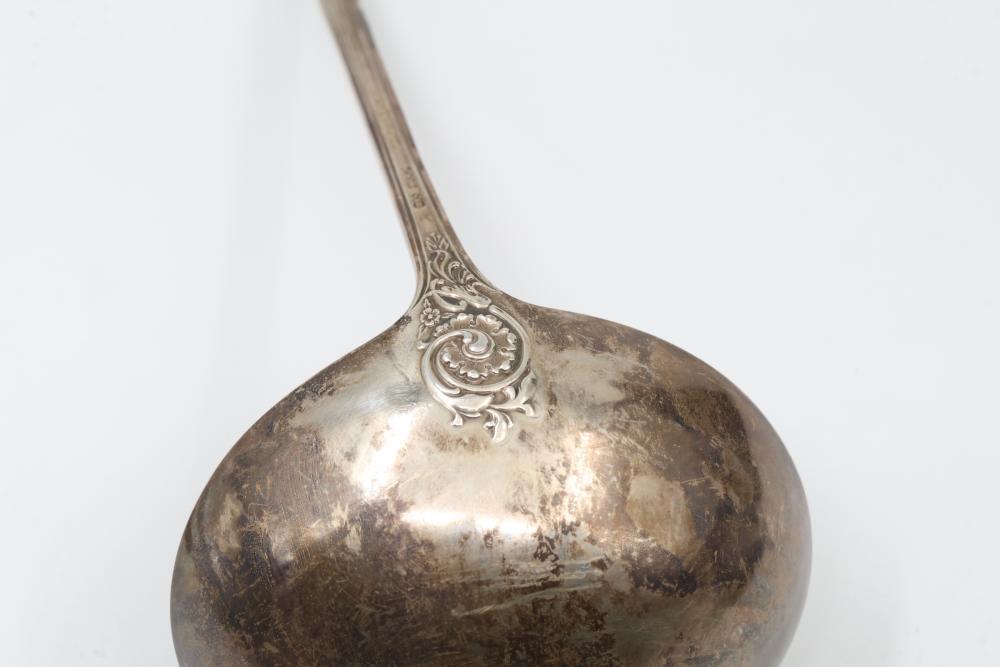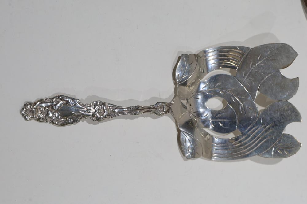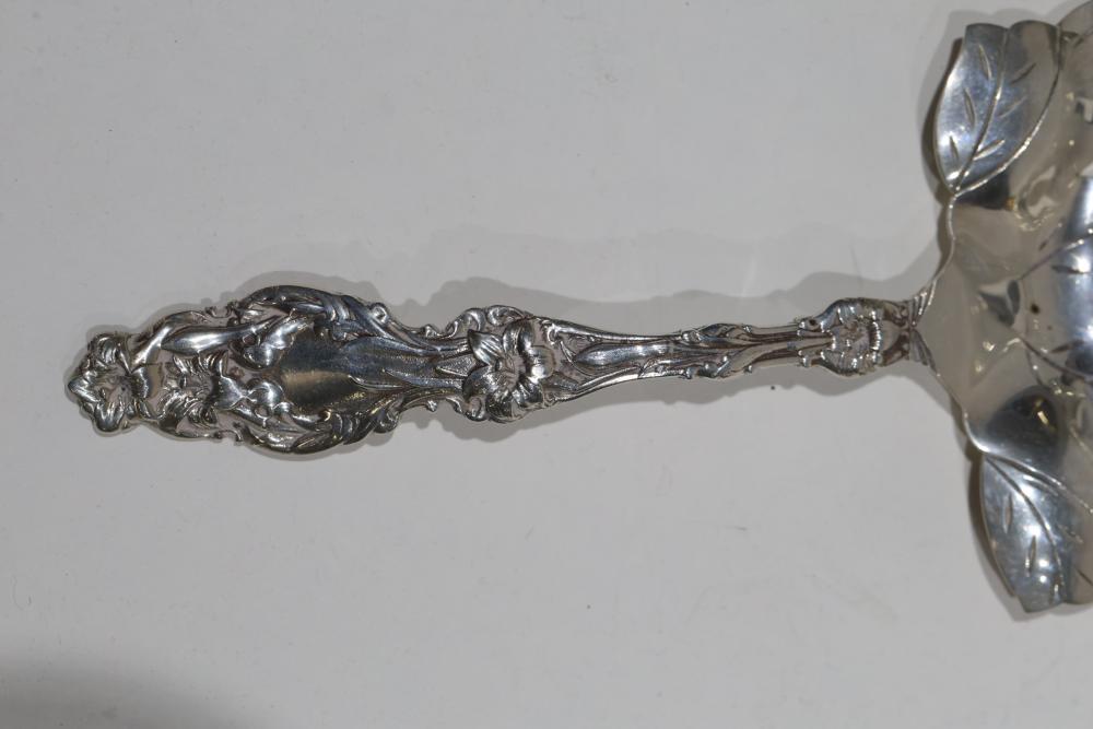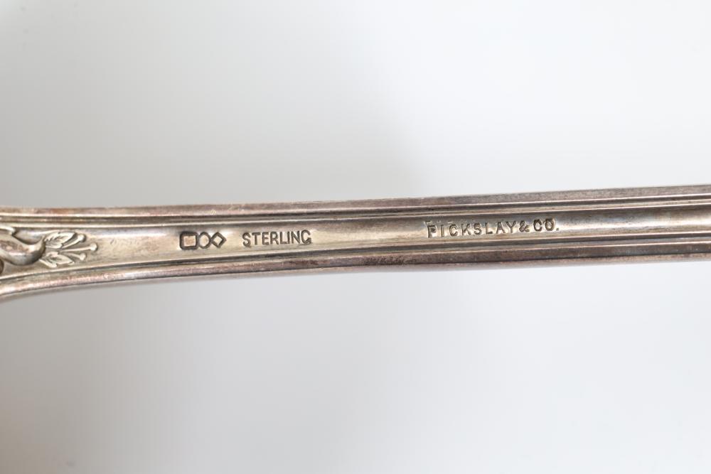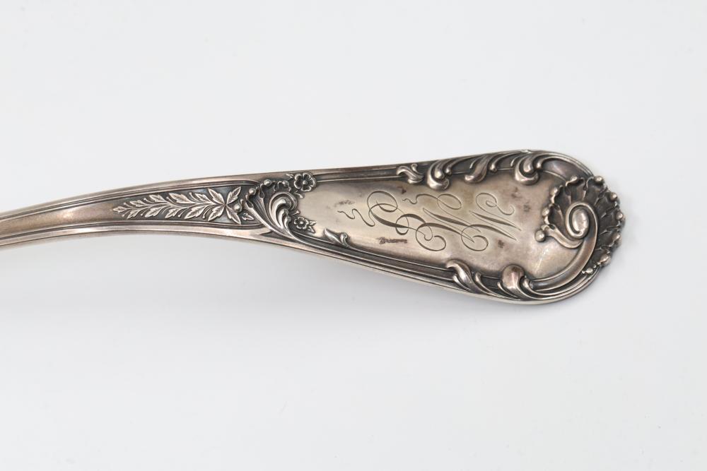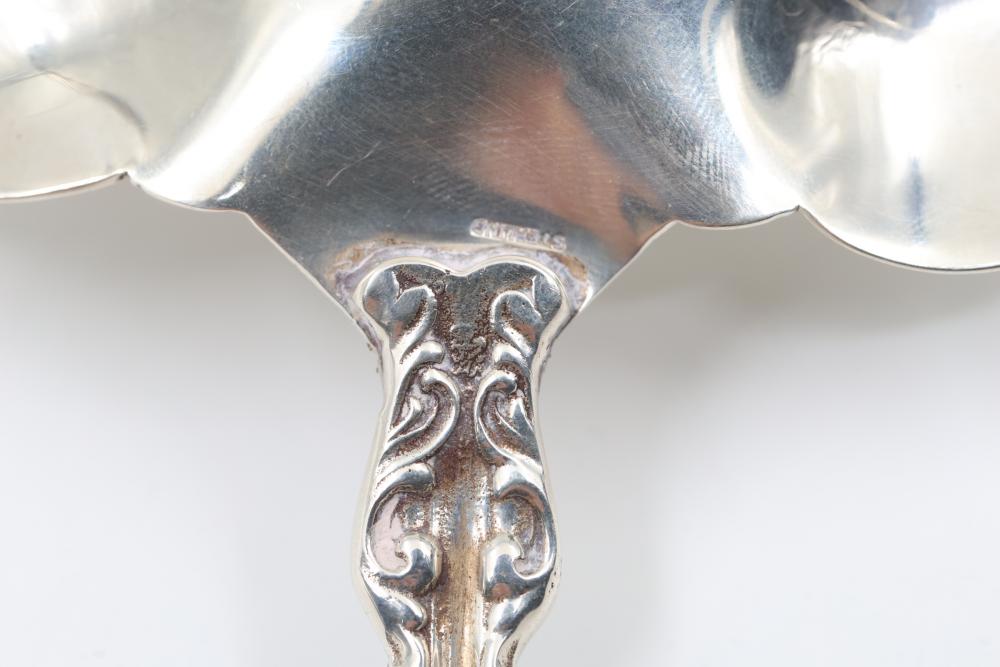 Two Sterling Silver Serving Utensils with Ornate Handles. Includes a large ladle with decorative floral engravings on the handle, marked "Sterling" and "Pickslay & Co.", and a pierced server with botanical motifs and an intricately detailed handle. Total weight being 398 grams.