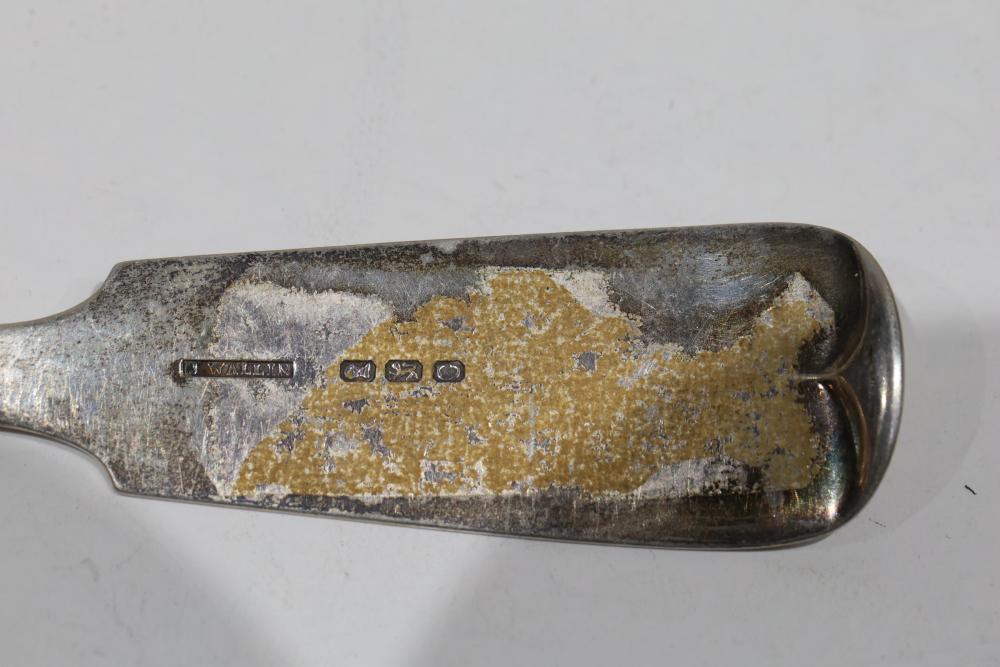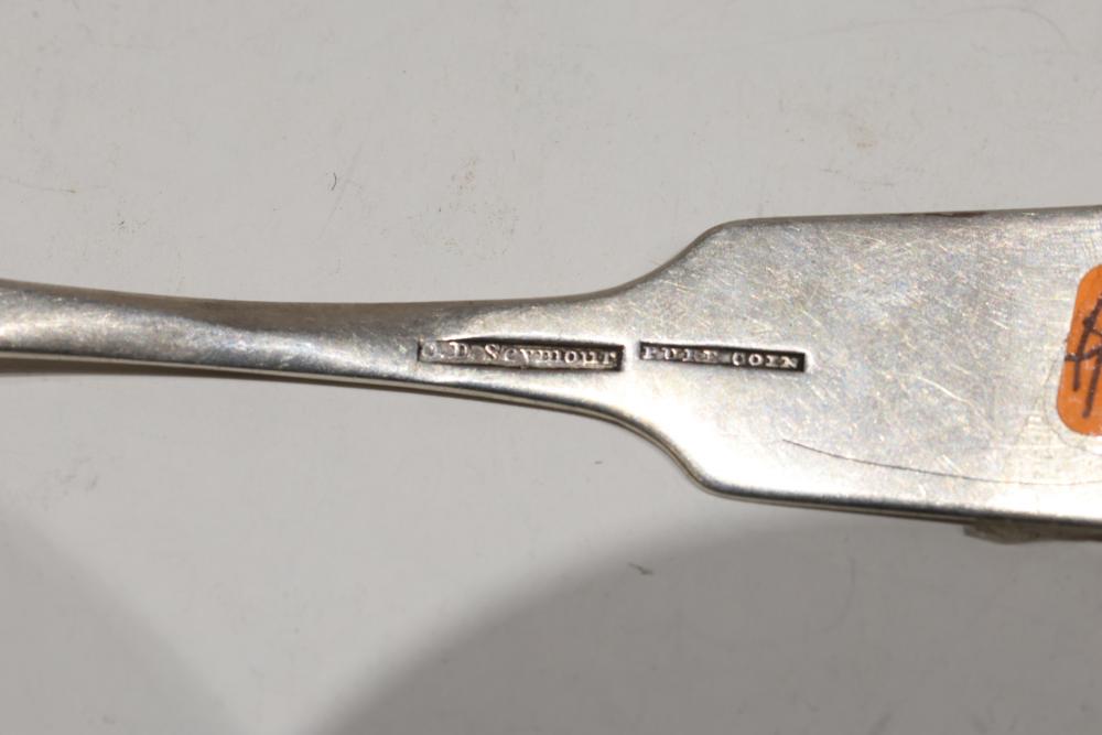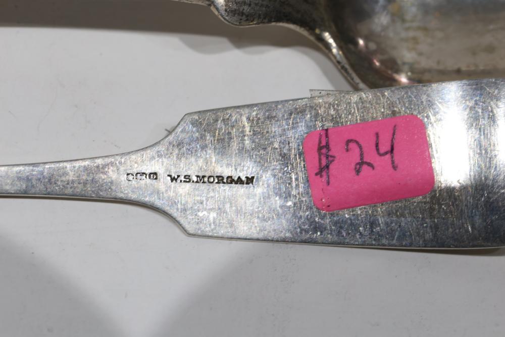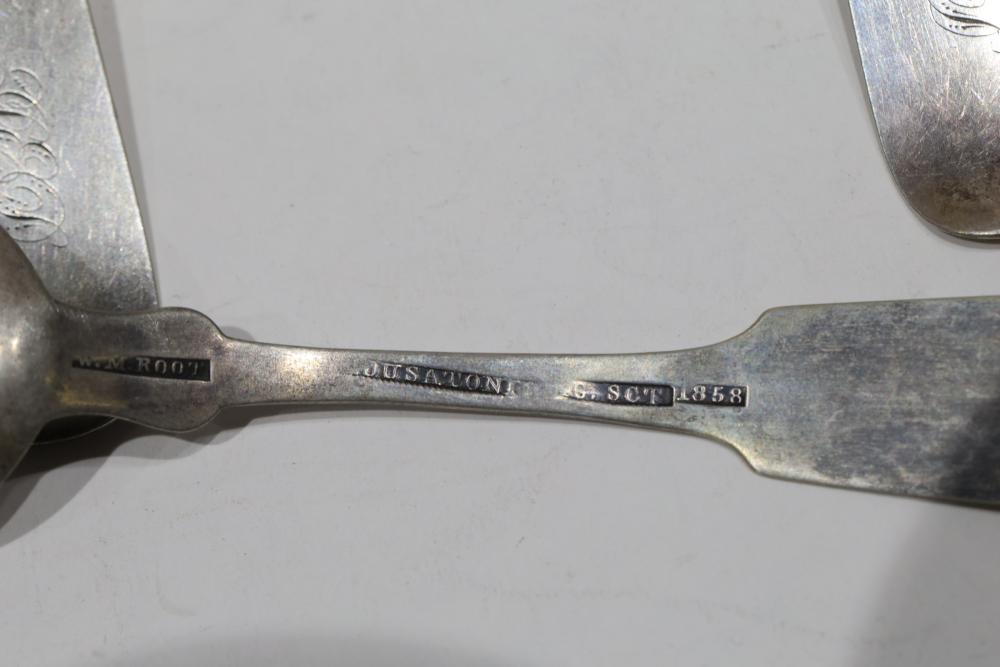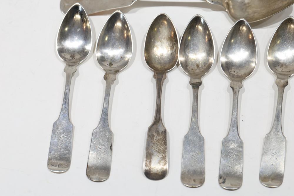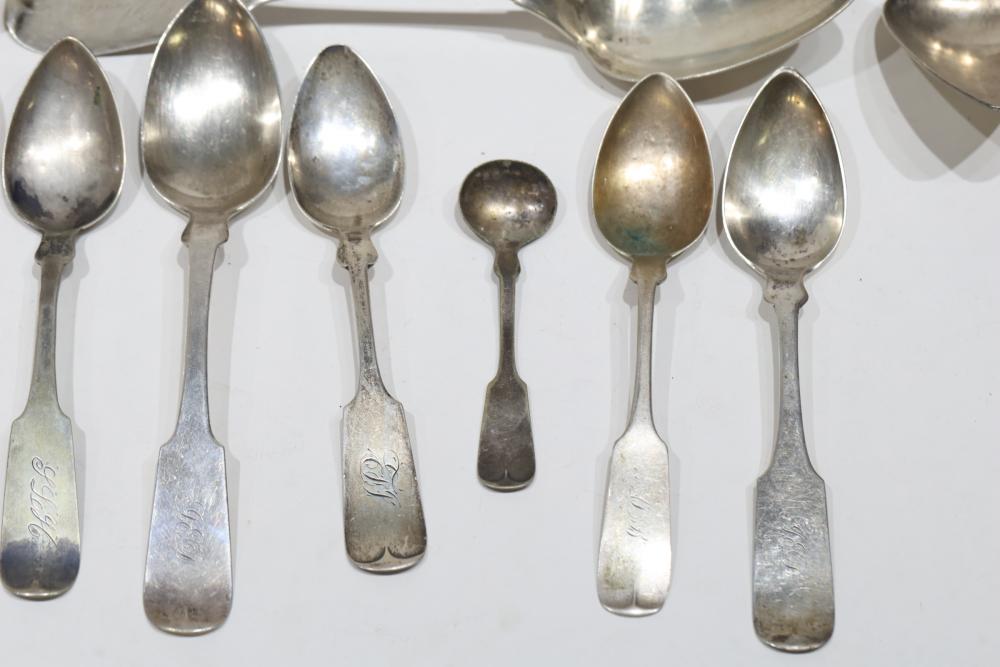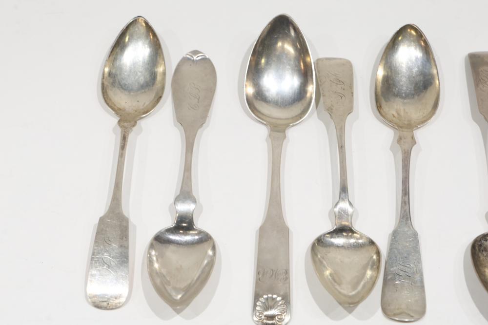 Coin Silver Flatware Pieces. Includes spoons of various sizes and designs, with engraved monograms and hallmarks. Notable makers include C.S. Ball, McCarty & Hurlbert, and P.P. Hayes. A variety of ornate patterns and inscriptions are visible on the handles. Total weight being 1,081 grams.