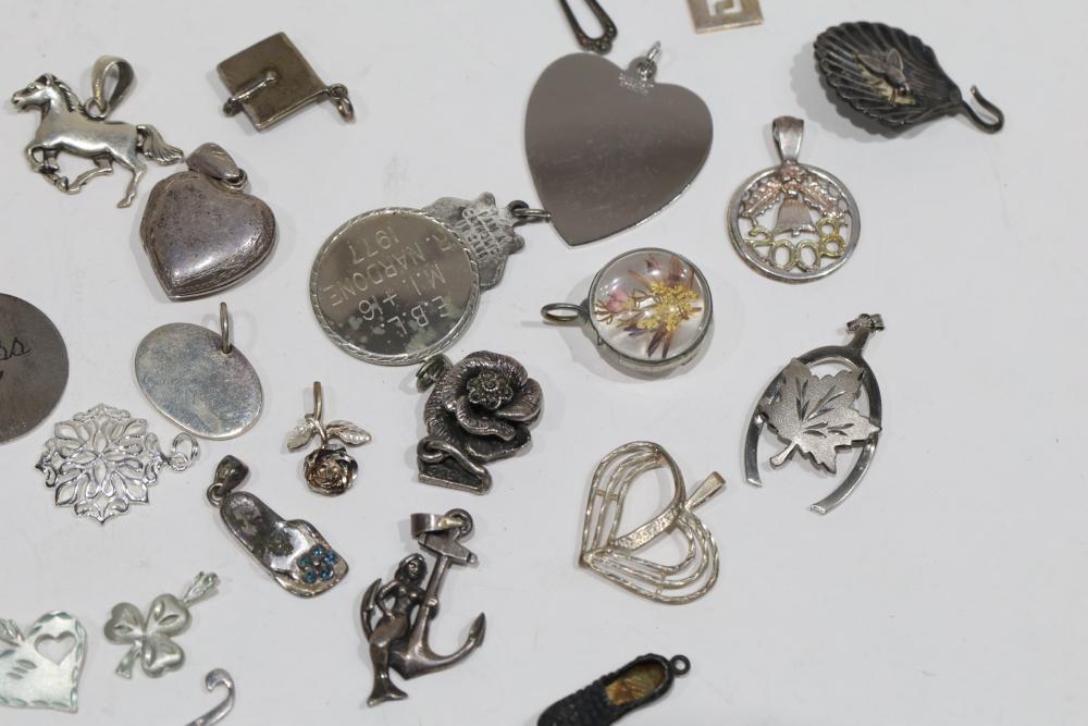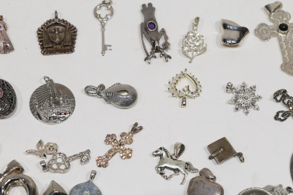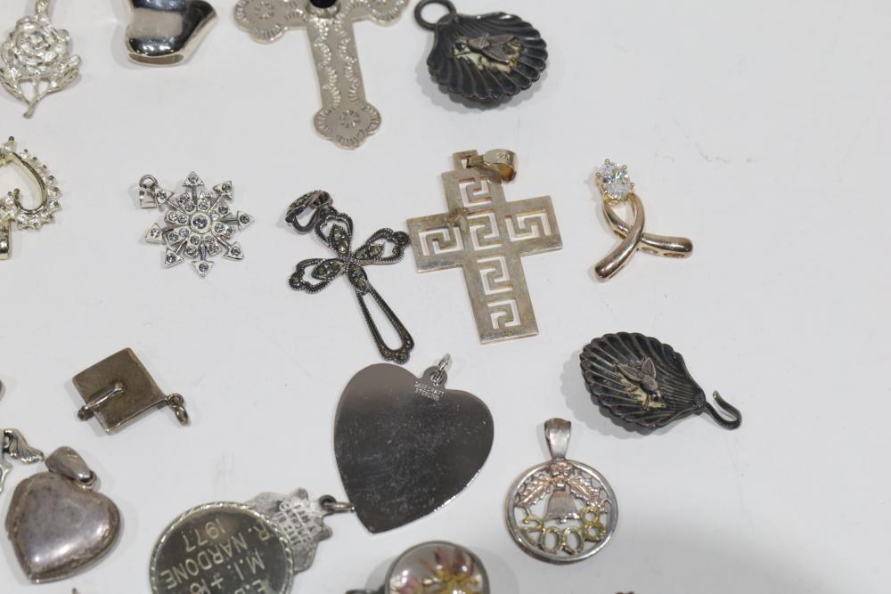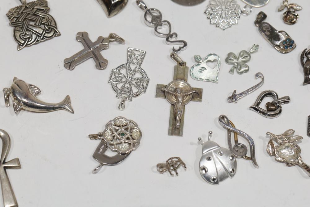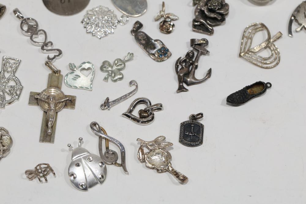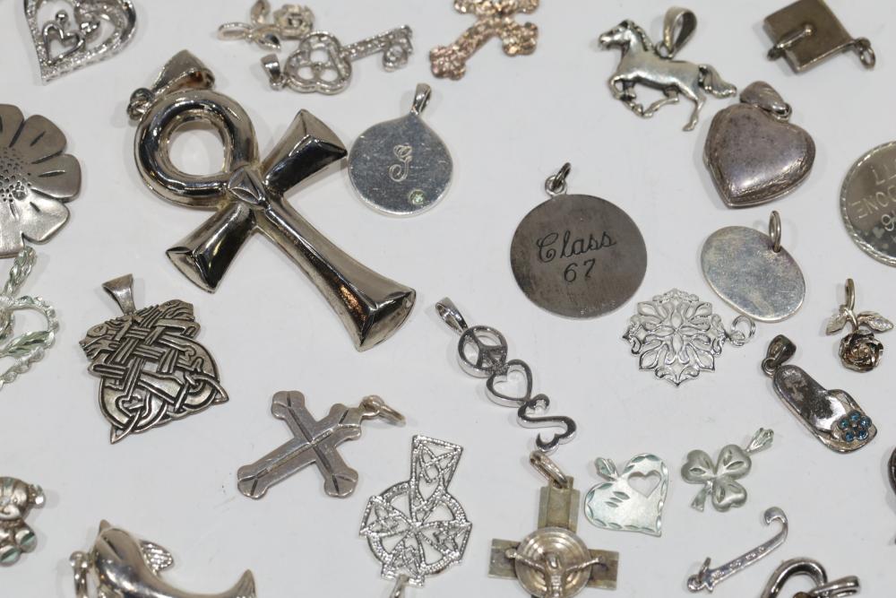 Sterling Silver Charms and Pendants. Includes various designs, such as crosses, hearts, animals, and engraved pieces, with some marked 925 and sterling. Total weight being 283 grams.