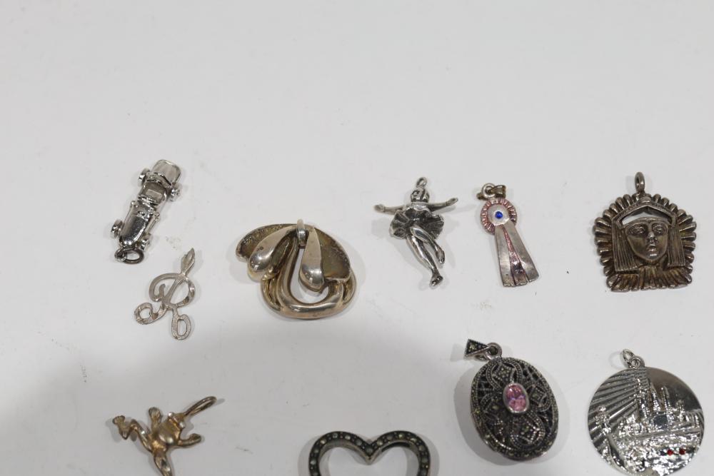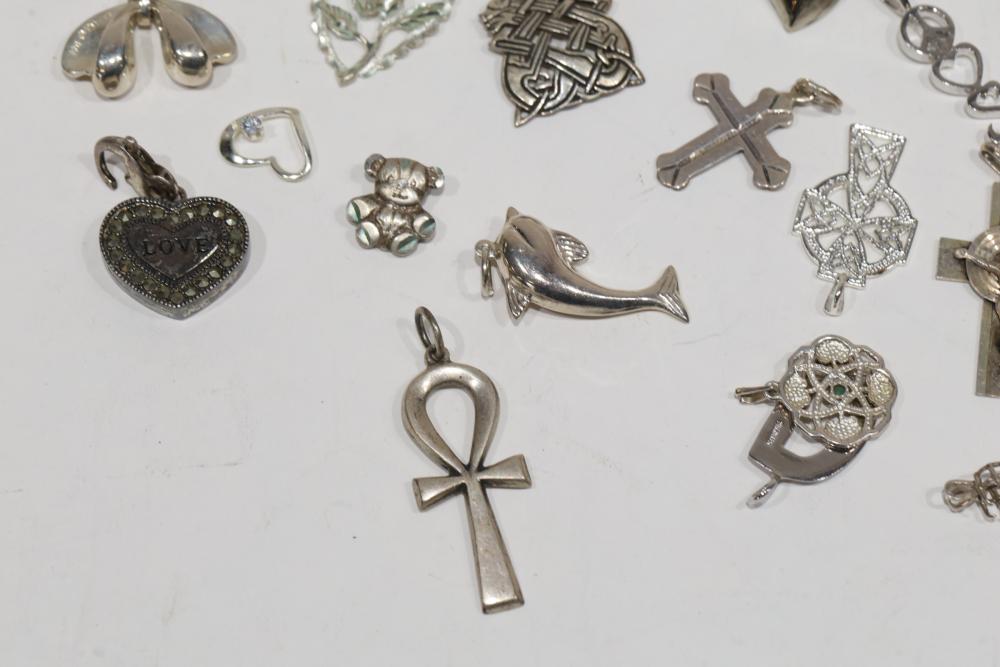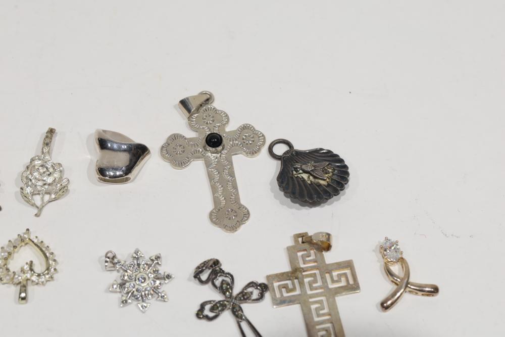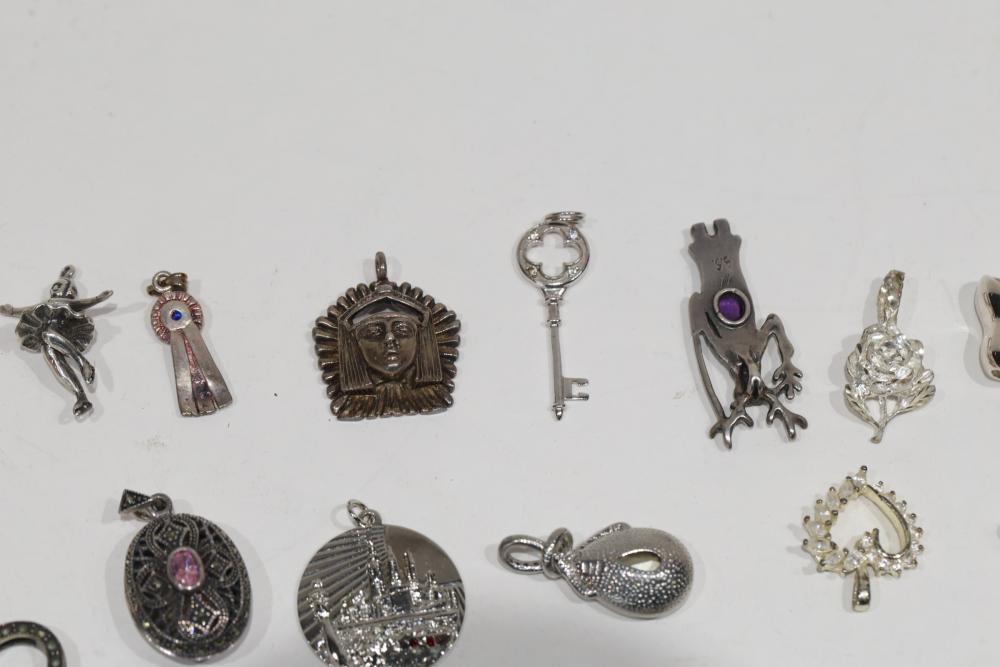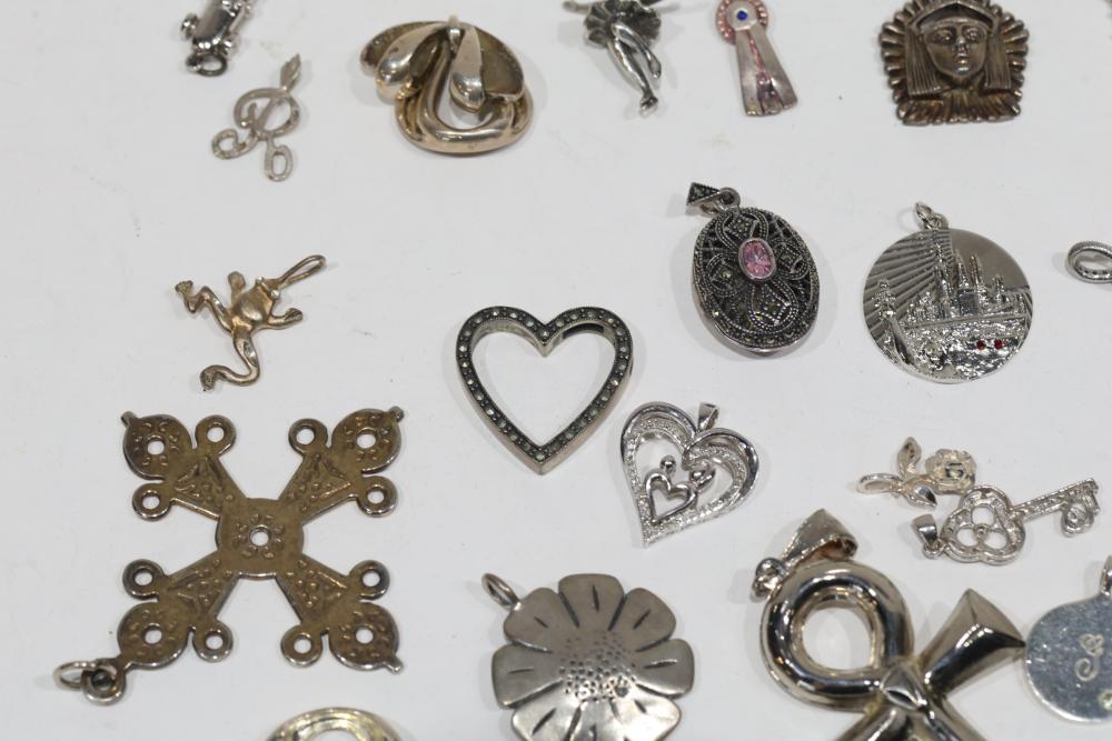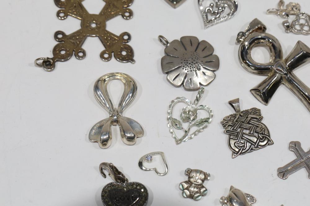 Sterling Silver Charms and Pendants. Includes various designs, such as crosses, hearts, animals, and engraved pieces, with some marked 925 and sterling. Total weight being 283 grams.
