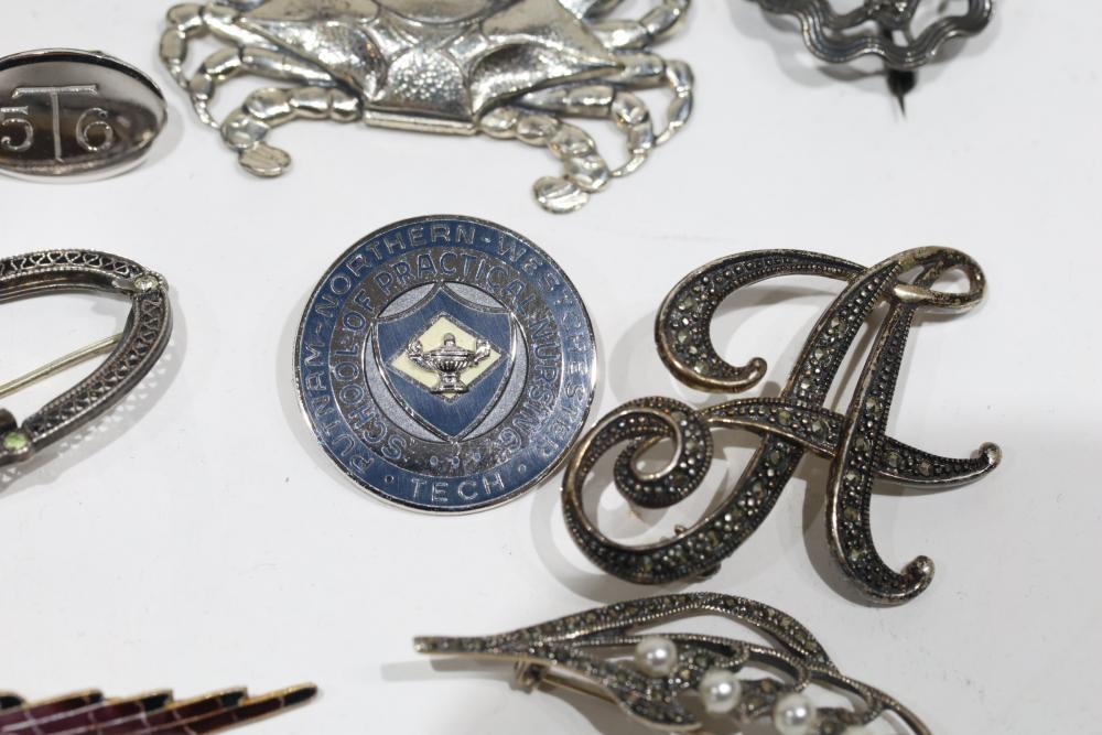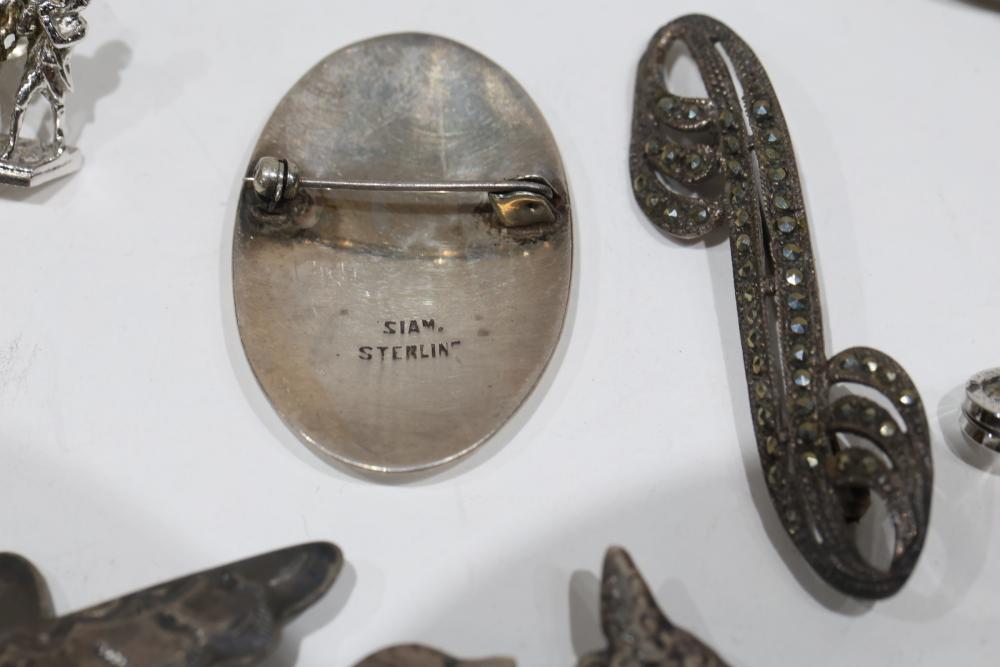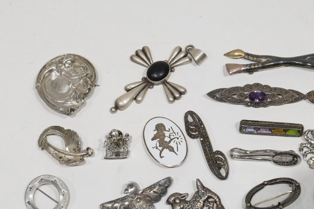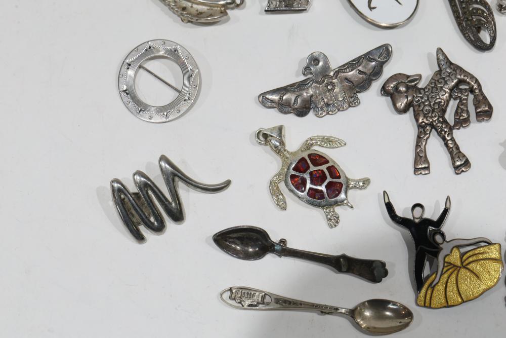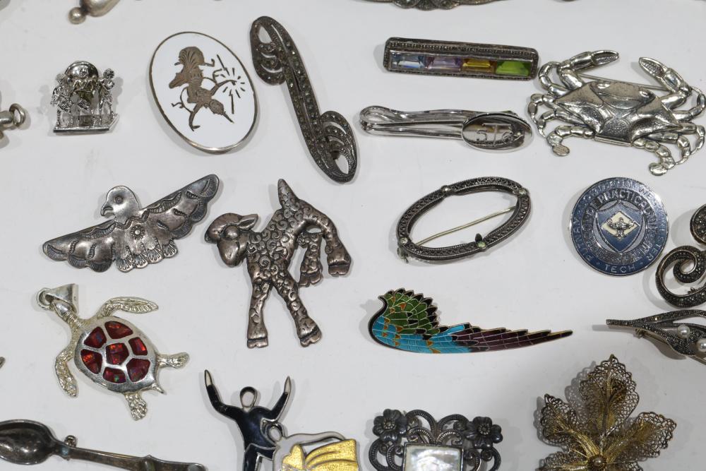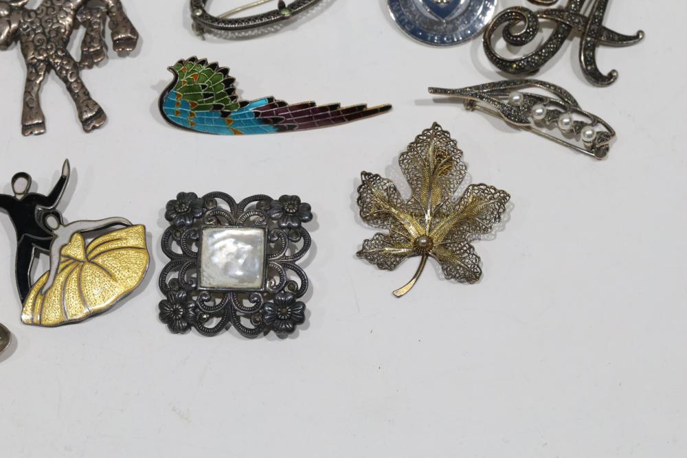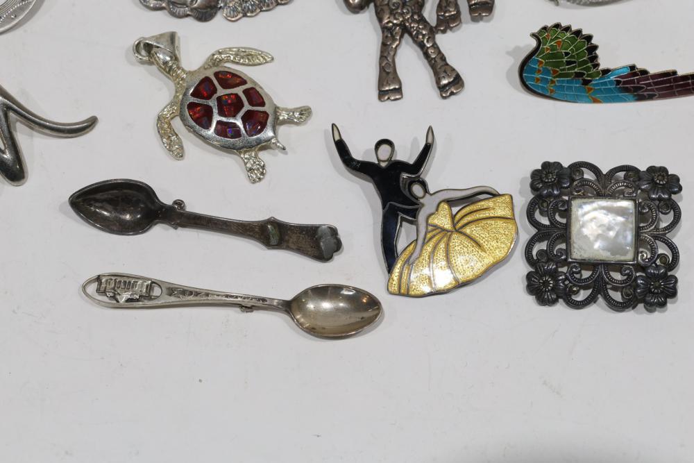 Sterling Silver Jewelry, Brooches, and Decorative Items. Includes various silver and enamel pins, brooches shaped as animals, and decorative spoons, with several stamped 925 or Sterling. Items range in styles and designs, incorporating elements like filigree and enamel. Total weight being 218 grams.