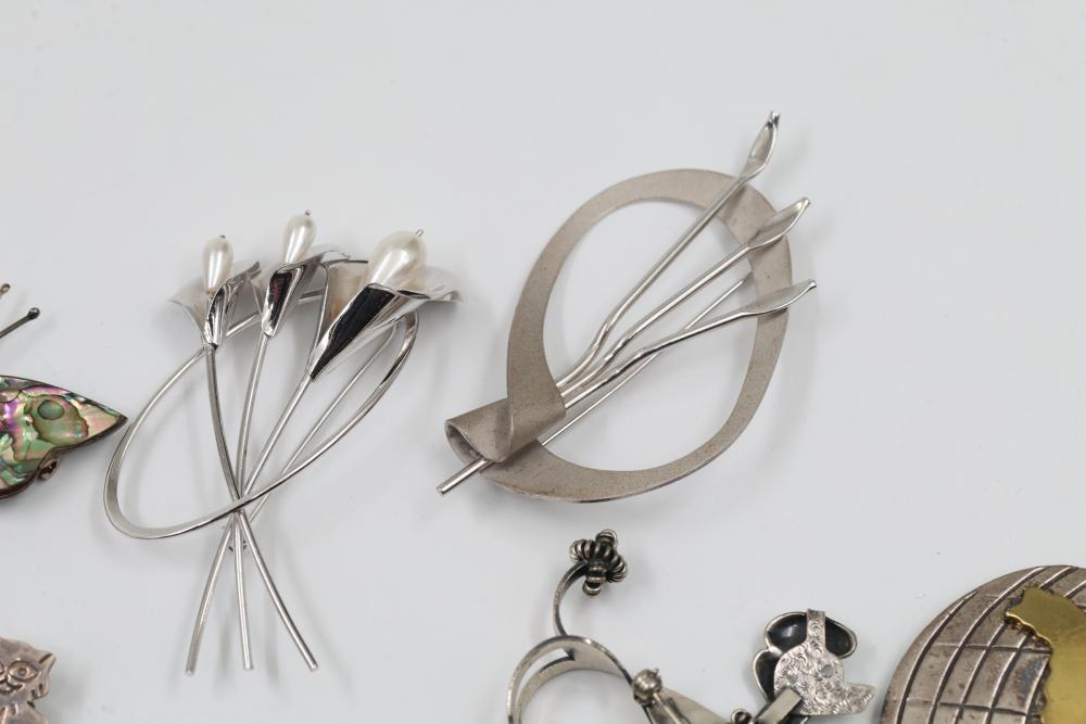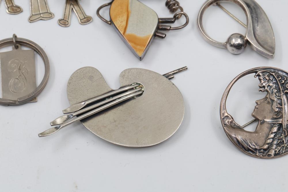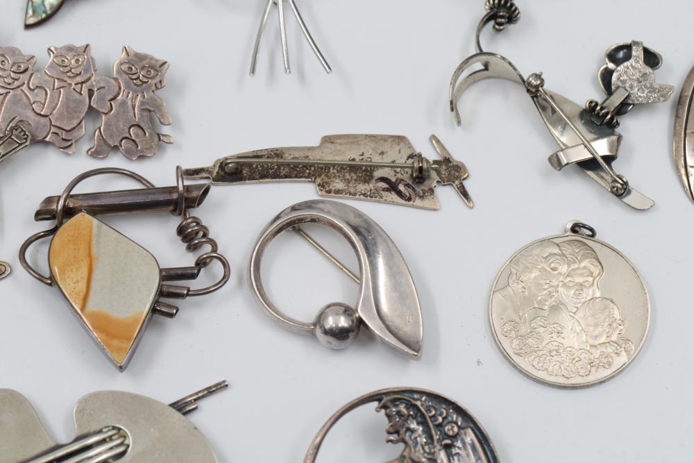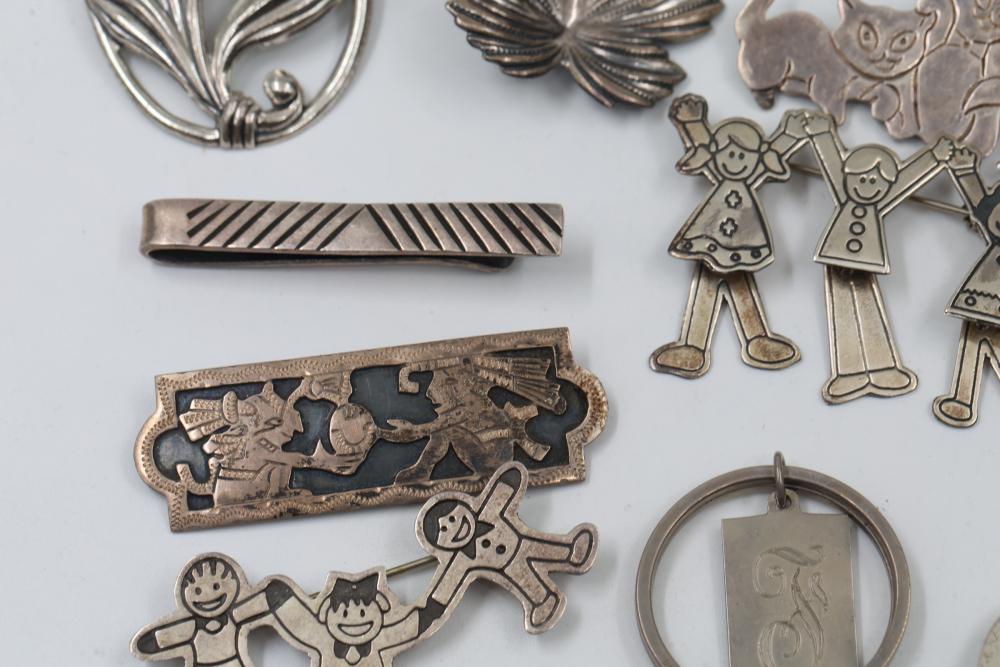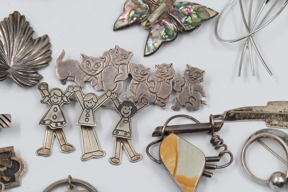 Sterling Silver Jewelry and Accessories including brooches, pendants, keychains, and pins. Pieces feature various designs, including floral, butterfly, abstract patterns, and engraved motifs. Some items are stamped with sterling or 925 marks. Total weight being 213 grams total.