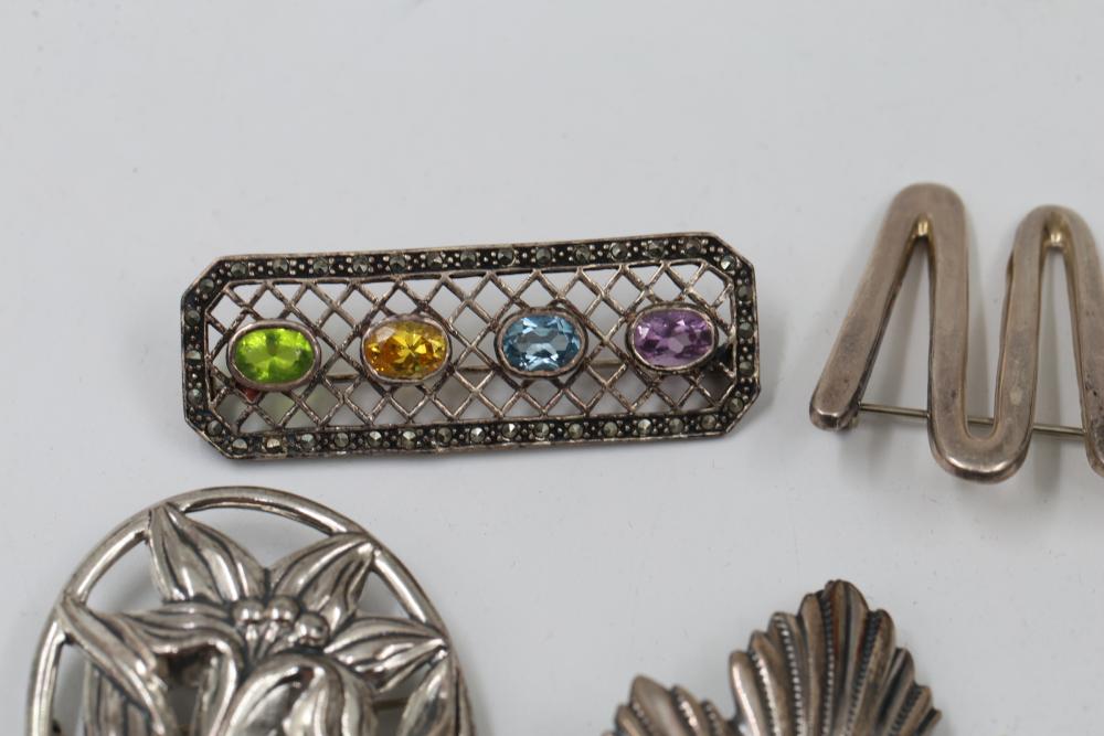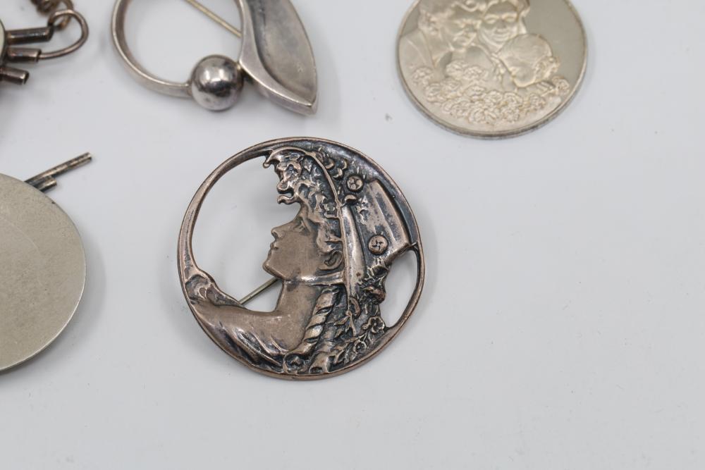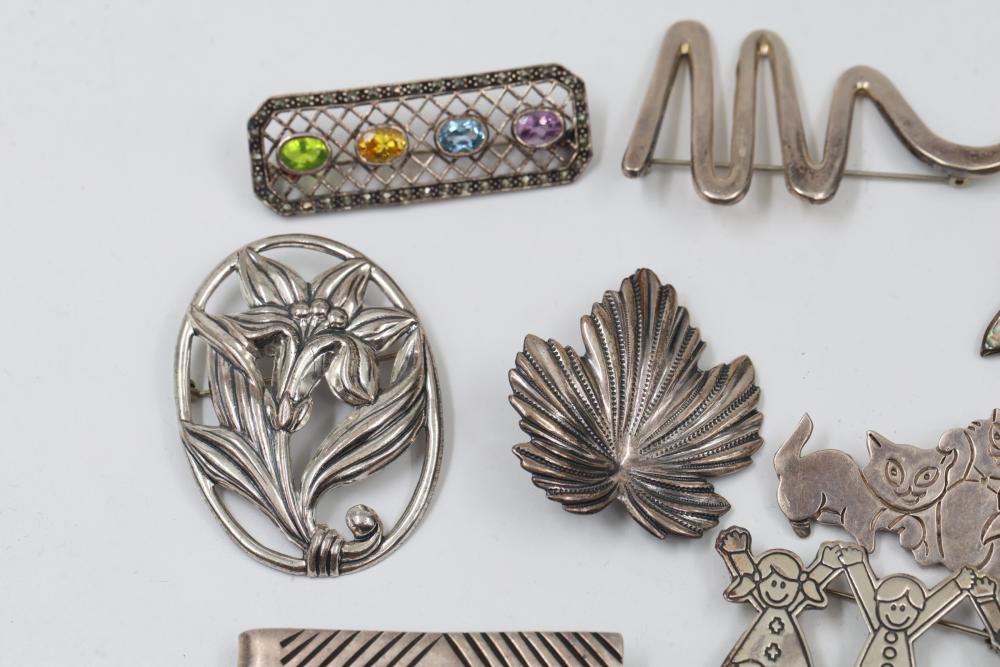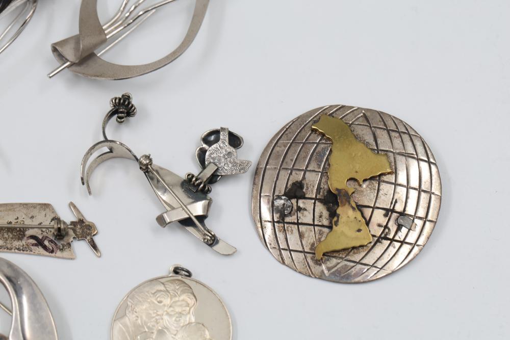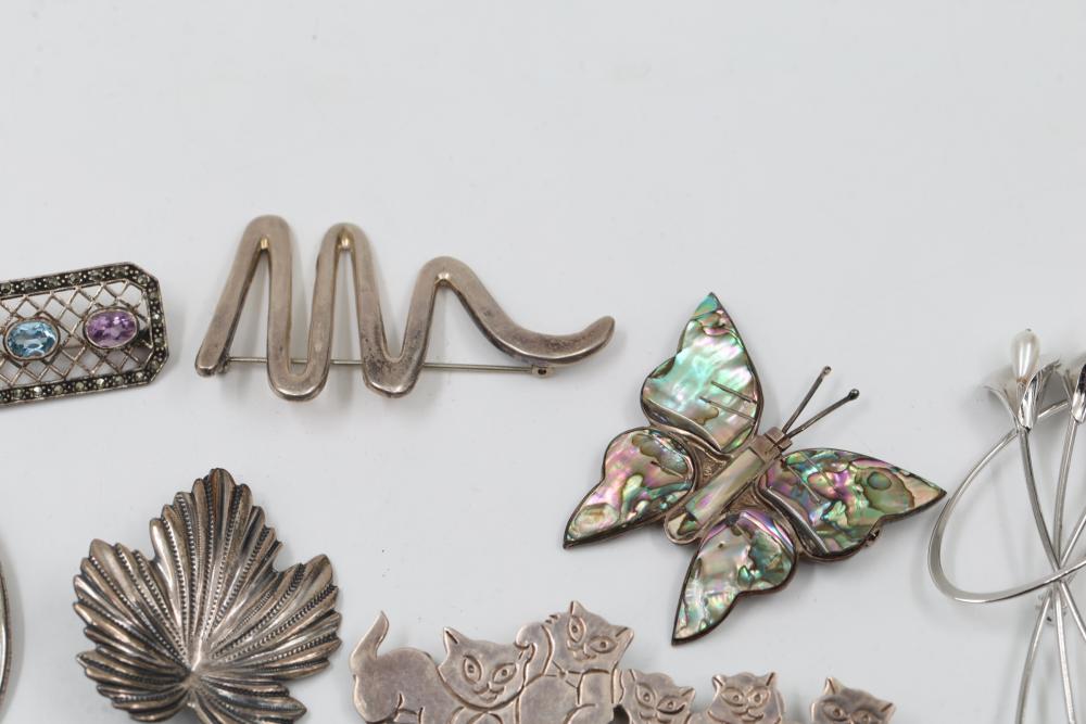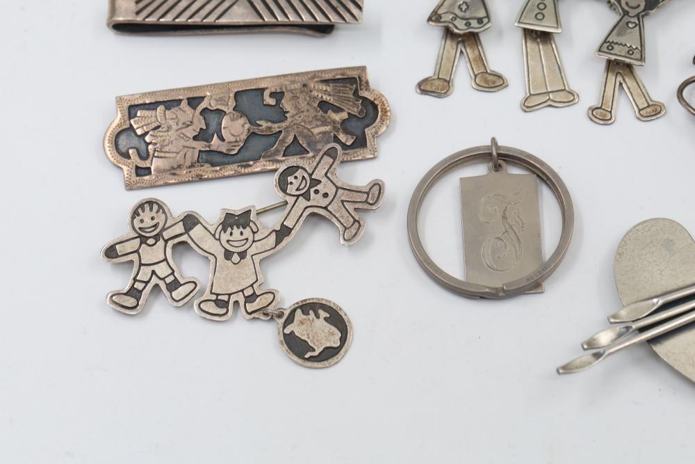 Sterling Silver Jewelry and Accessories including brooches, pendants, keychains, and pins. Pieces feature various designs, including floral, butterfly, abstract patterns, and engraved motifs. Some items are stamped with sterling or 925 marks. Total weight being 213 grams total.