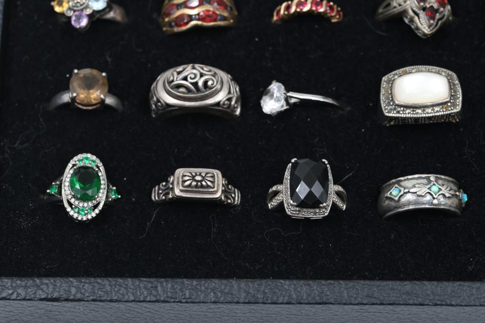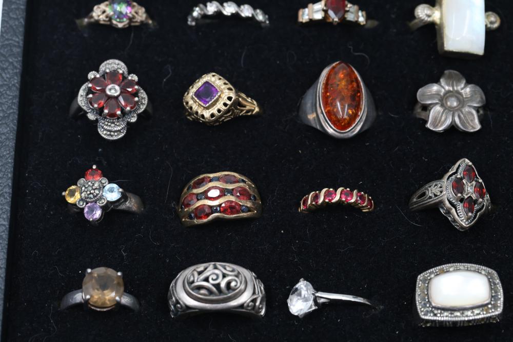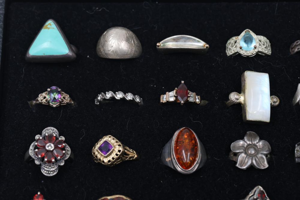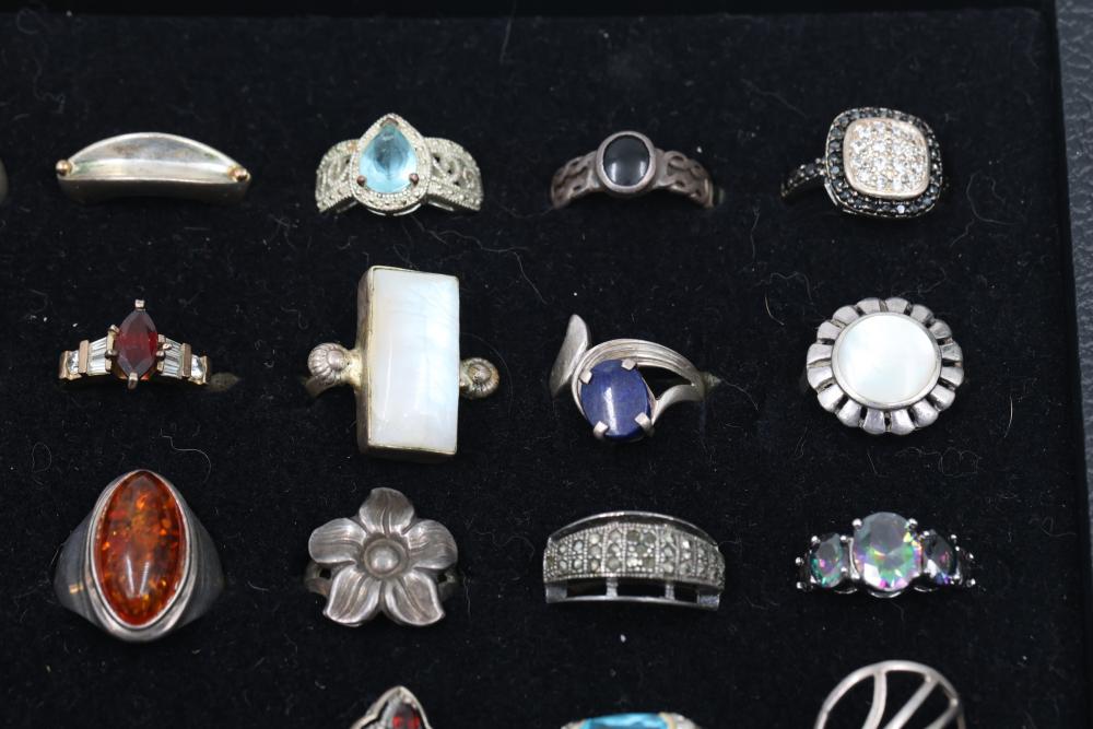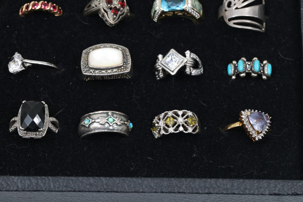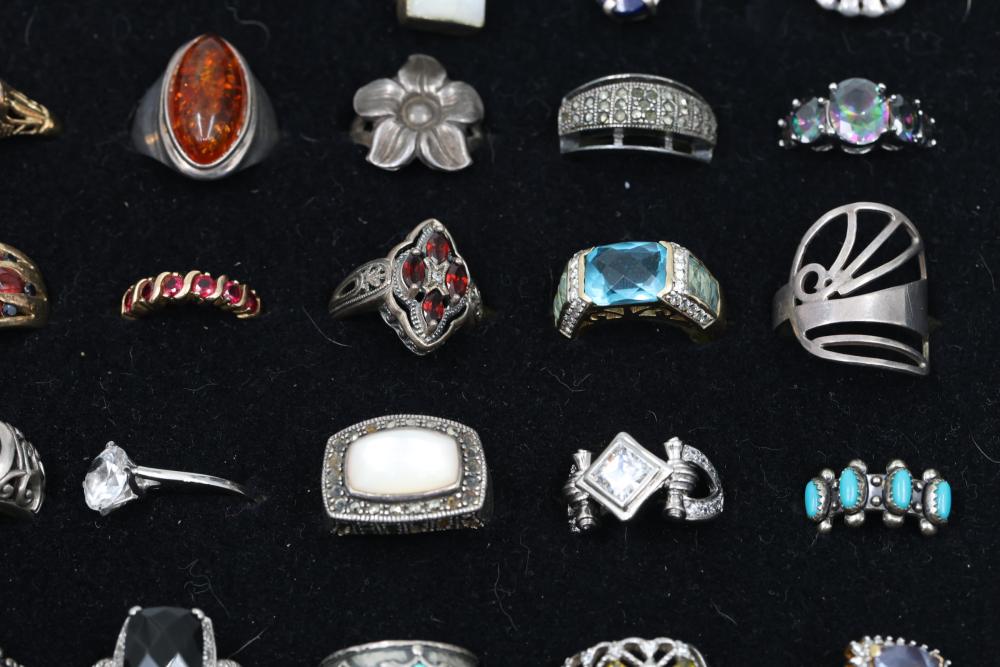 Sterling Silver Rings With Gemstone Accents. Includes a variety of styles and designs, some featuring Diamonds, other precious stones and detailed craftsmanship. Several rings are marked 925 or sterling silver. The set displays a range of shapes and decorative patterns. Total weight being 192 grams.