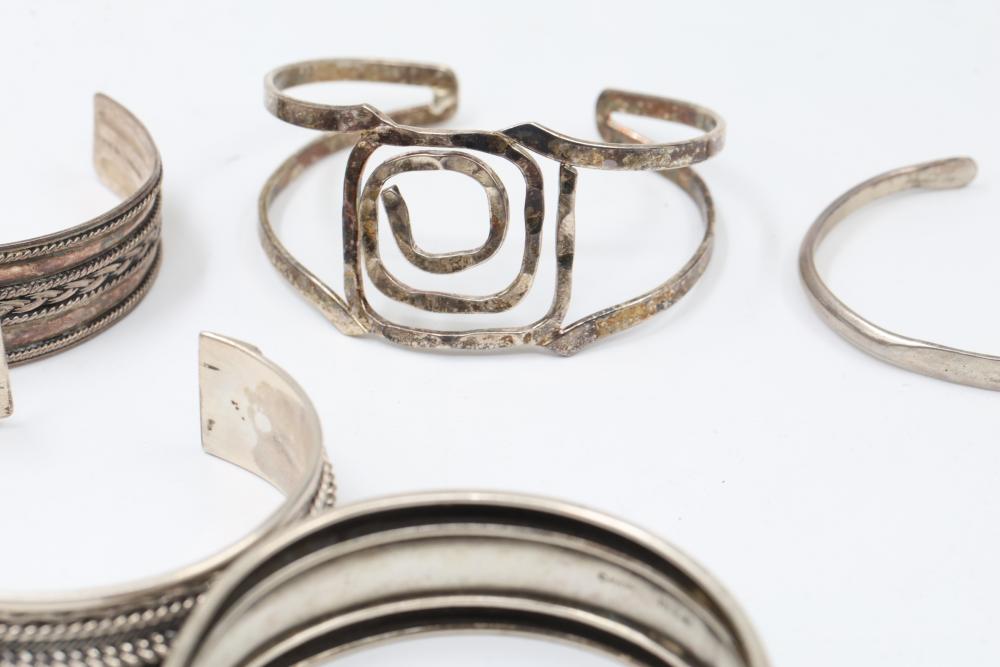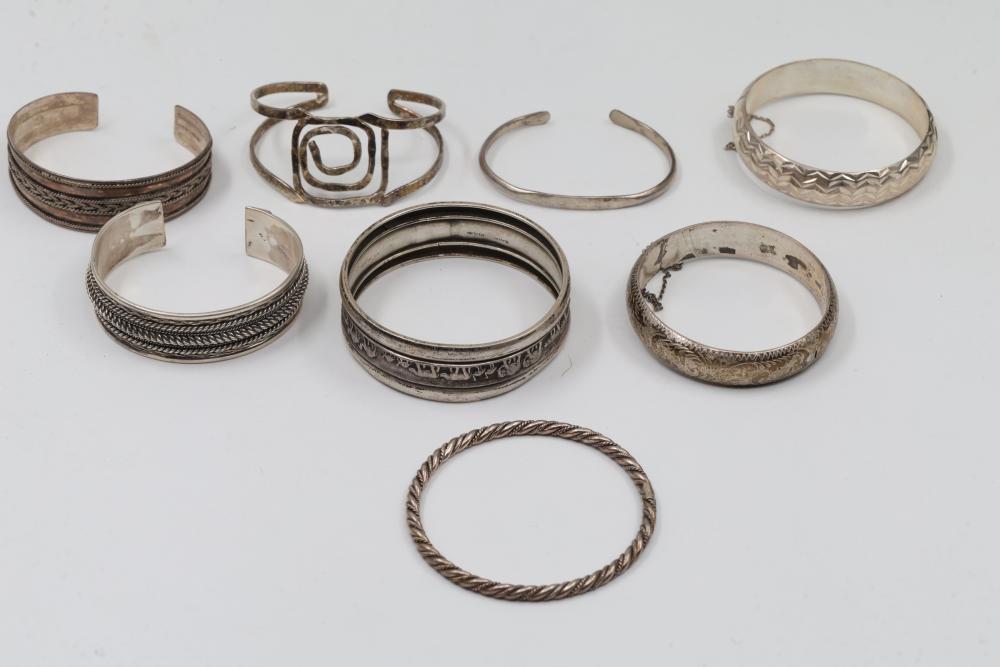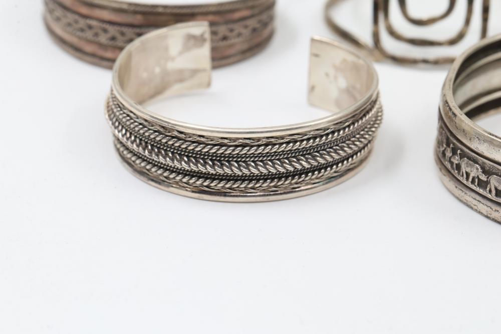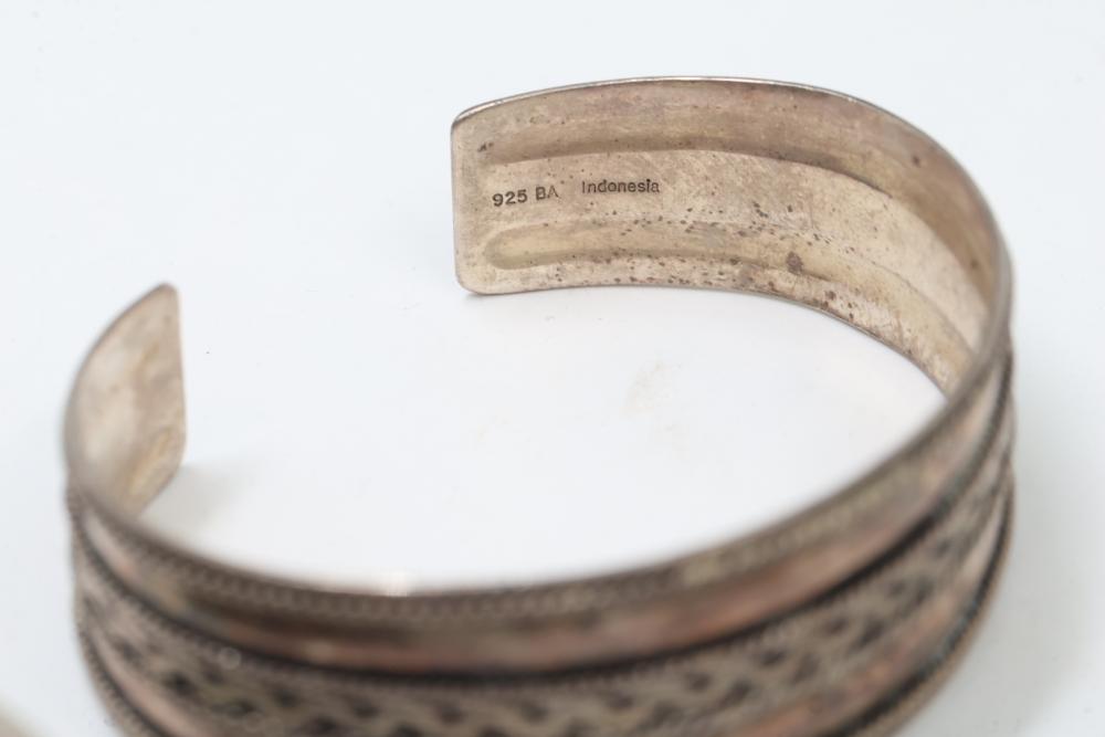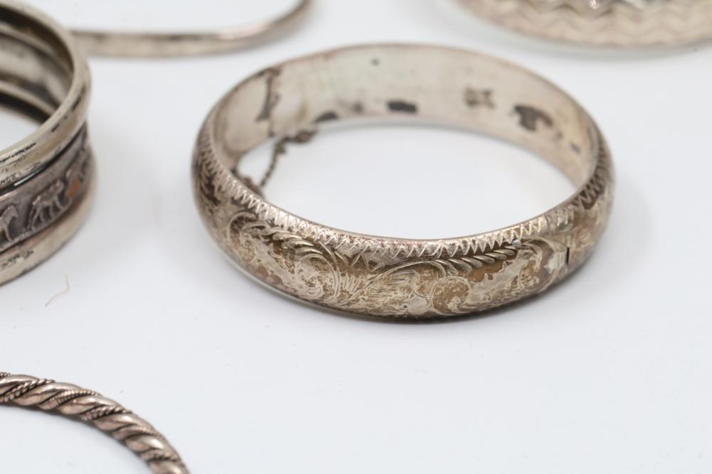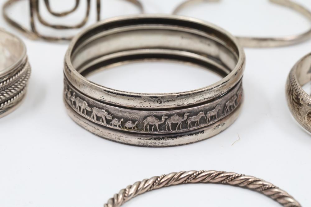 Sterling Silver Bracelets with Various Designs. Includes multiple .925 sterling silver bangles and cuffs featuring varied patterns and textures such as rope-like twists, engraved details, and animal motifs. Some pieces display visible markings of sterling silver or .925. Total weight being 205 grams.