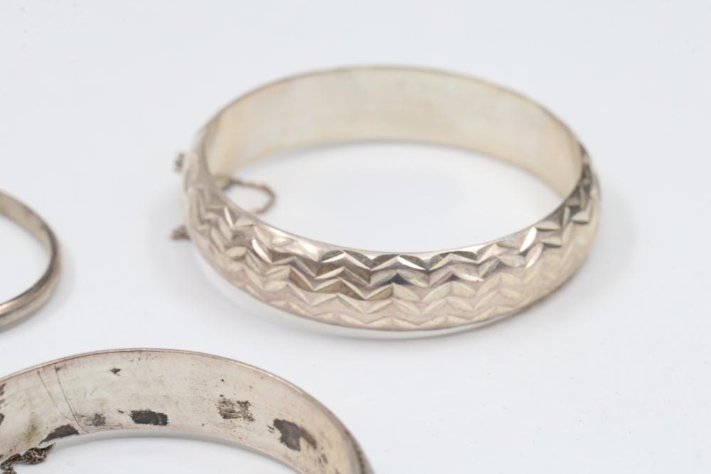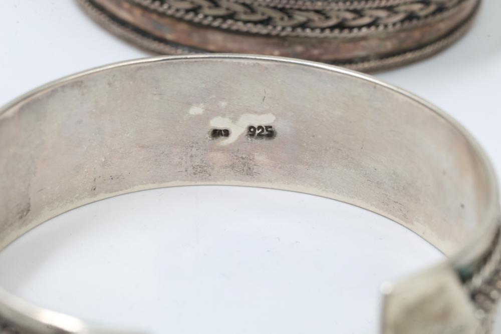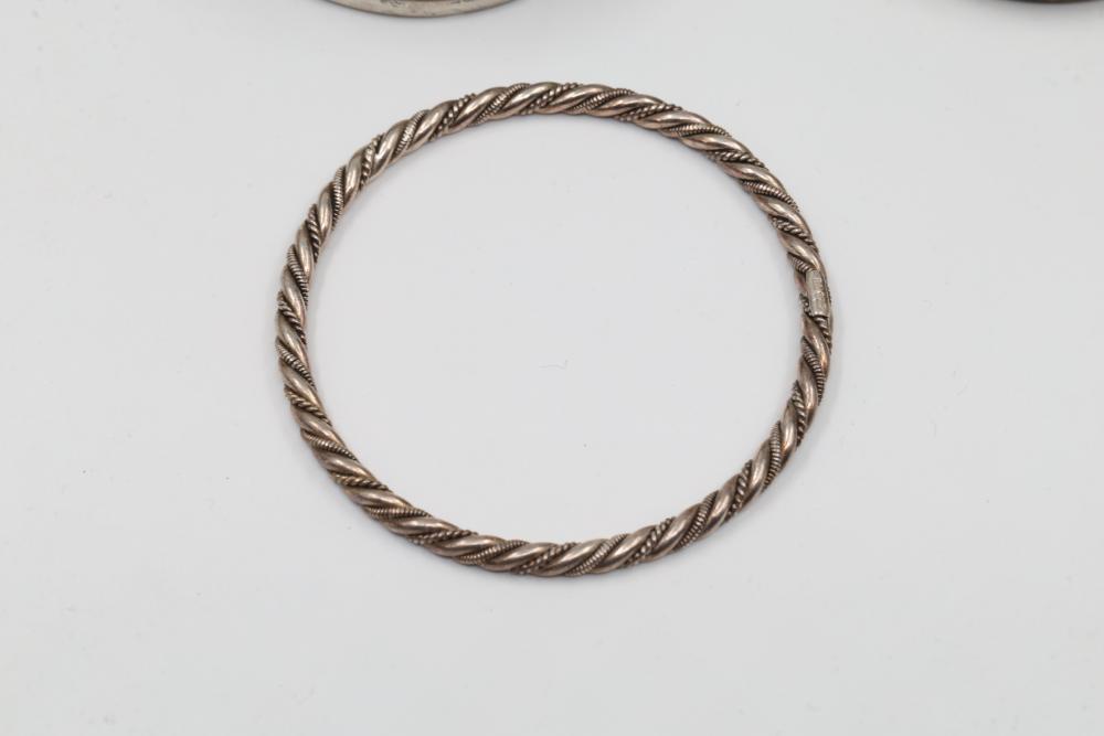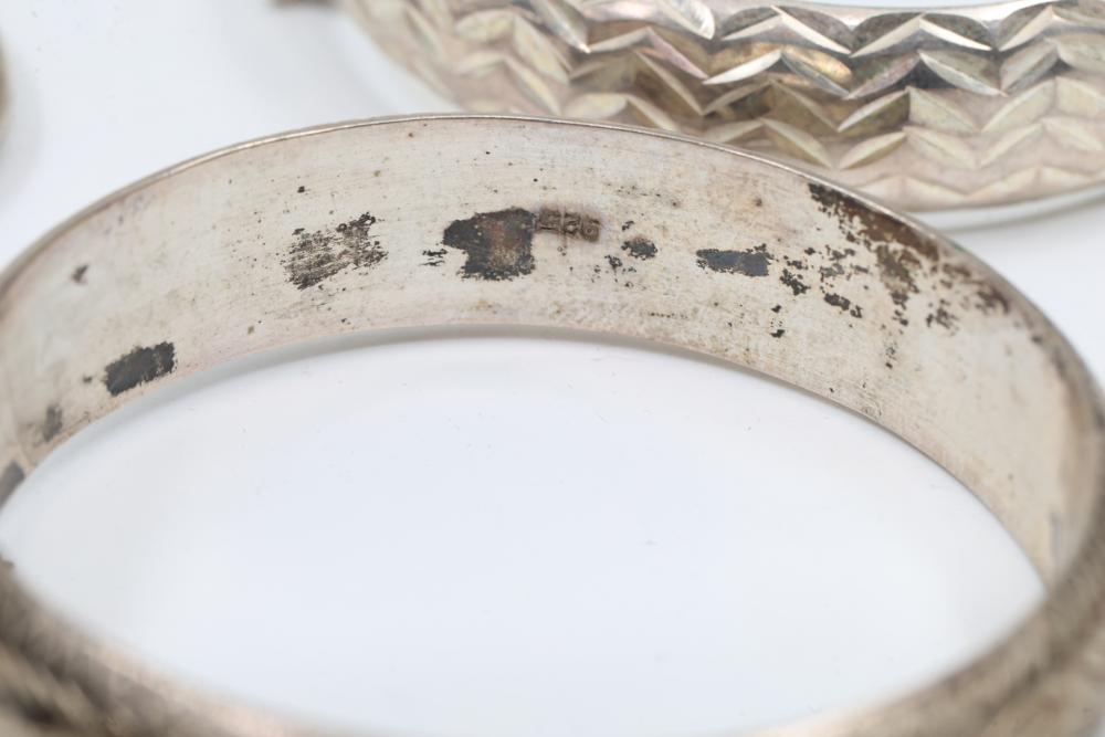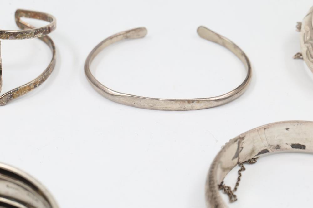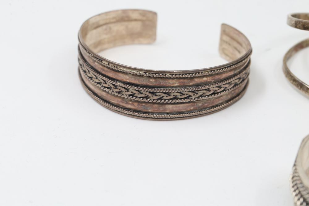 Sterling Silver Bracelets with Various Designs. Includes multiple .925 sterling silver bangles and cuffs featuring varied patterns and textures such as rope-like twists, engraved details, and animal motifs. Some pieces display visible markings of sterling silver or .925. Total weight being 205 grams.