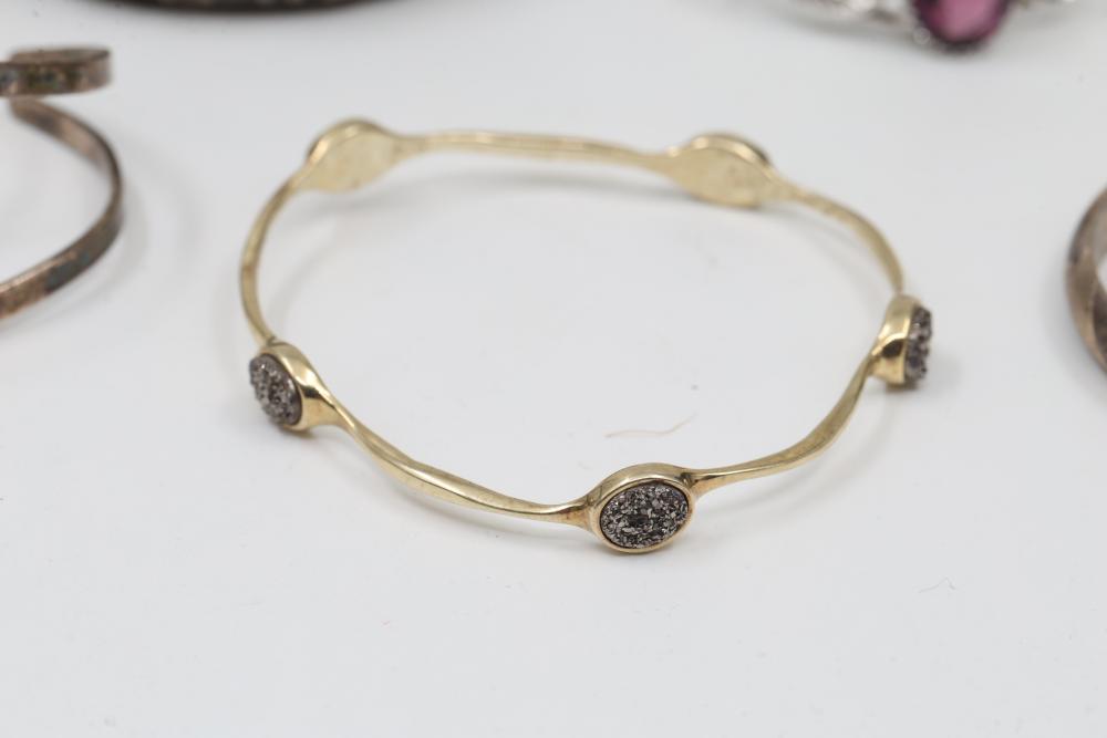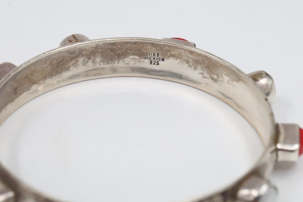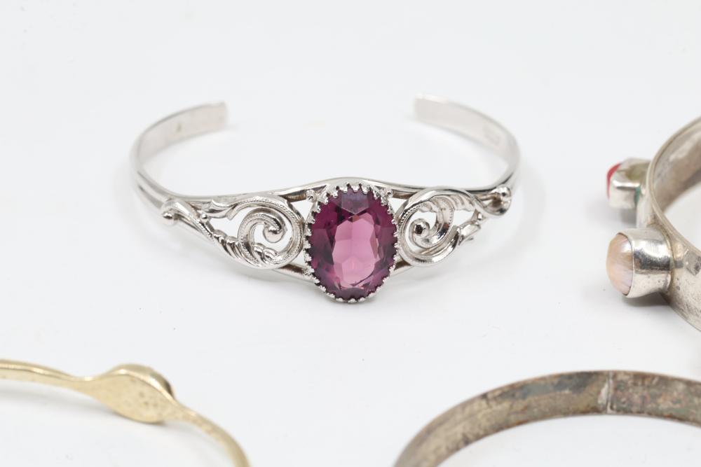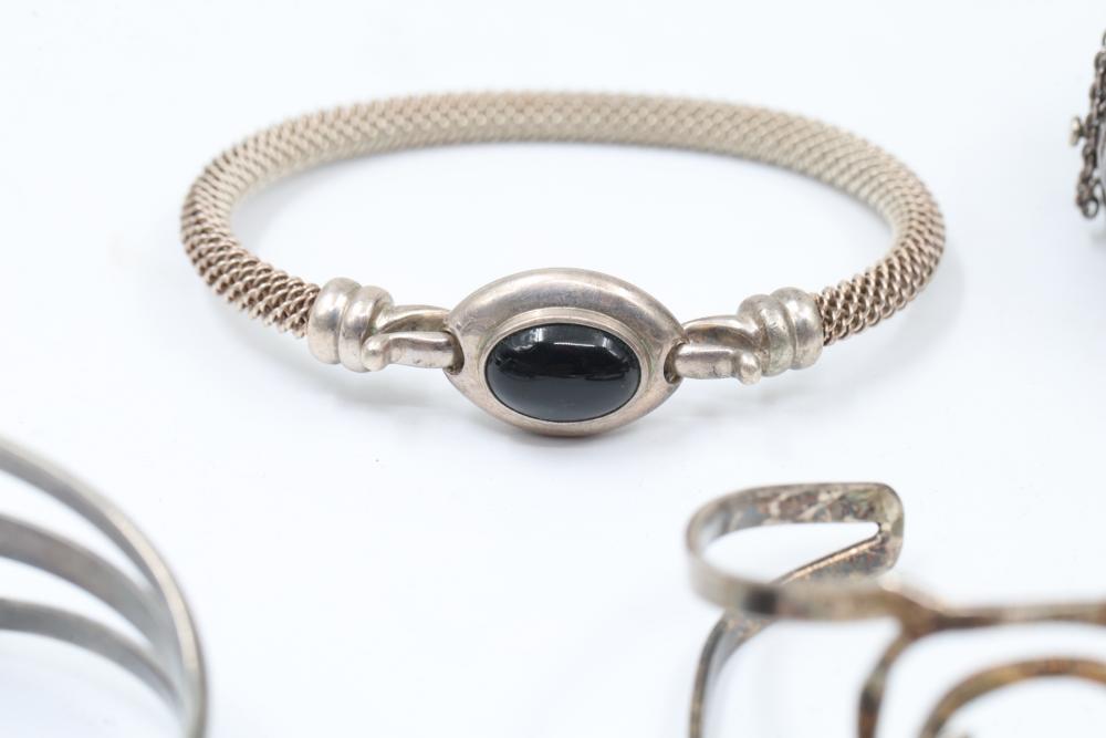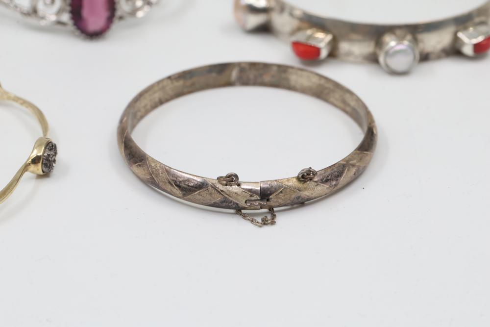 Sterling Silver Bracelets with Gemstone Accents. Includes a variety of bracelet designs crafted from sterling silver, featuring engraved, textured, and smooth finishes. Some include accents, such as gemstones in different colors. Makers' markings include '925' and others. Total weight being 231 grams.