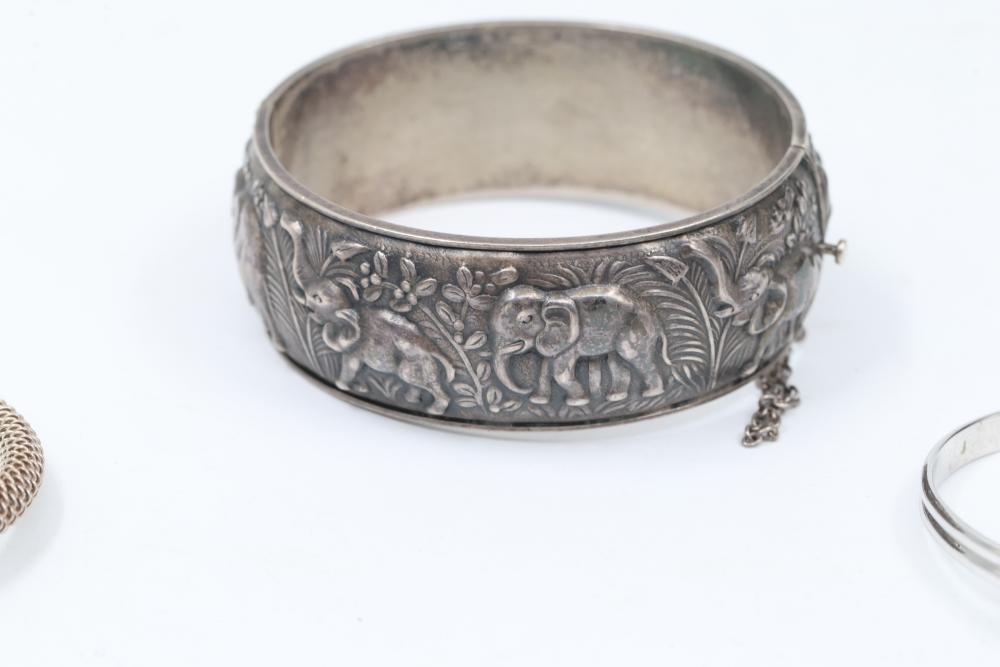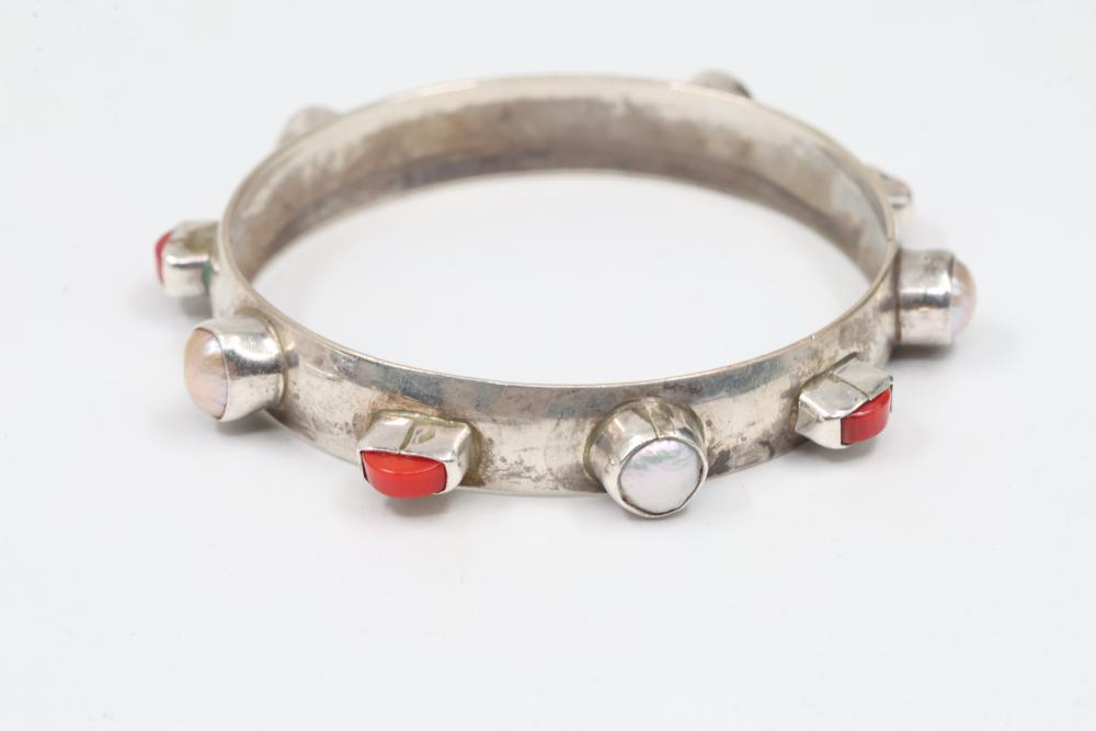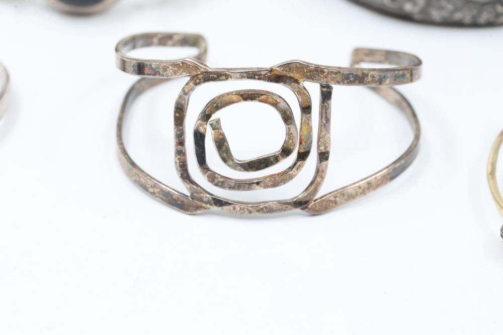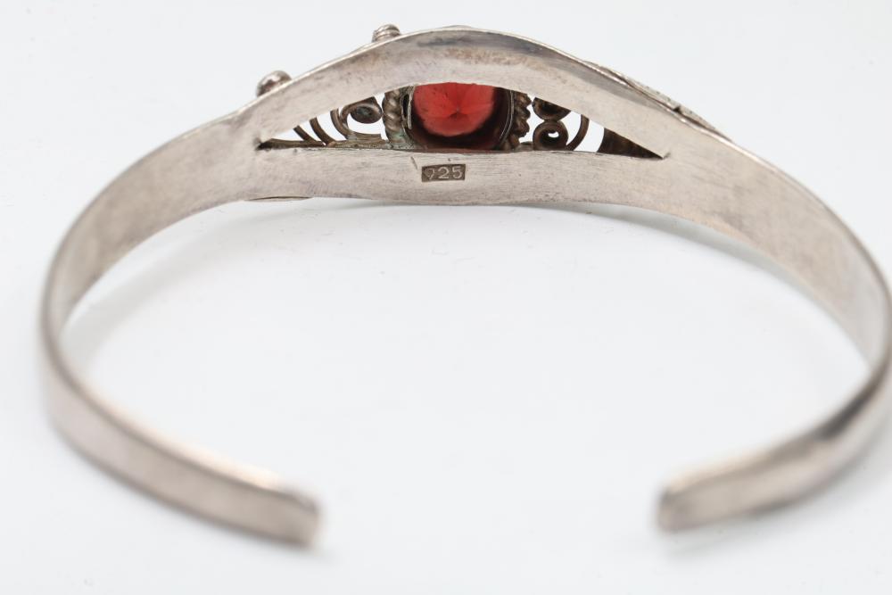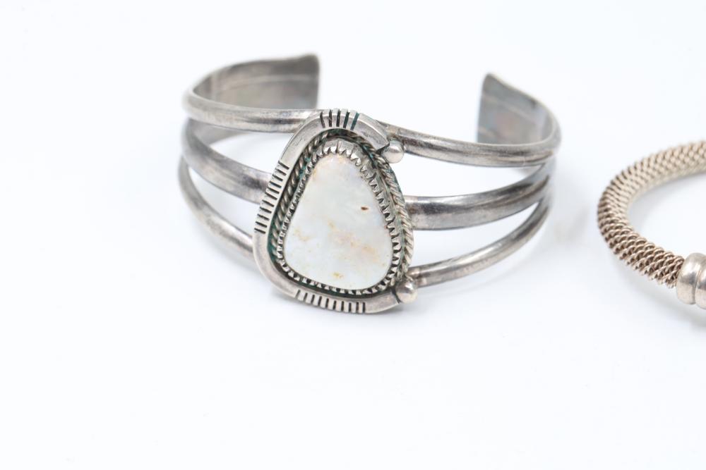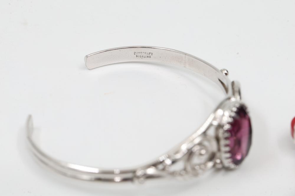 Sterling Silver Bracelets with Gemstone Accents. Includes a variety of bracelet designs crafted from sterling silver, featuring engraved, textured, and smooth finishes. Some include accents, such as gemstones in different colors. Makers' markings include '925' and others. Total weight being 231 grams.