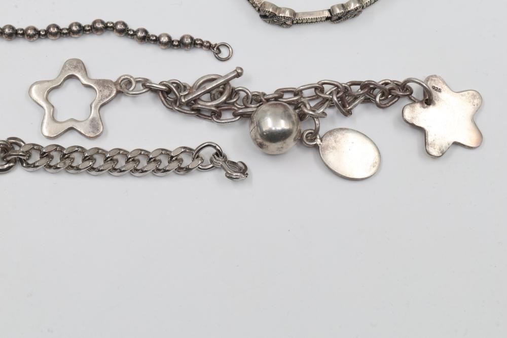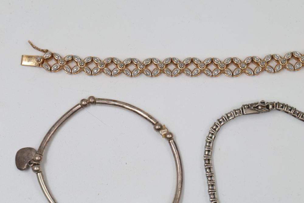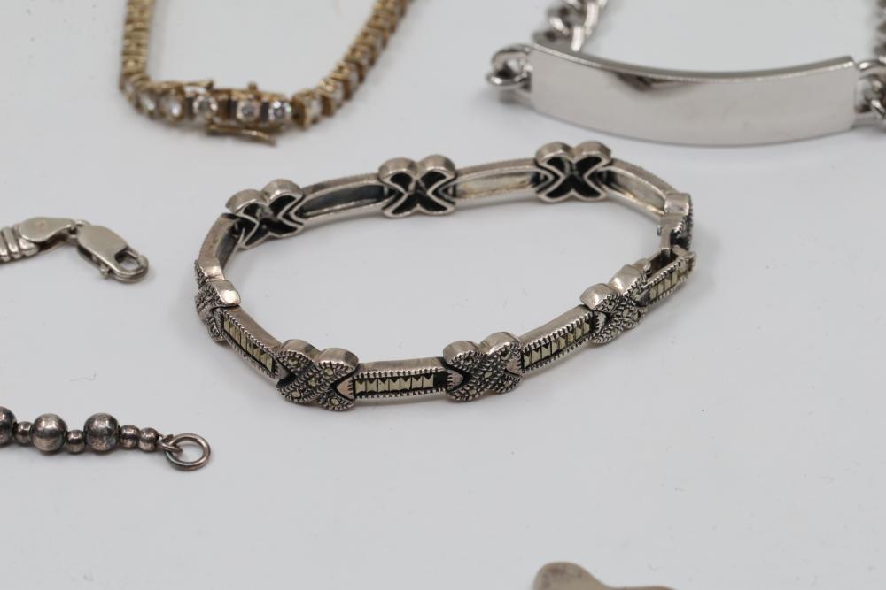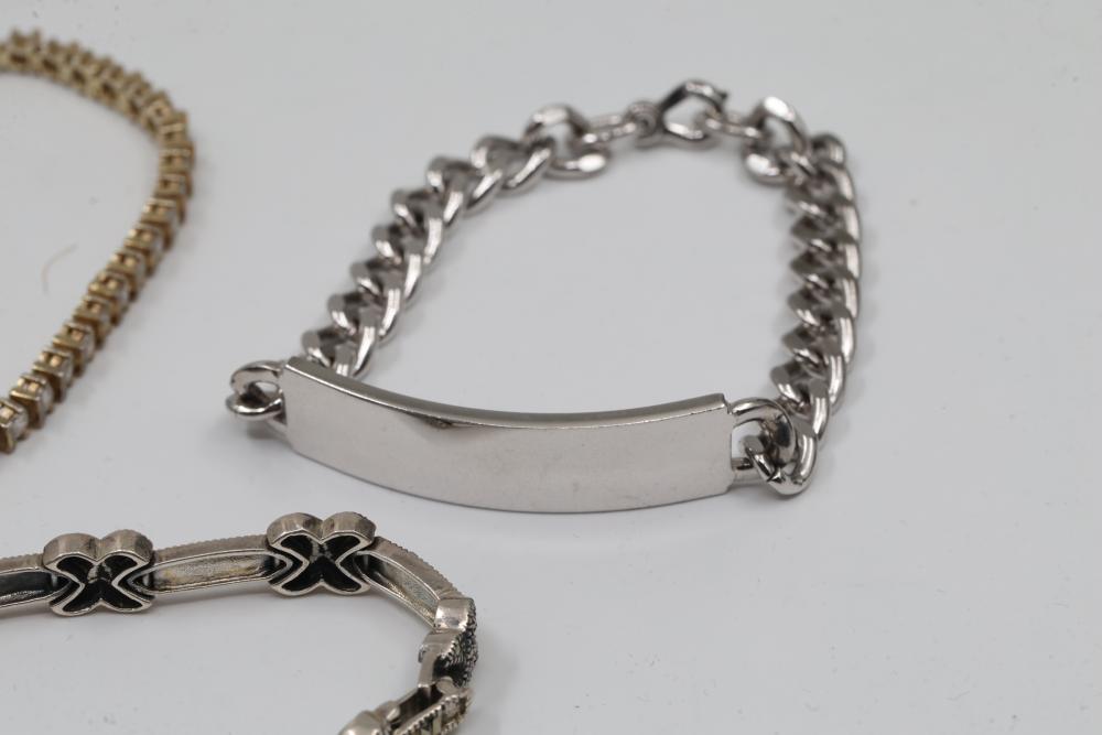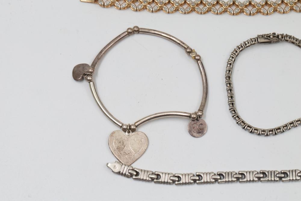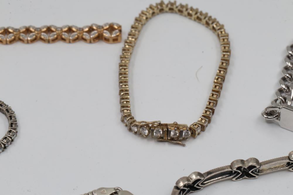 Sterling Silver and Gold-Tone Bracelets with Charms. Includes bracelets made of sterling silver marked 925 and some with gold-tone finishes. Features various designs, including chain styles, tennis bracelet styles with stones, and charm bracelets with decorative pendants. Total weight being 215 grams.