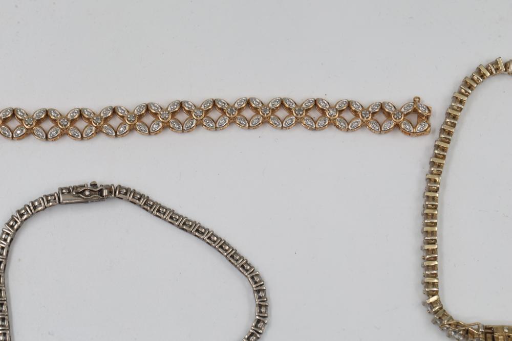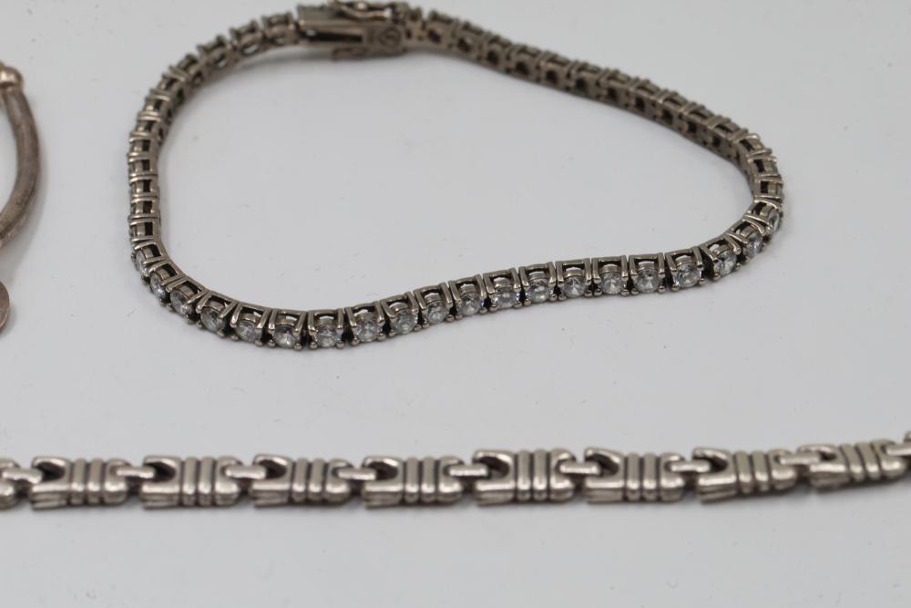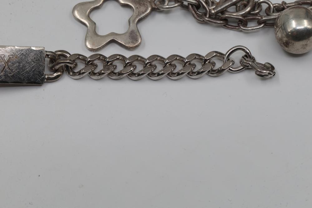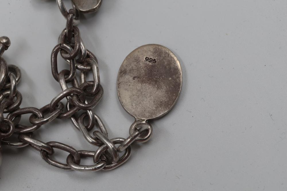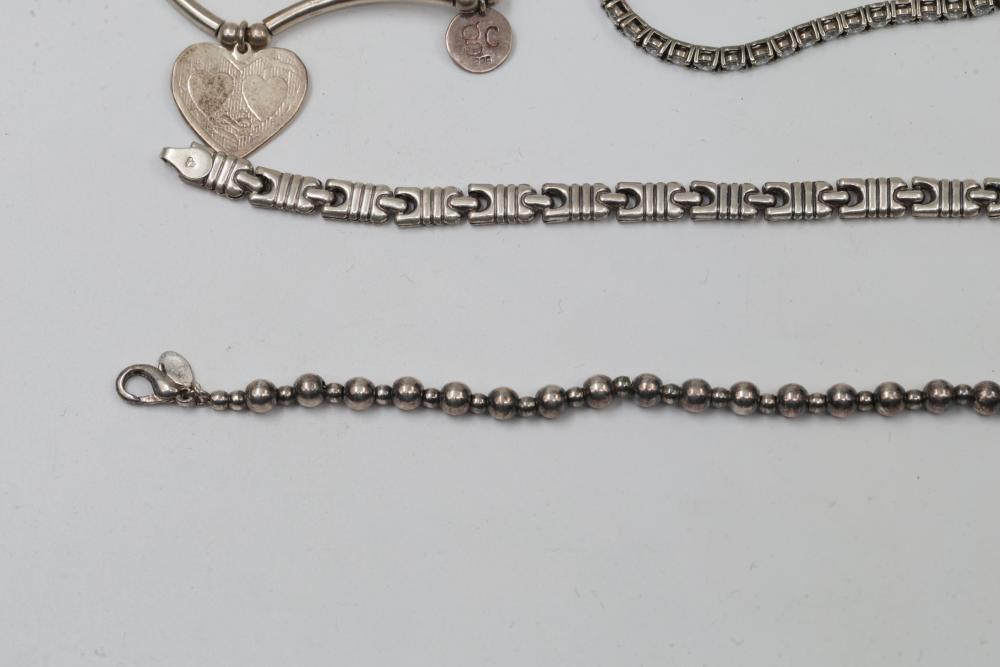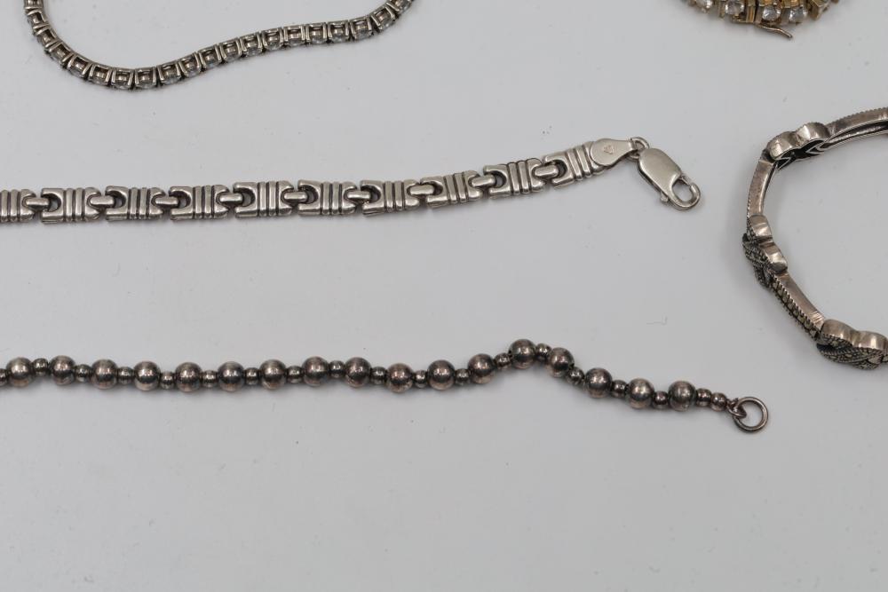 Sterling Silver and Gold-Tone Bracelets with Charms. Includes bracelets made of sterling silver marked 925 and some with gold-tone finishes. Features various designs, including chain styles, tennis bracelet styles with stones, and charm bracelets with decorative pendants. Total weight being 215 grams.