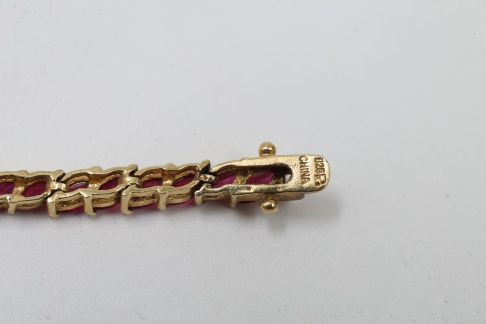 Sterling silver bracelet set with 50 rubies in a vibrant design. The bracelet features a secure clasp and reflective finish, adding a sleek touch to the piece. Each ruby is carefully aligned, enhancing the overall appeal. Total weight being 10 grams.
