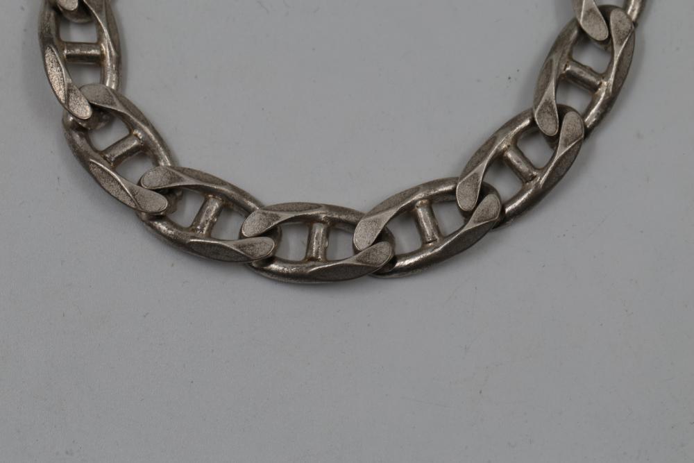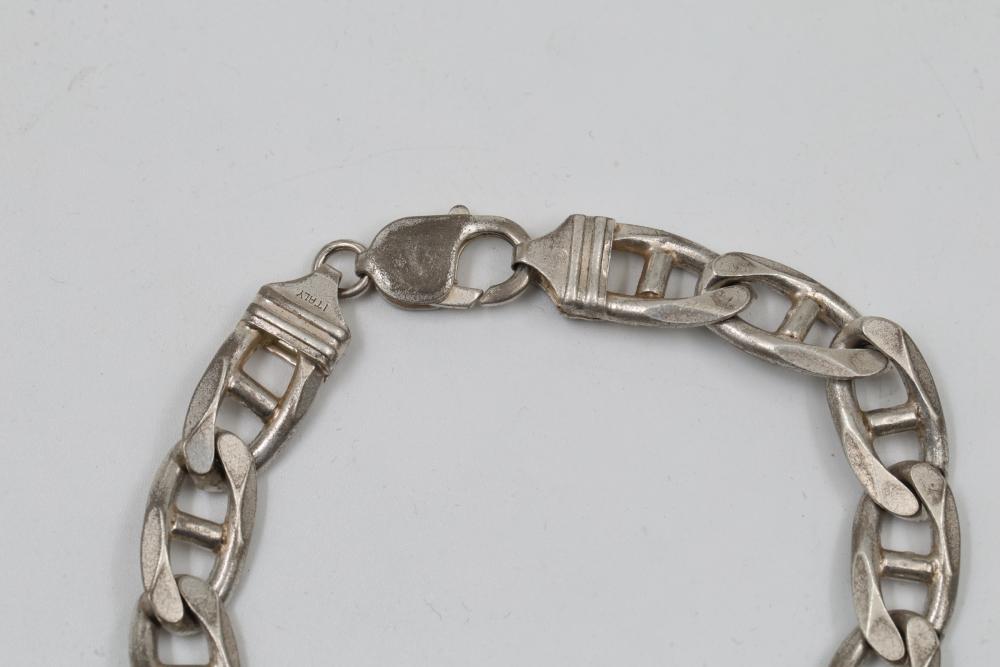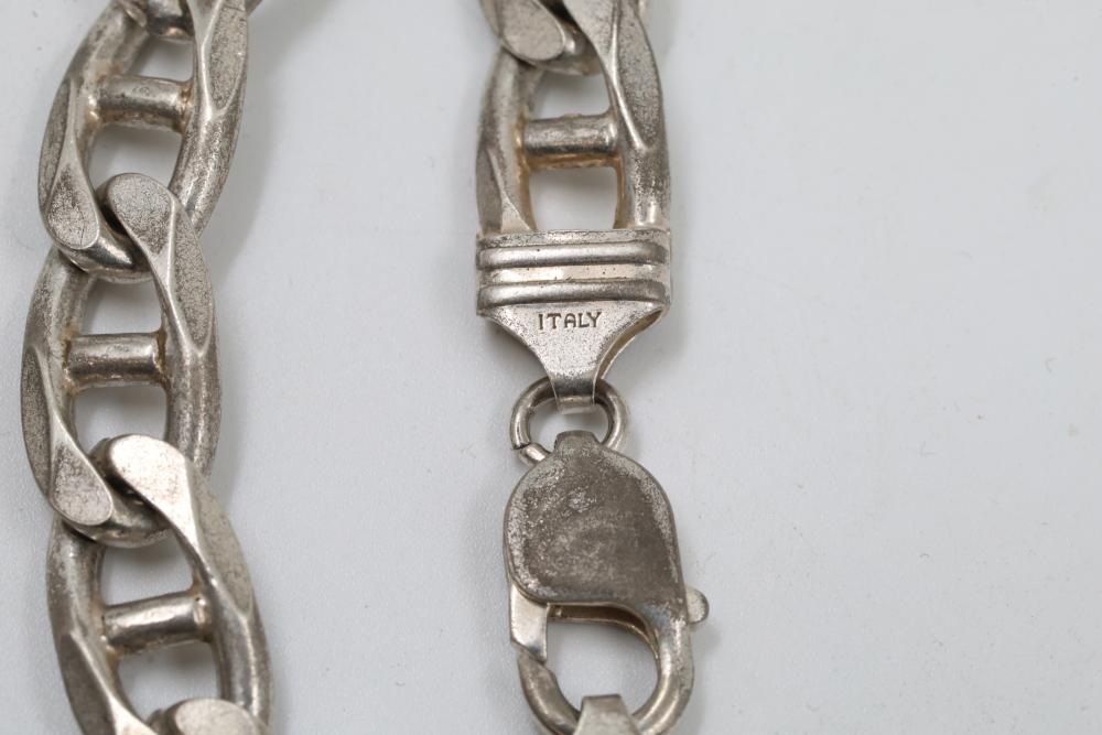 Sterling Silver 925 Figaro Chain Bracelet with Lobster Clasp. Marked 925 for sterling silver content. Features a Figaro-style chain design with a secure lobster clasp for easy wear. Total weight being 42 grams.
