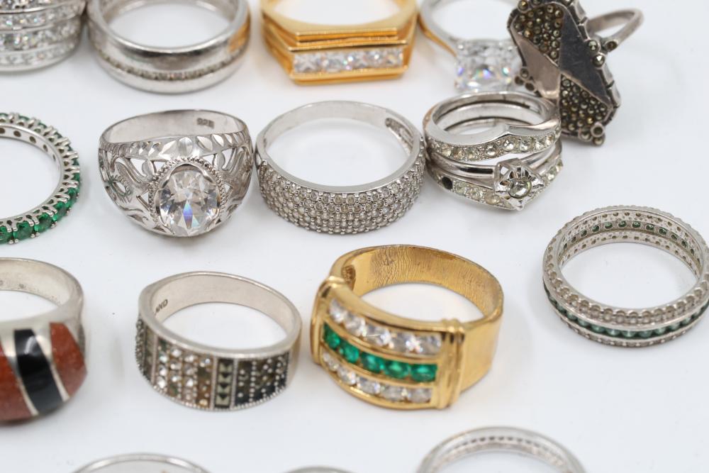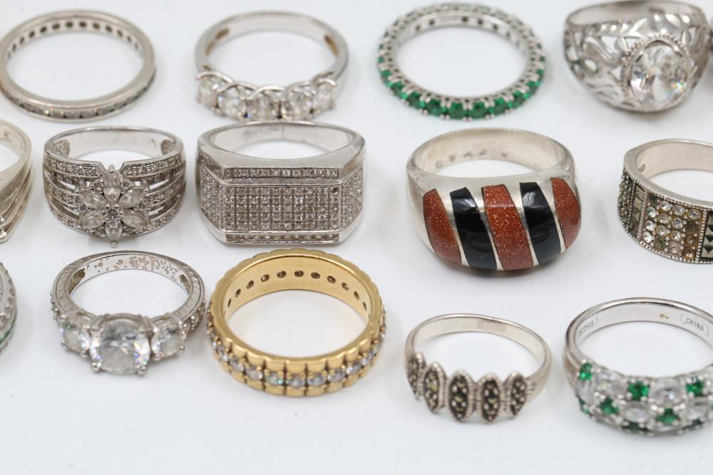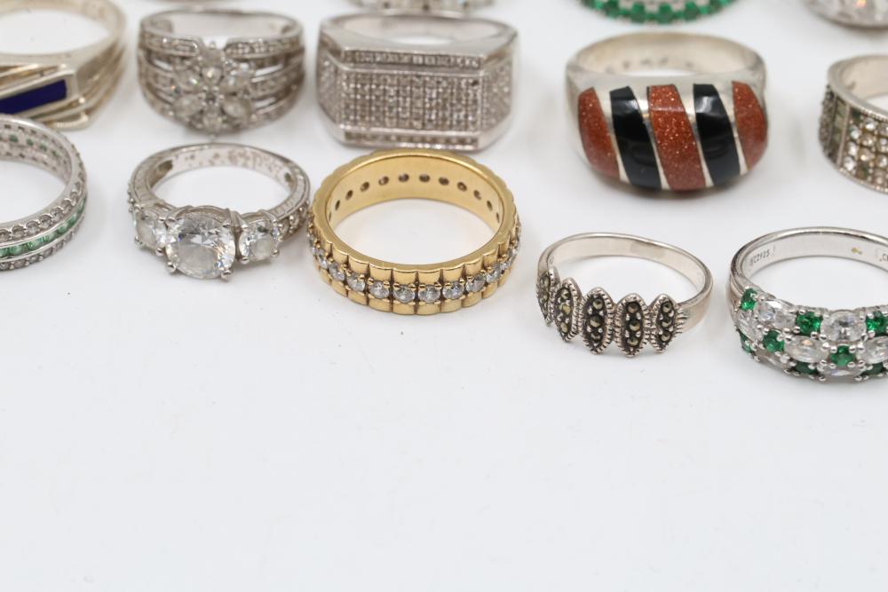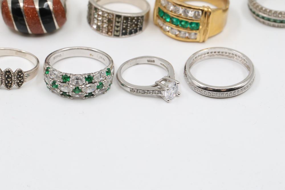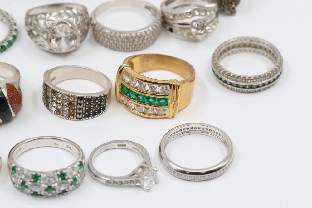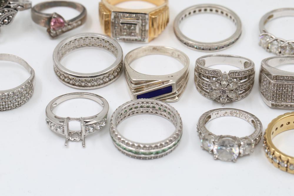 Rings crafted in mixed metals, including silver and gold tones, featuring a range of styles and gemstones such as clear, green, and red stones. The designs include bands, clusters, and intricate detailing. Includes both decorative and statement pieces. Total weight being 204 grams.