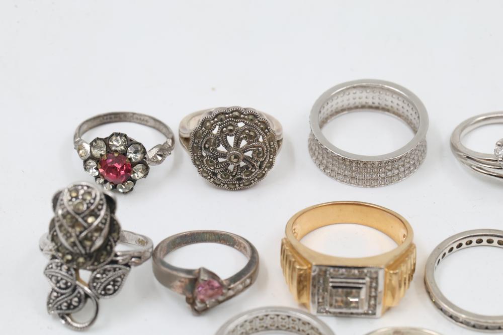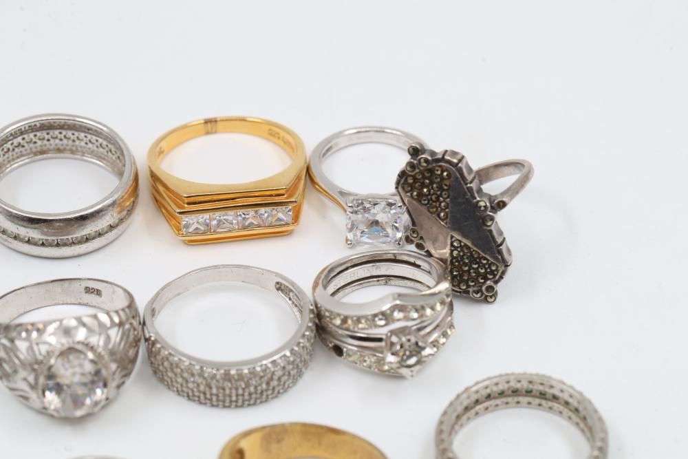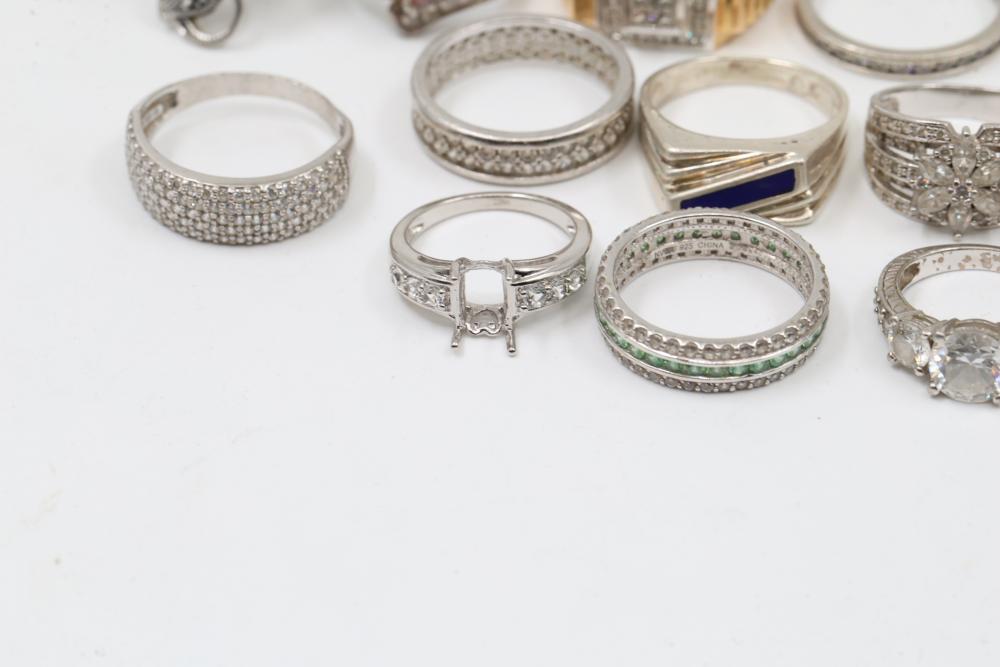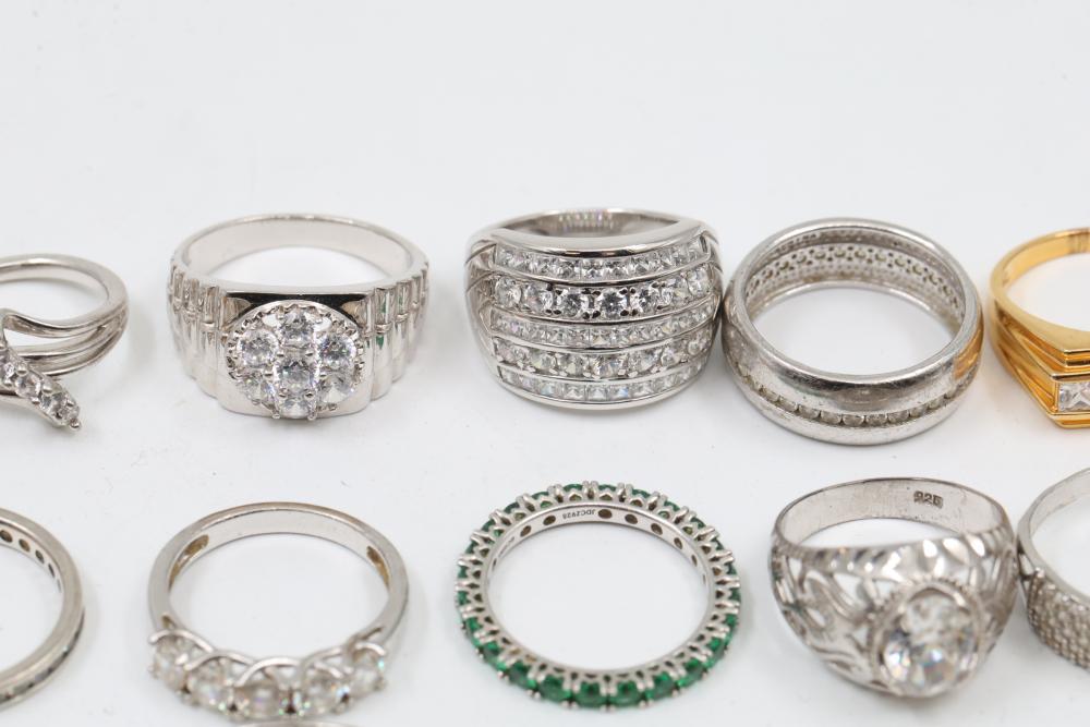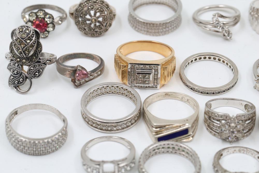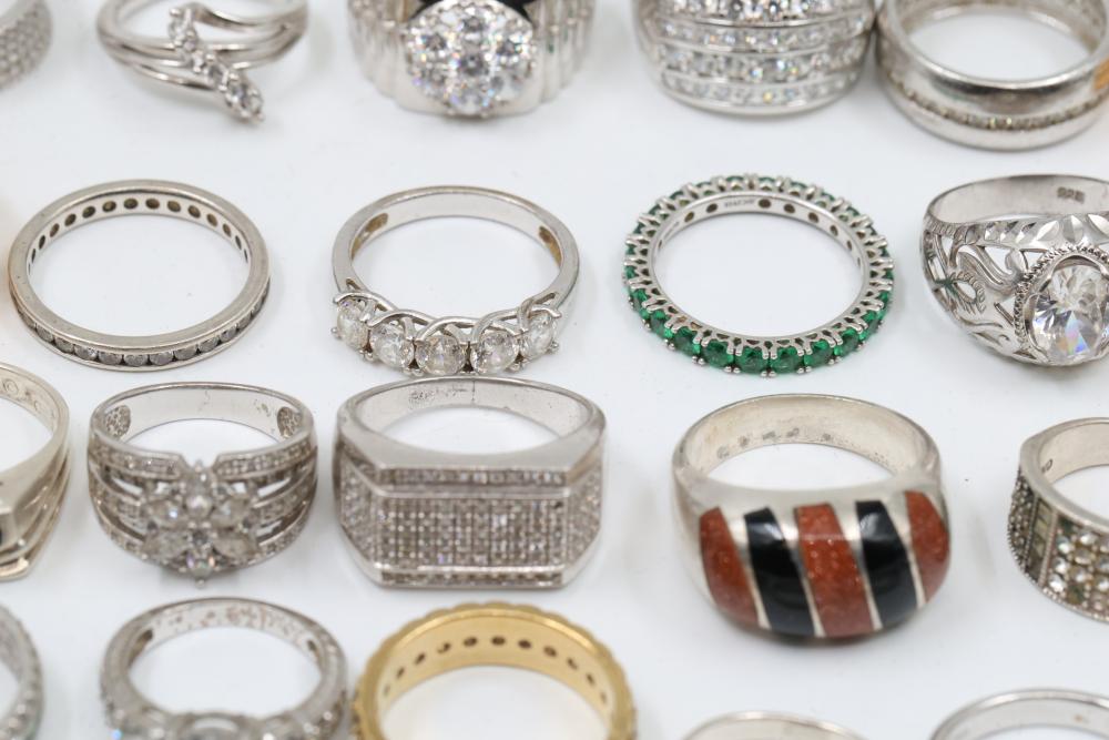Rings crafted in mixed metals, including silver and gold tones, featuring a range of styles and gemstones such as clear, green, and red stones. The designs include bands, clusters, and intricate detailing. Includes both decorative and statement pieces. Total weight being 204 grams.