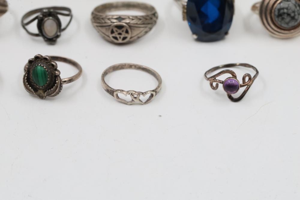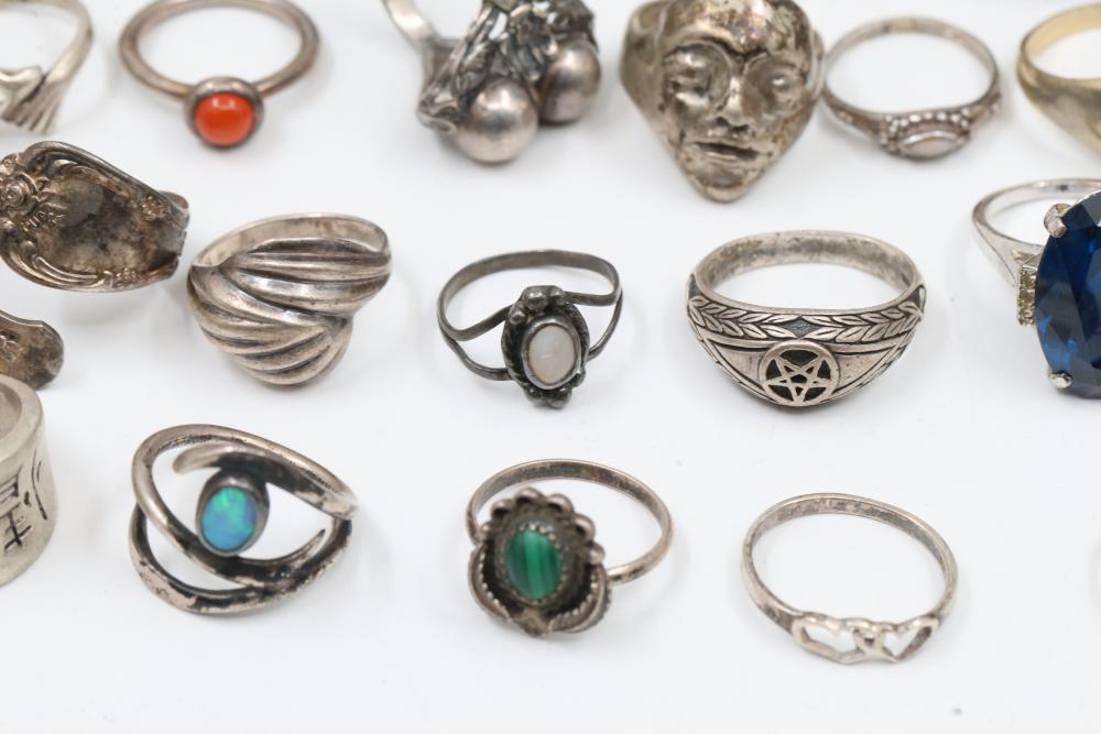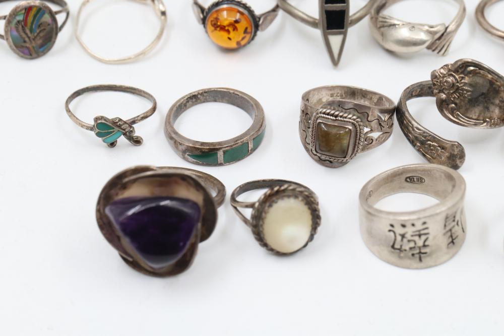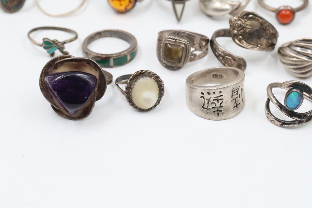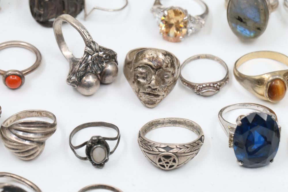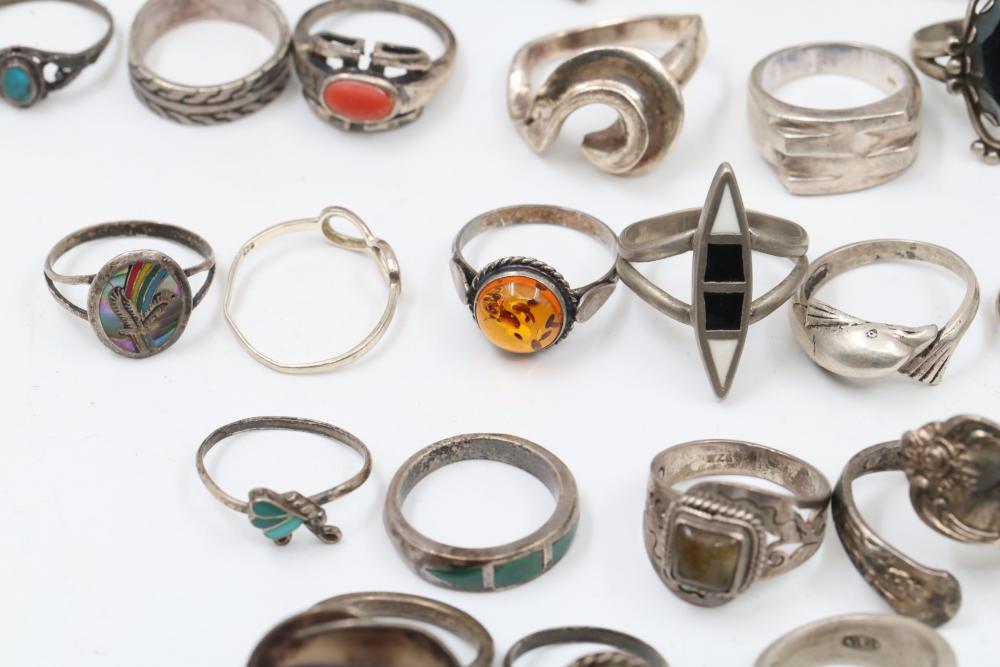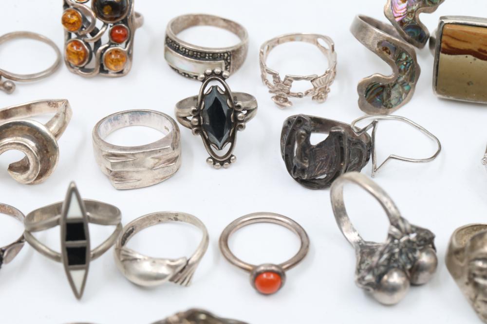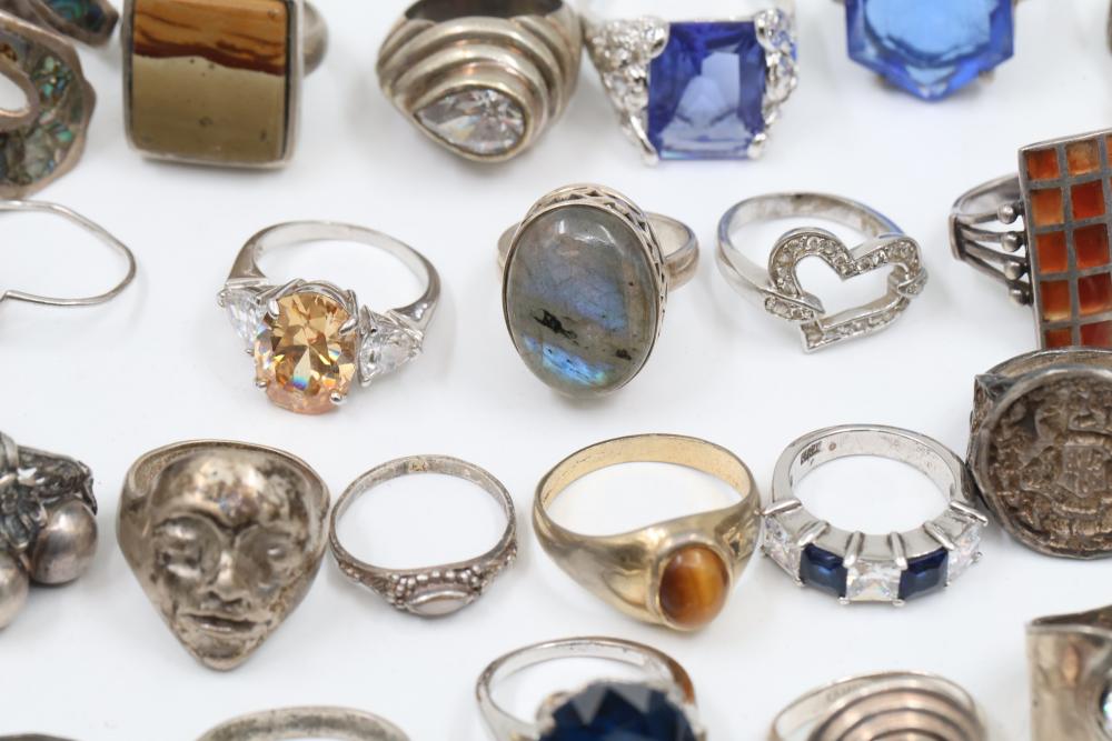 50+ rings featuring sterling silver settings, varied designs, and embellishments including gemstones, enamel, and cabochon stones. Styles include ornate and geometric, with materials such as turquoise, amber, and lapis referenced. Sterling weight 98 grams. Total weight being 277 grams.