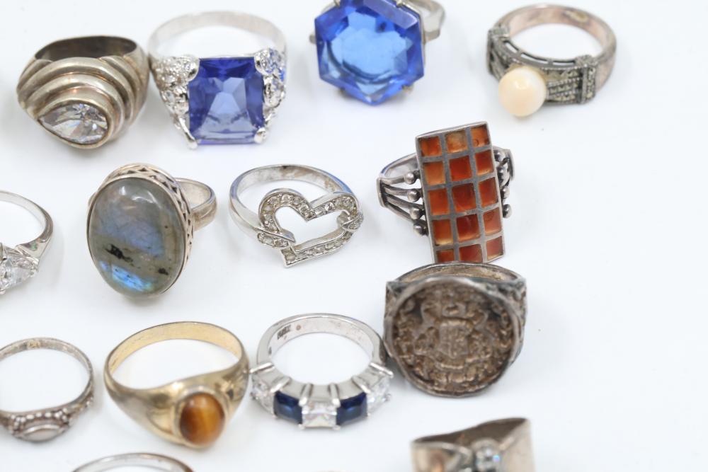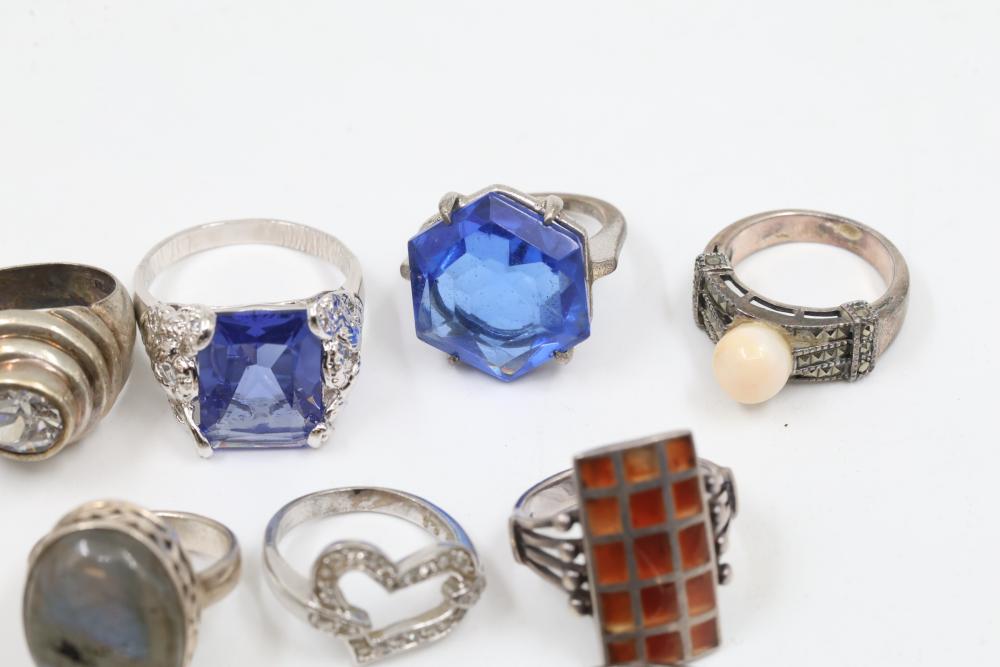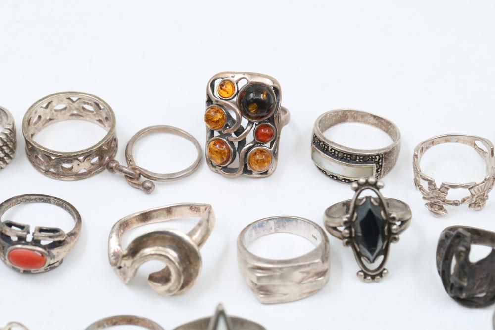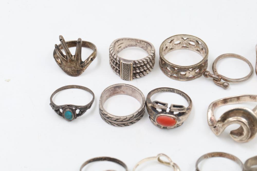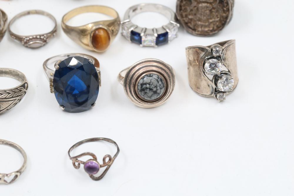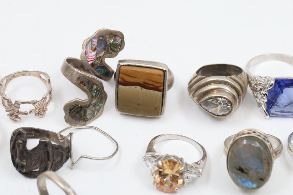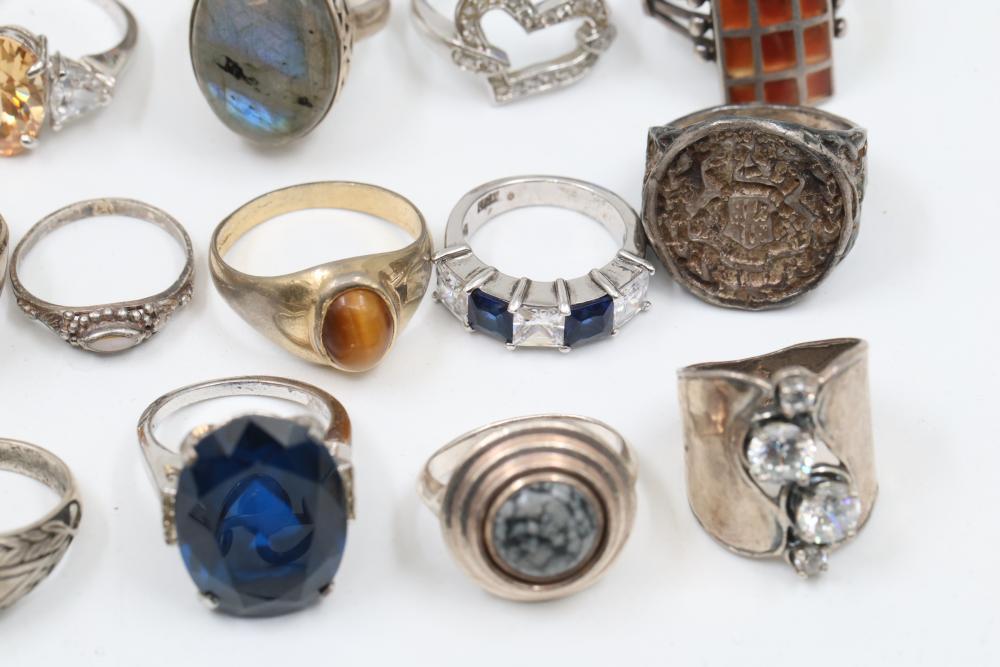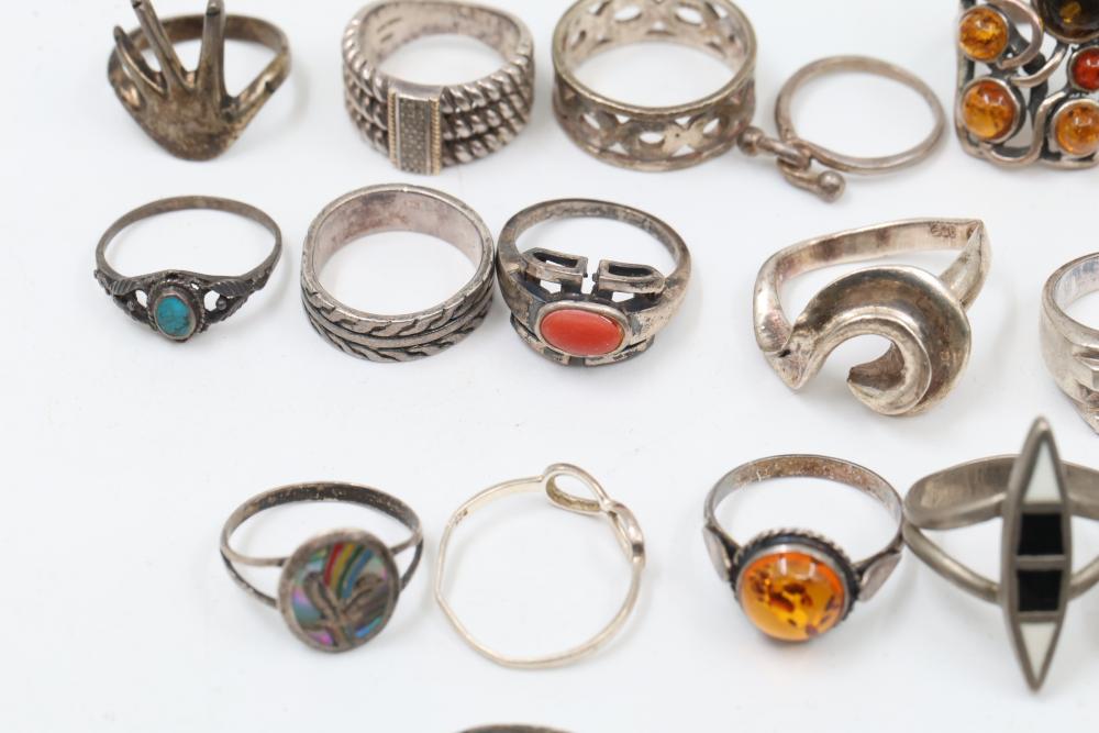 50+ rings featuring sterling silver settings, varied designs, and embellishments including gemstones, enamel, and cabochon stones. Styles include ornate and geometric, with materials such as turquoise, amber, and lapis referenced. Sterling weight 98 grams. Total weight being 277 grams.