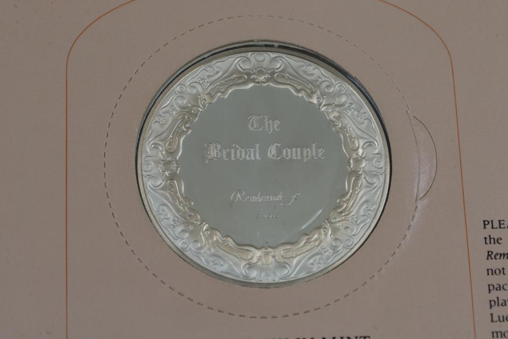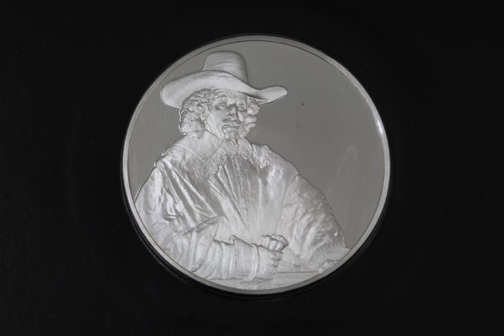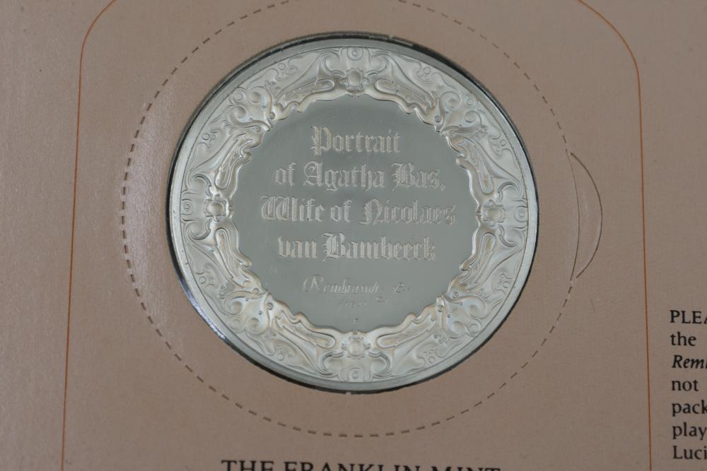 (4) Franklin Mint sterling silver medallions depicting works inspired by Rembrandt, including "Portrait of Nicolaas van Bambeeck", "Portrait of Agatha Bas" and "The Apostle Paul in Prison". Each medallion features etched details with inscriptions on the reverse, presented alongside descriptive inserts. Total weight being 264 grams.