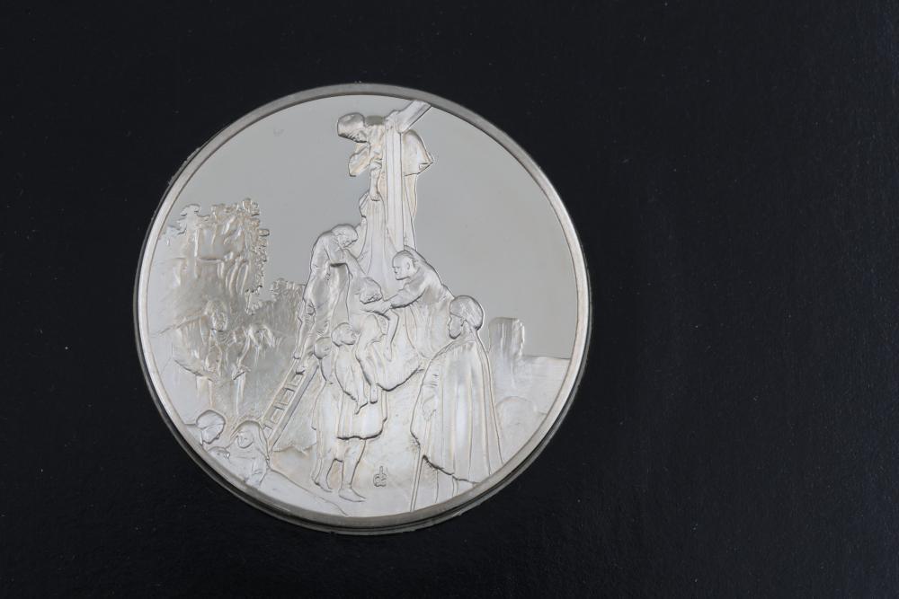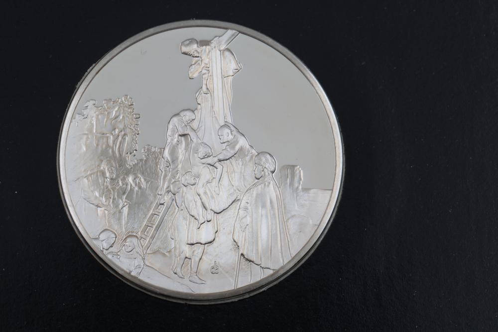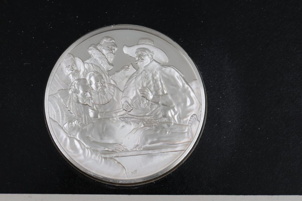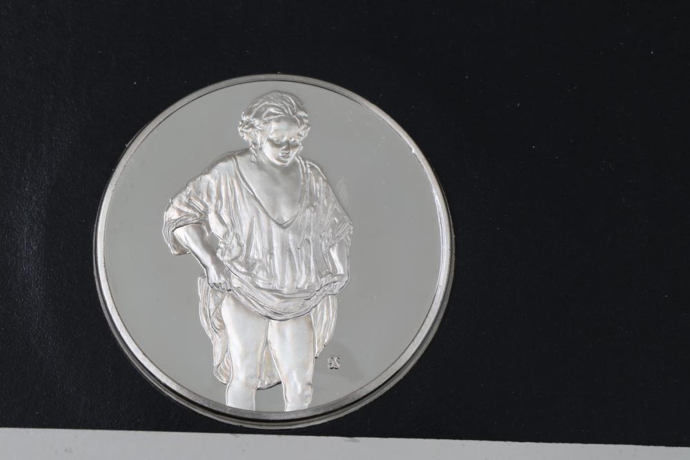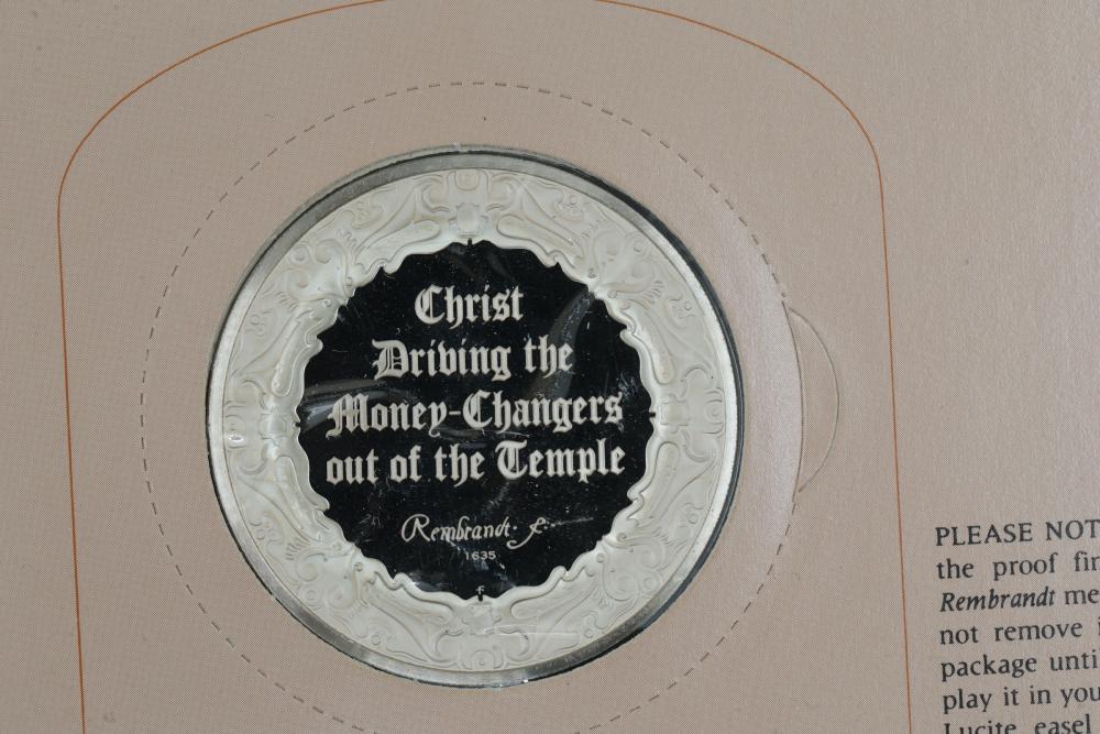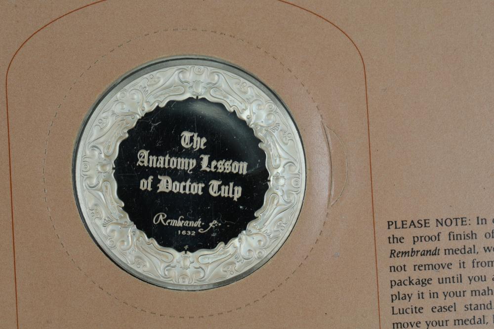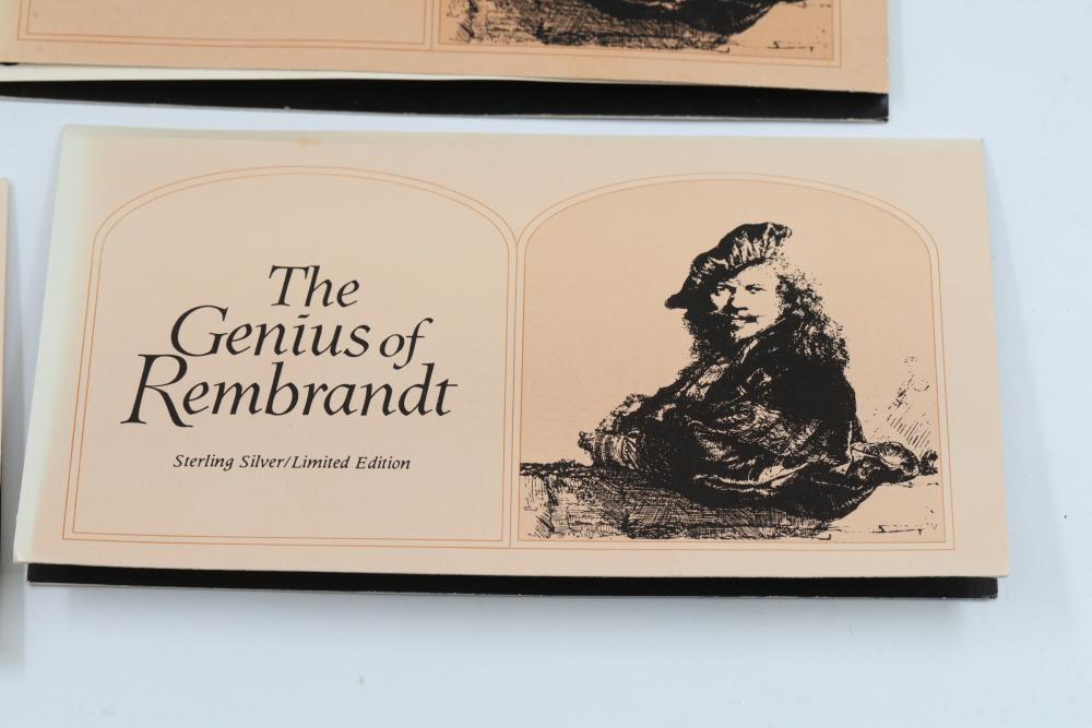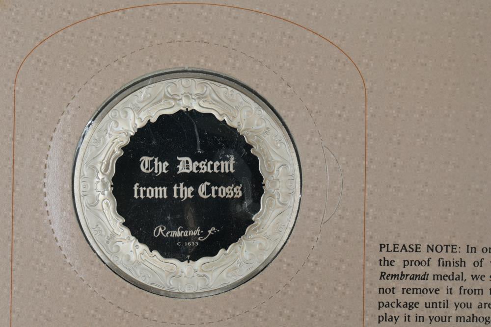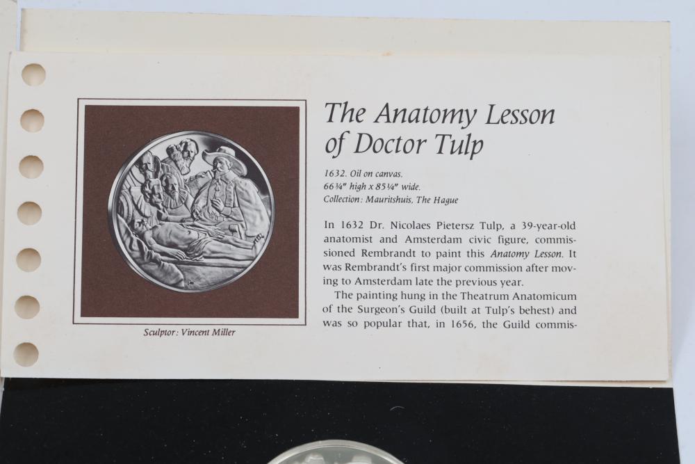 (4) Franklin Mint Sterling Silver Medals Inspired by Rembrandt's Artwork. Includes medals depicting "The Anatomy Lesson of Doctor Tulp", "A Woman Bathing in a Stream", "The Descent from the Cross" and "Christ Driving the Money-Changers out of the Temple" among others. Each medal showcases detailed engravings inspired by iconic Rembrandt works. Presented with accompanying informational cards. Total weight being 264 grams.