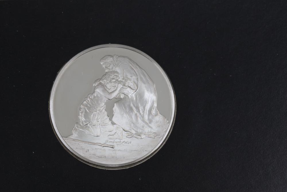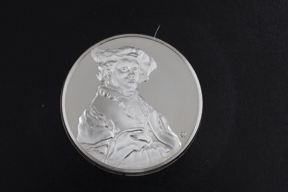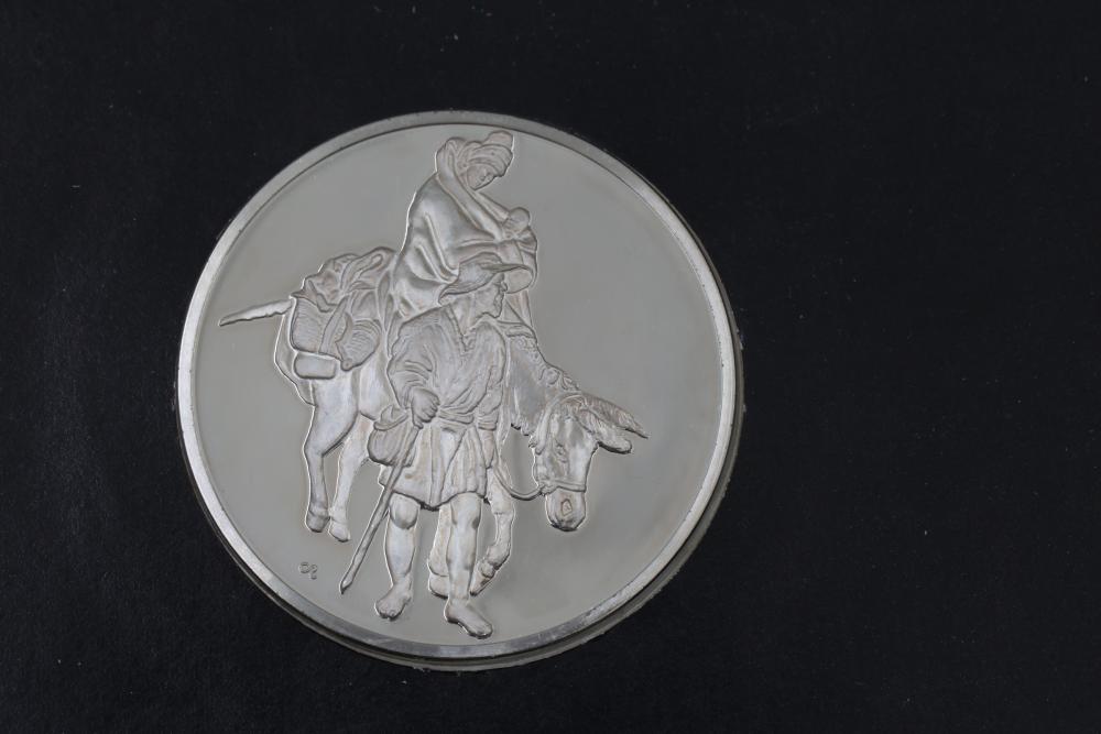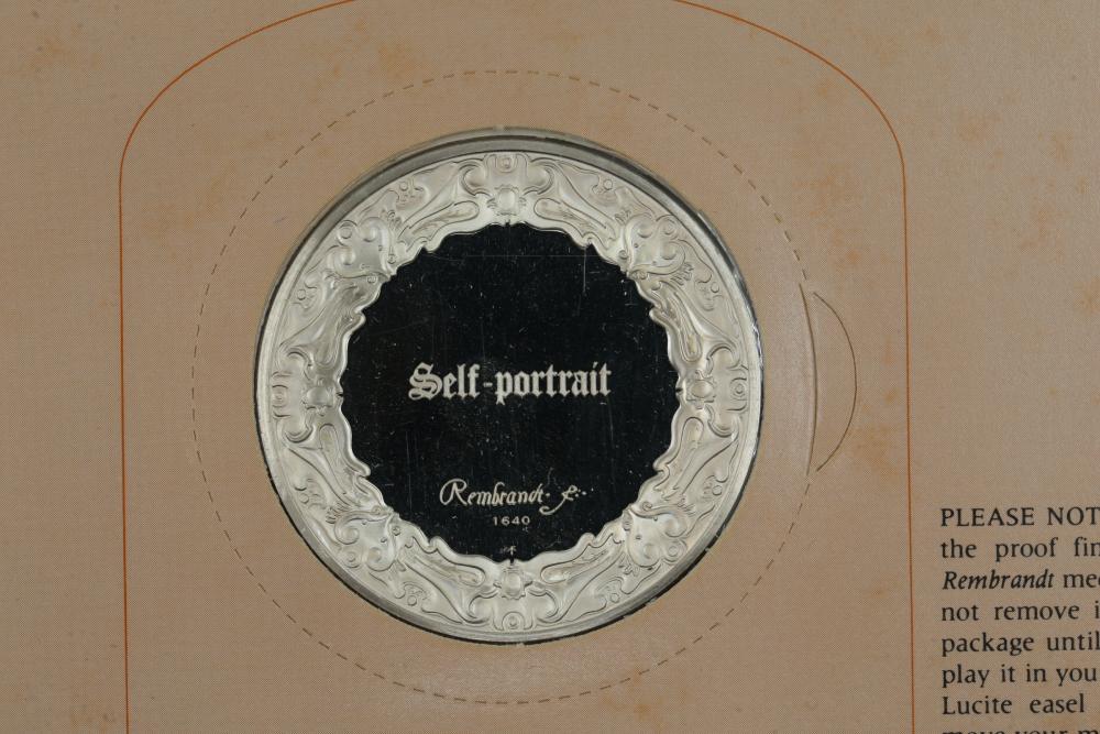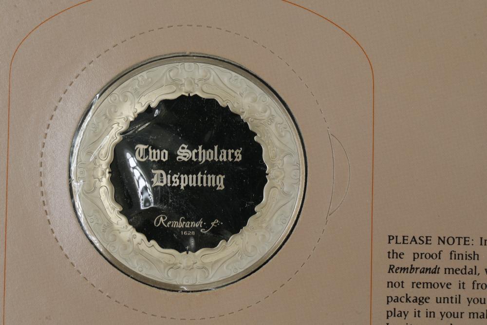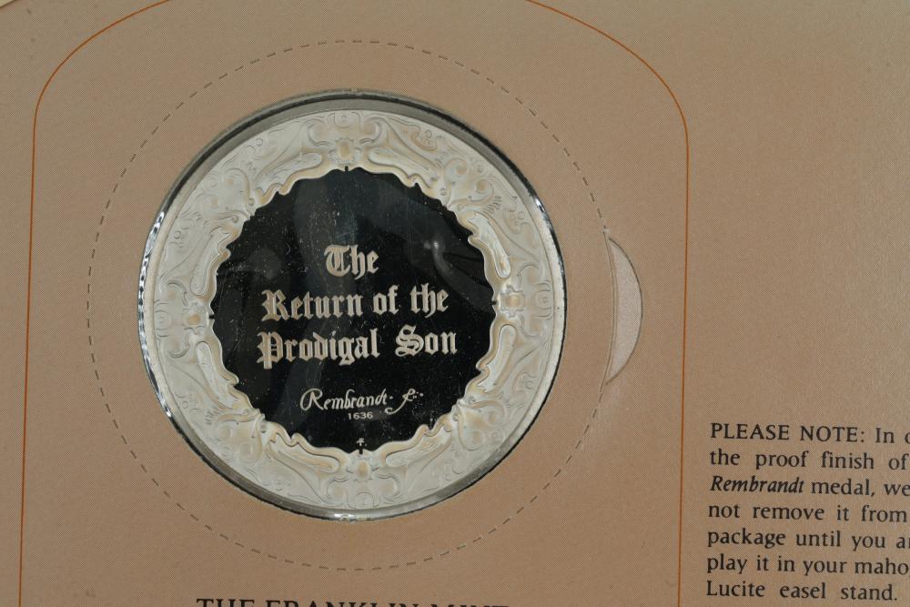 (4) Franklin Mint sterling silver-toned medals inspired by works of Rembrandt, including "Two Scholars Disputing", "The Flight into Egypt", "Self-Portrait" and "The Return of the Prodigal Son". Each medal features a sculpted design on the obverse and descriptive text on the reverse. Includes corresponding booklet pages with image details and background information. Total weight being 264 grams.
