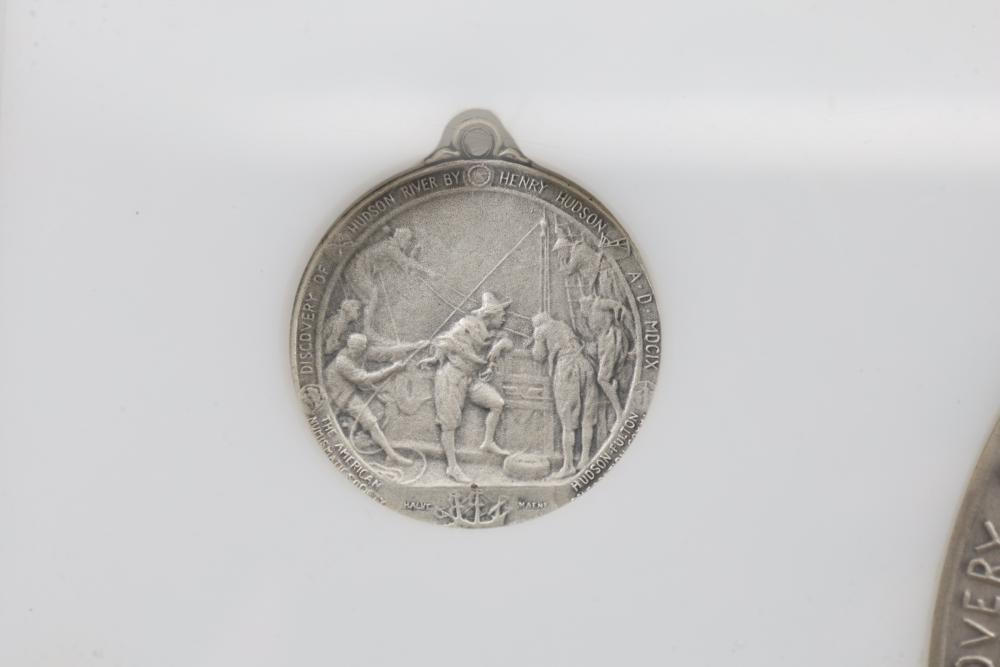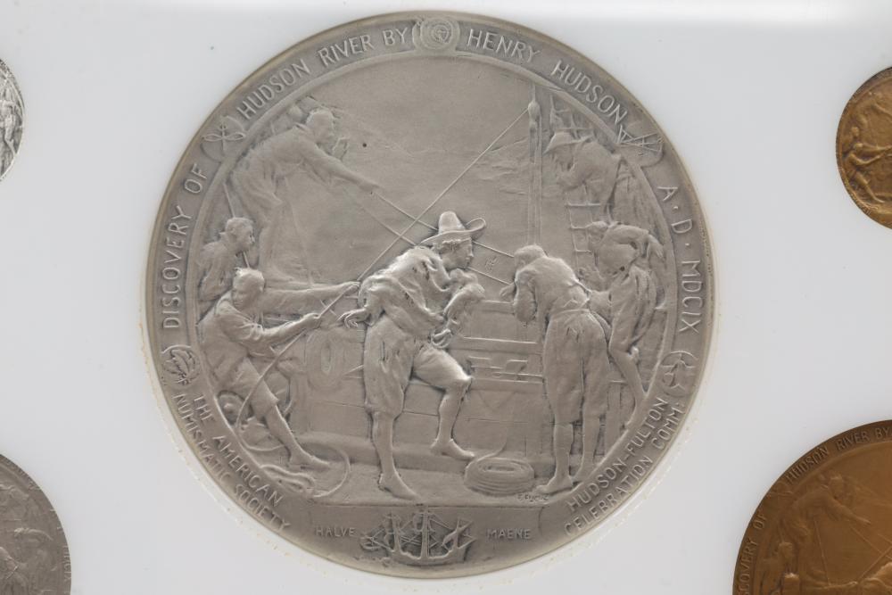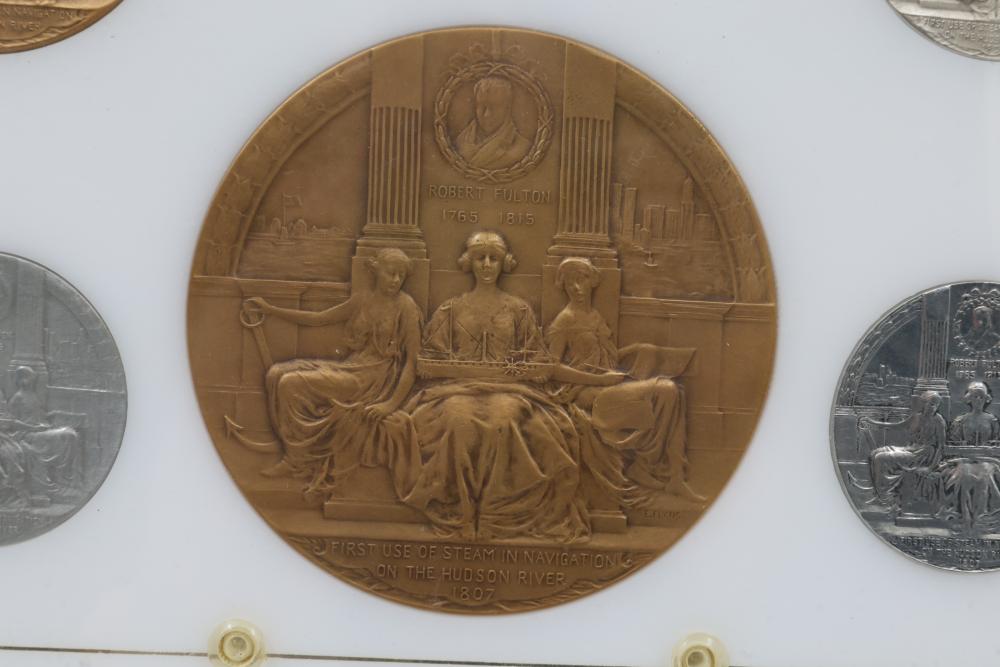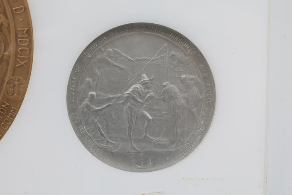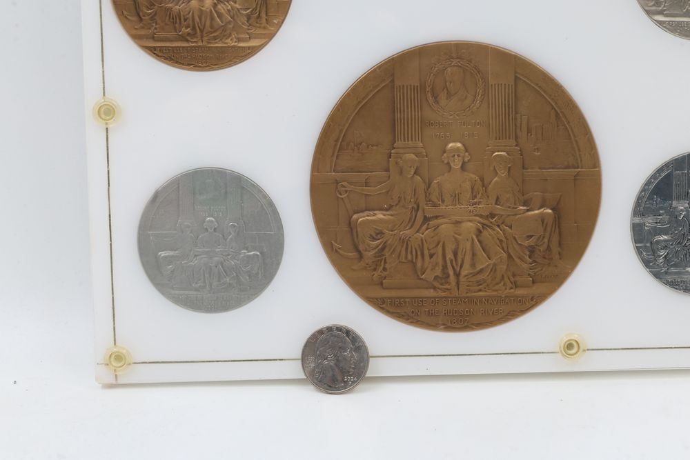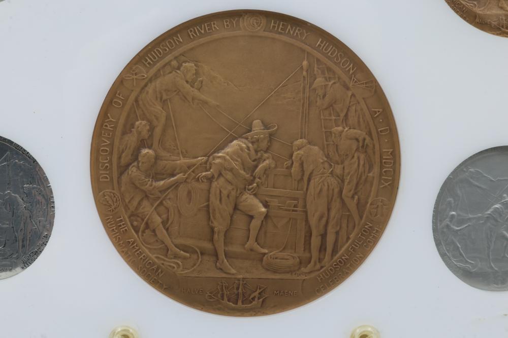 Hudson-Fulton Celebration 1909 Commemorative Medallions Set includes eight pieces in both bronze and silver tones, each depicting scenes such as the discovery of the Hudson River by Henry Hudson and the first use of steam navigation. Detailed engravings are featured on each medallion, with varying sizes displayed in a protective acrylic case. Two of the coins are marked sterling silver including the large one in the middle which is 4” in diameter and weighs just over 10 ounces.