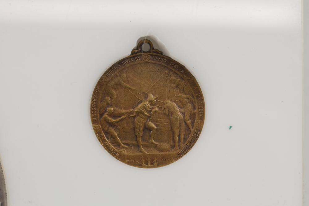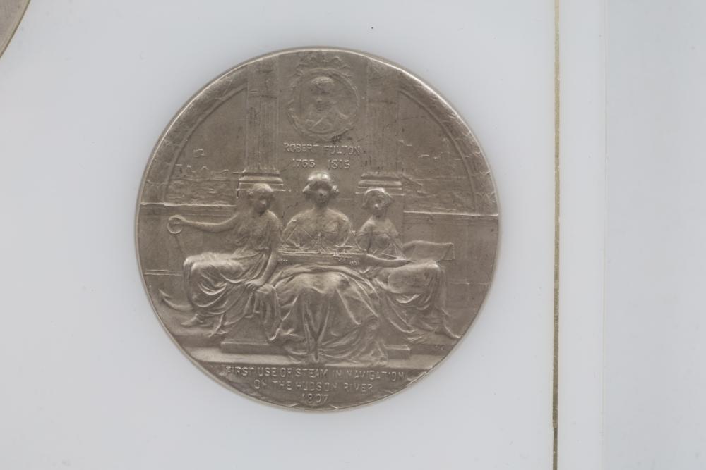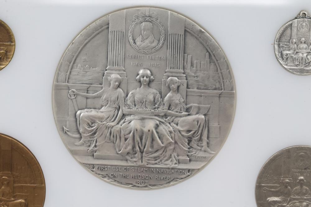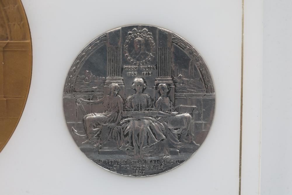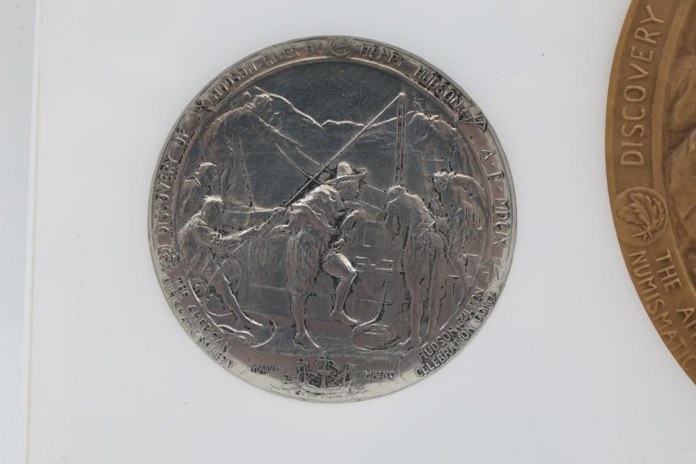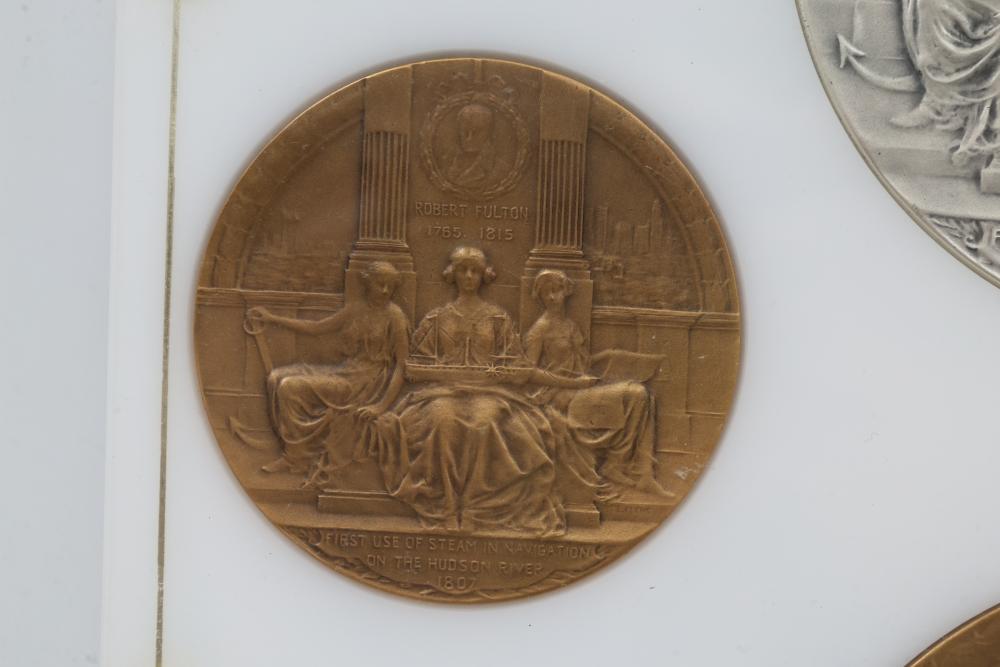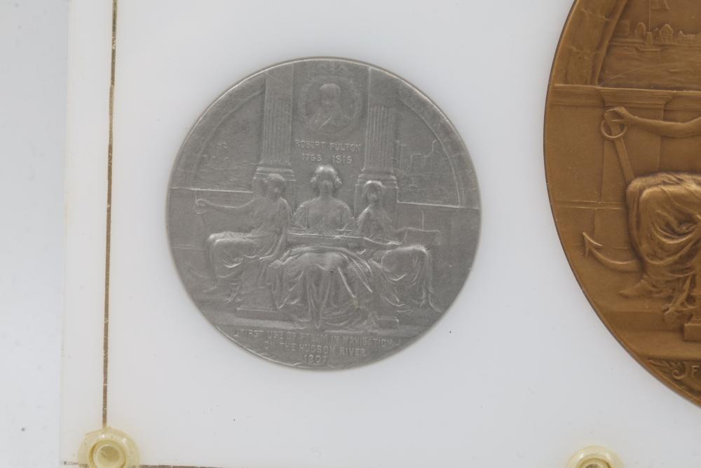 Hudson-Fulton Celebration 1909 Commemorative Medallions Set includes eight pieces in both bronze and silver tones, each depicting scenes such as the discovery of the Hudson River by Henry Hudson and the first use of steam navigation. Detailed engravings are featured on each medallion, with varying sizes displayed in a protective acrylic case. Two of the coins are marked sterling silver including the large one in the middle which is 4” in diameter and weighs just over 10 ounces.