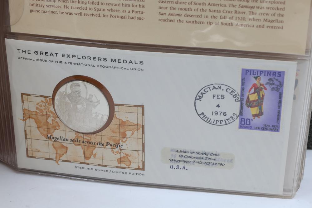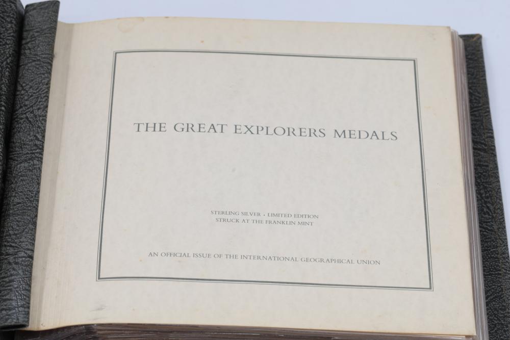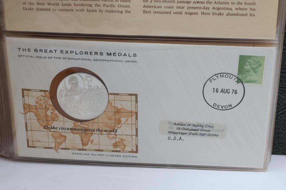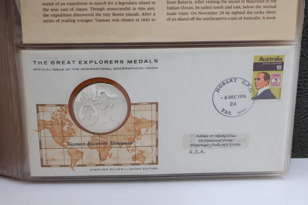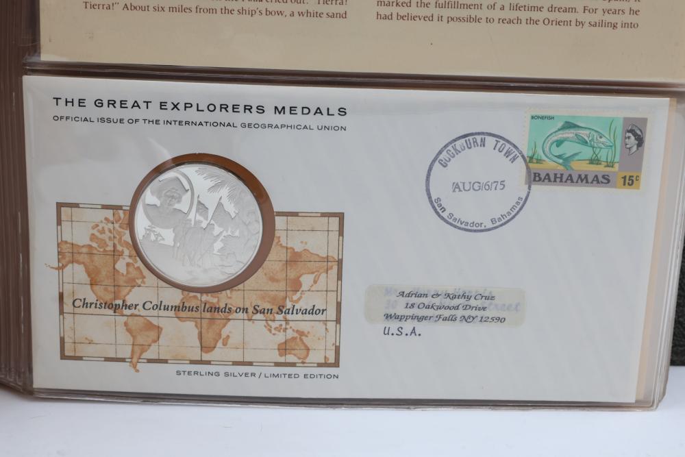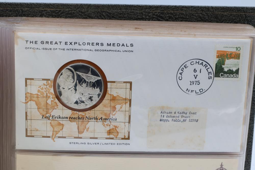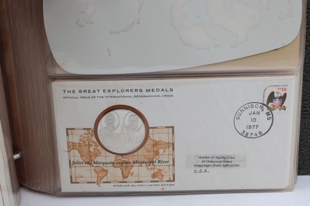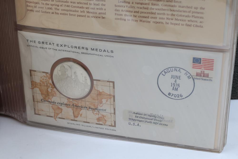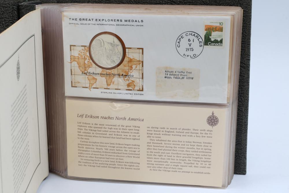 The Great Explorers Medals First Edition Set with Sterling Silver Proof Medals. Includes 23 engraved medals, each weighing approx. 25.49 grams featuring notable explorers such as Leif Erikson, Marco Polo, Christopher Columbus, Vasco da Gama, and others. Comes in an album with certificates of authenticity. Total weight approximately 586.27 grams.