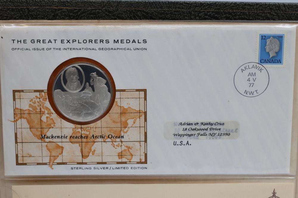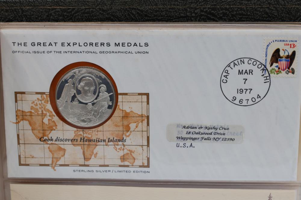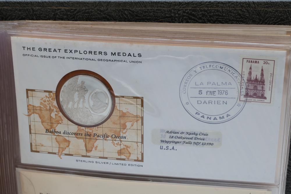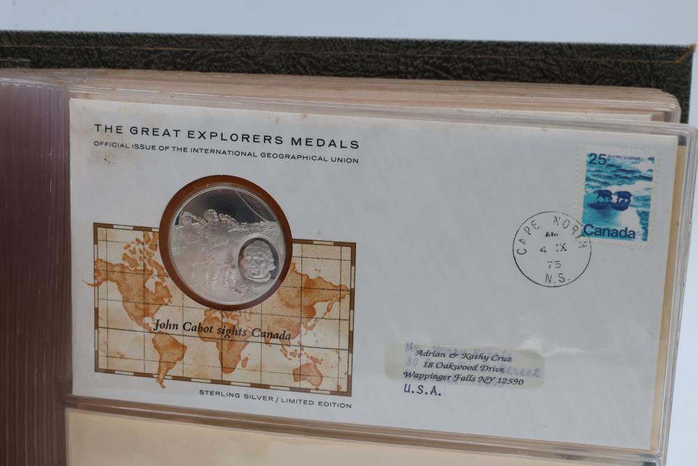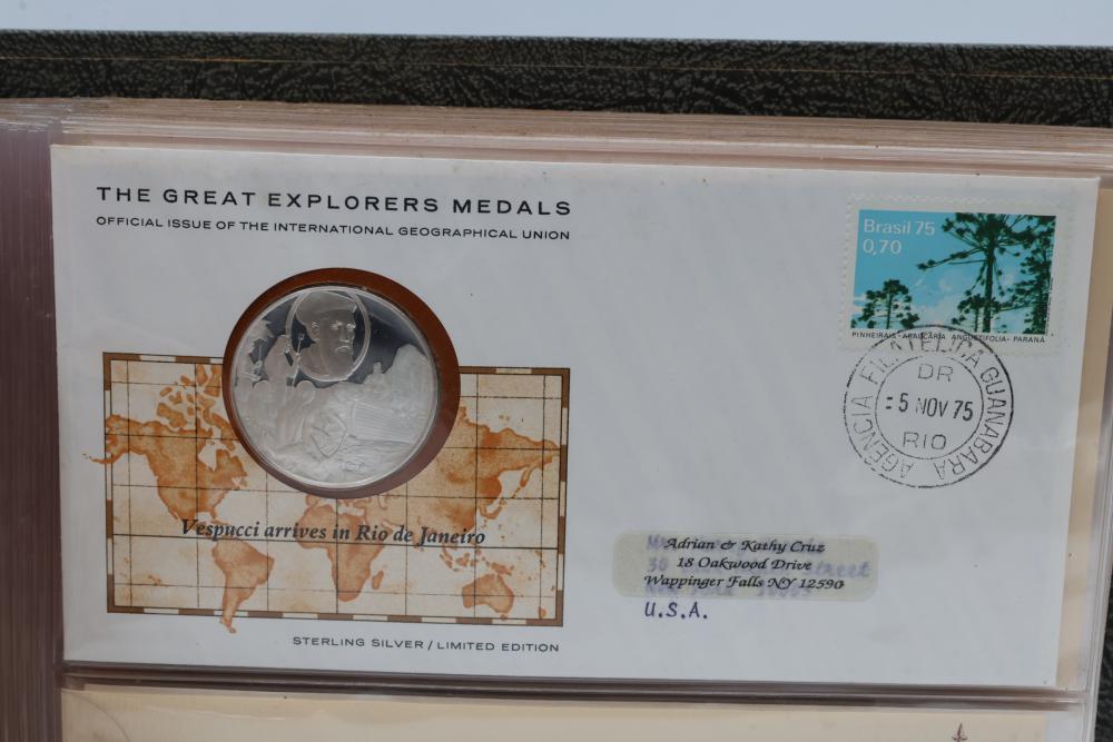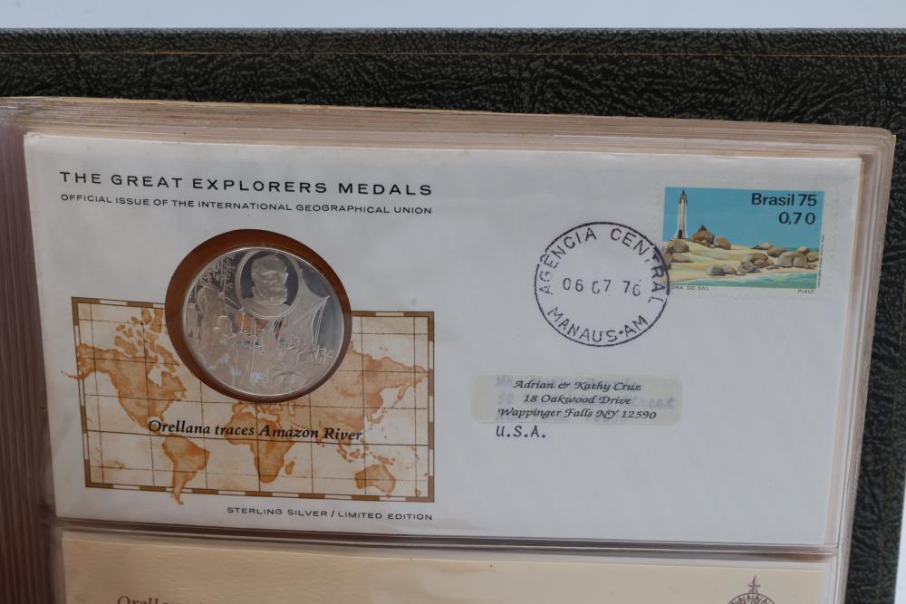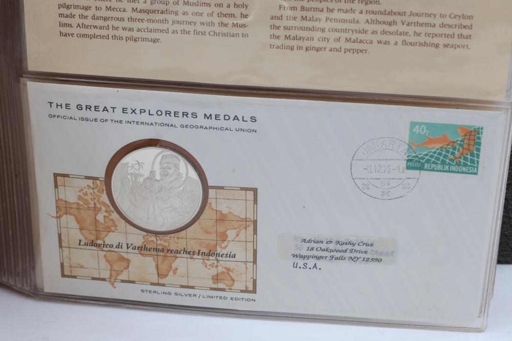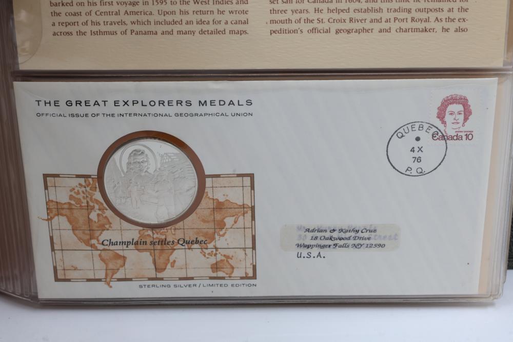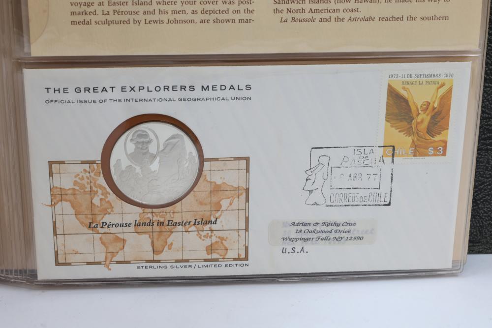 The Great Explorers Medals First Edition Set with Sterling Silver Proof Medals. Includes 23 engraved medals, each weighing approx. 25.49 grams featuring notable explorers such as Leif Erikson, Marco Polo, Christopher Columbus, Vasco da Gama, and others. Comes in an album with certificates of authenticity. Total weight approximately 586.27 grams.
