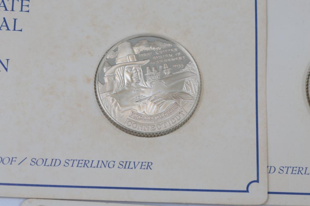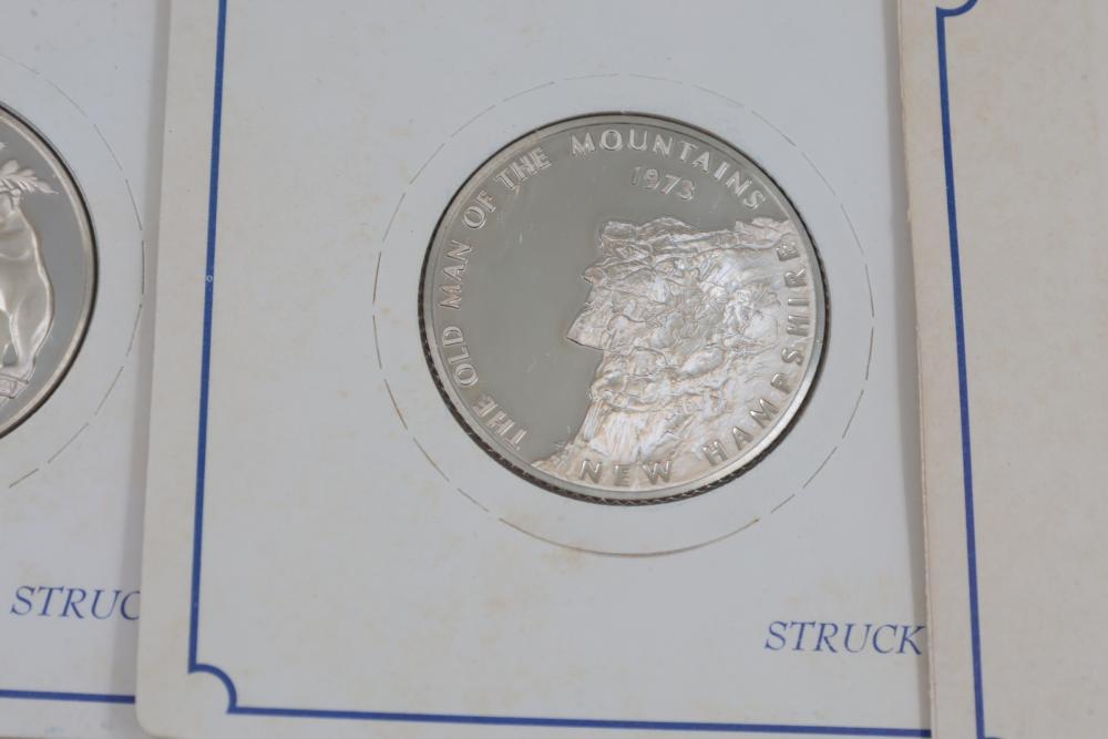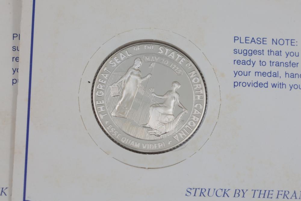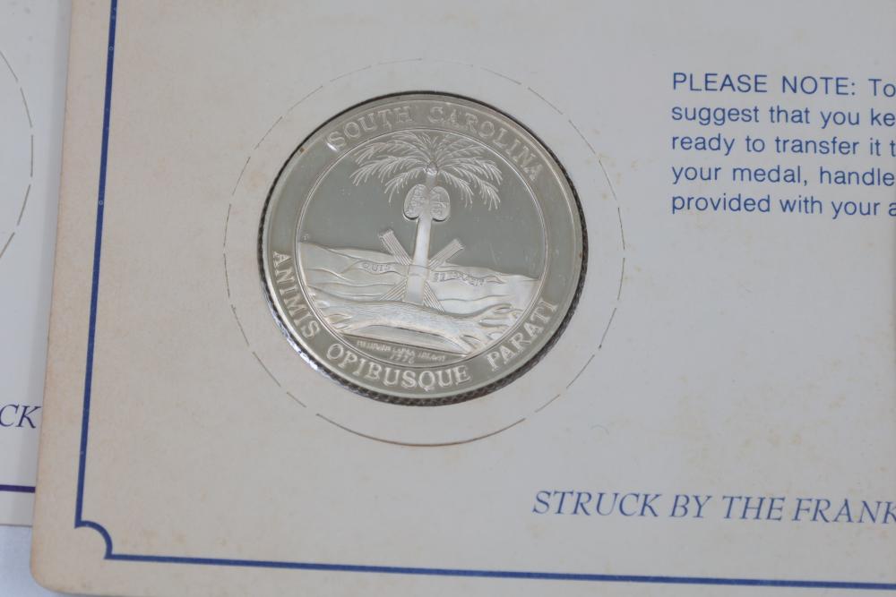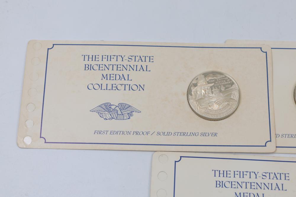 (7) Fifty-State Bicentennial Solid Sterling Silver Medals by Franklin Mint. A collection of solid sterling silver medals, each representing a U.S. state with historical and state-themed designs. Each medal is marked as proof and housed in original packaging provided by Franklin Mint. 10 coins total. Total weight being 224 grams. Each coins weighs approximately 32 grams.
