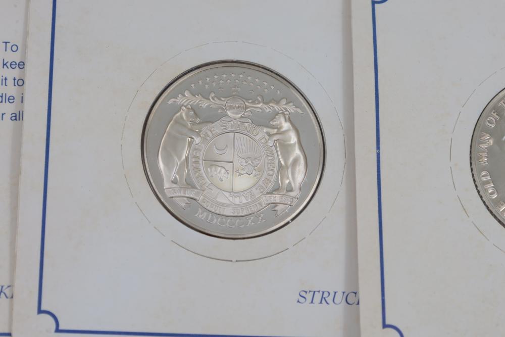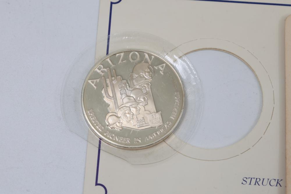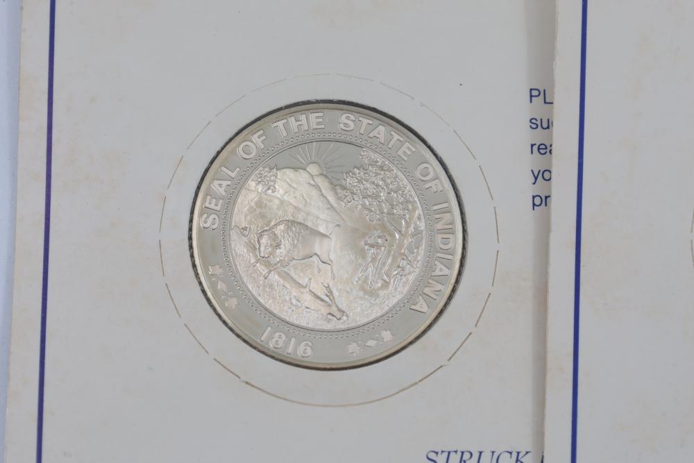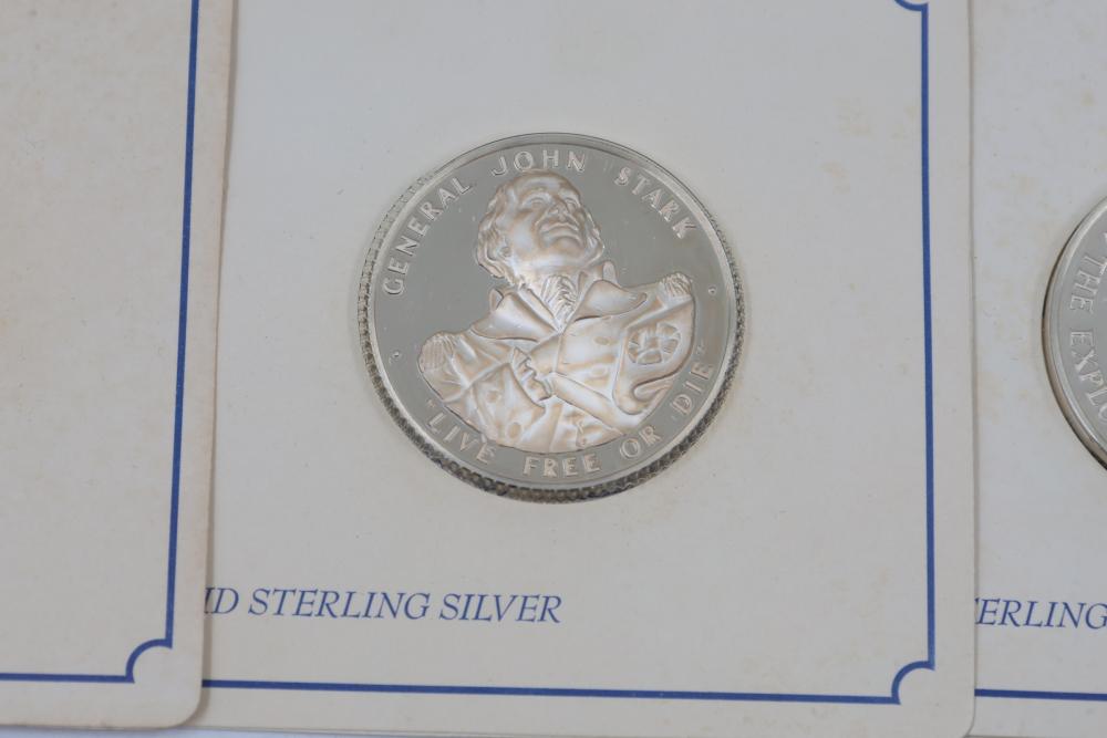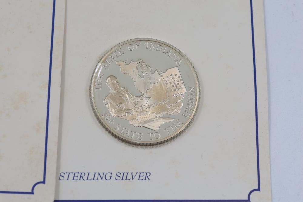 (7) Fifty-State Bicentennial Solid Sterling Silver Medals by Franklin Mint. A collection of solid sterling silver medals, each representing a U.S. state with historical and state-themed designs. Each medal is marked as proof and housed in original packaging provided by Franklin Mint. 10 coins total. Total weight being 224 grams. Each coins weighs approximately 32 grams.