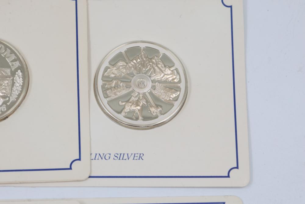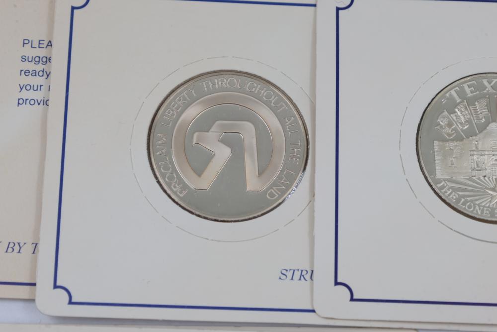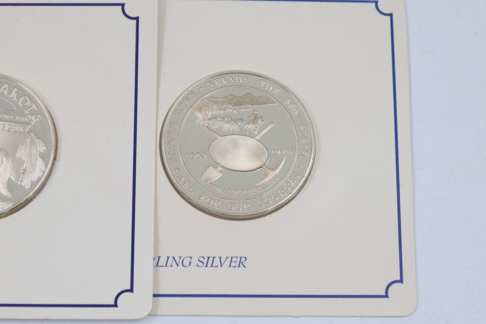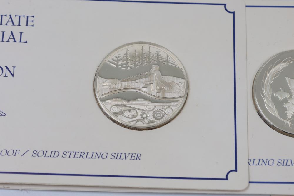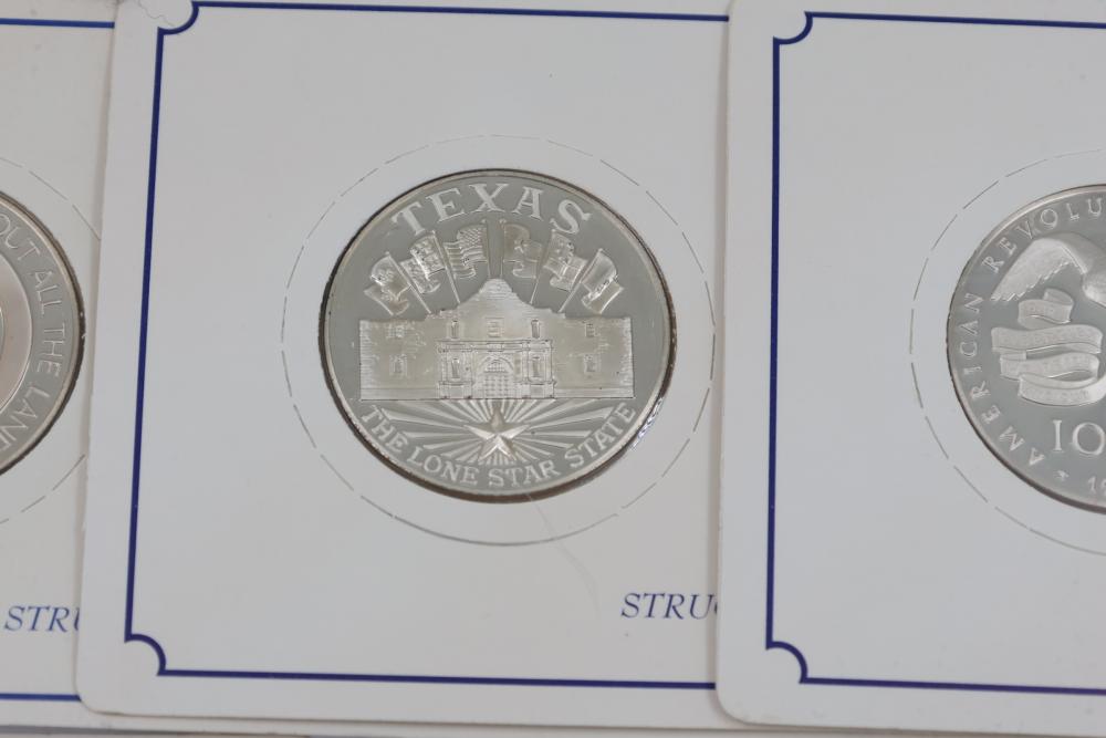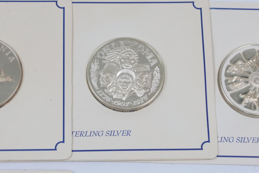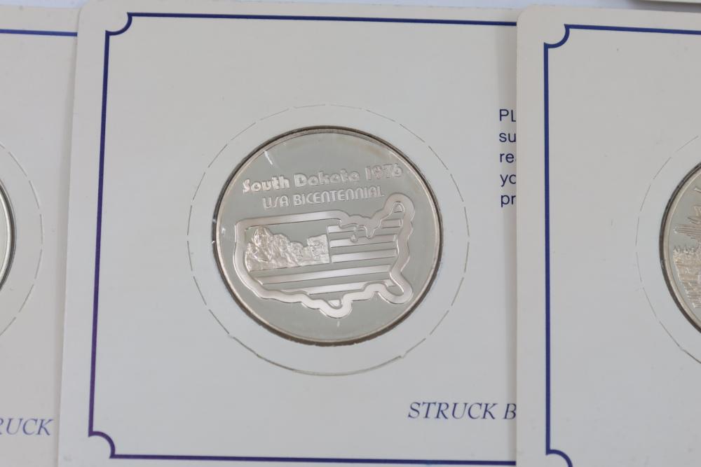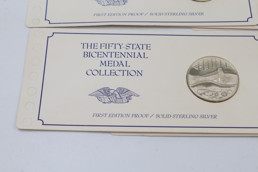 (10) Fifty-State Bicentennial Sterling Silver Proof Medals. Includes first-edition proof medals crafted from solid sterling silver, each representing a U.S. state. Medals are mounted on presentation cards with detailed inscriptions. 10 coins total. Total weight being 320 grams. Each coin weighs approximately 32 grams.
