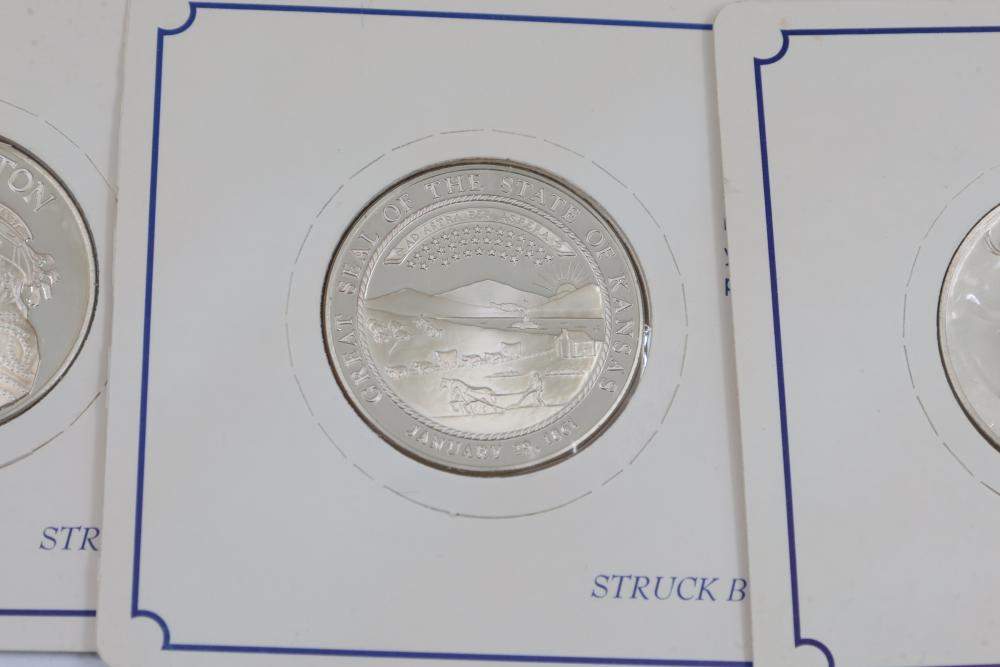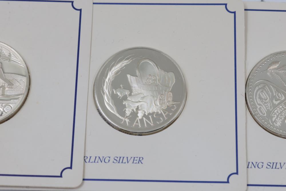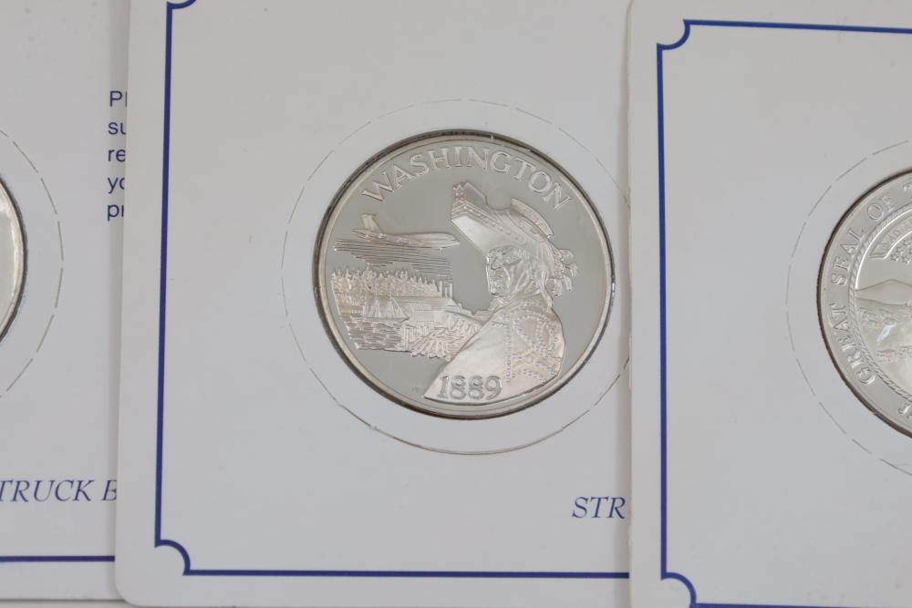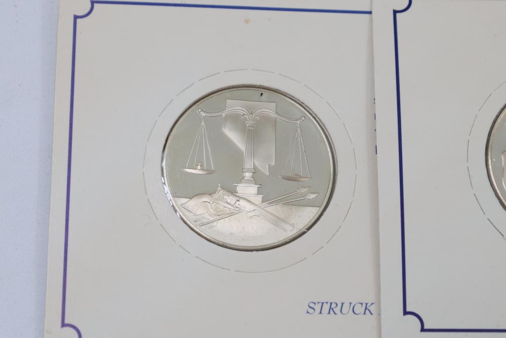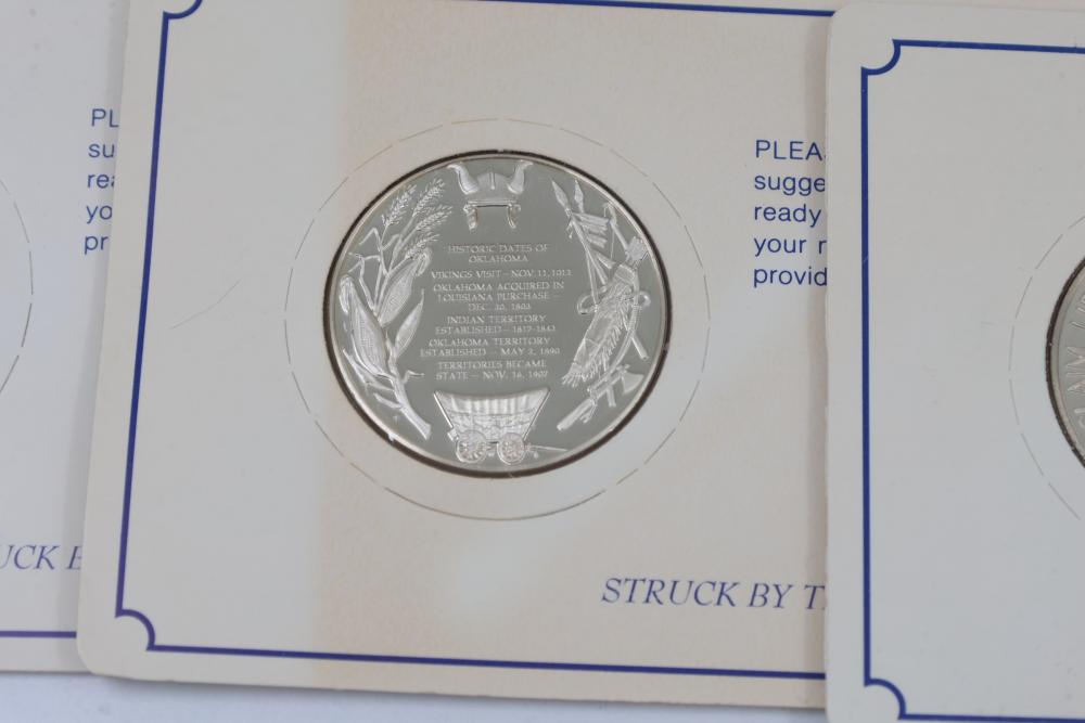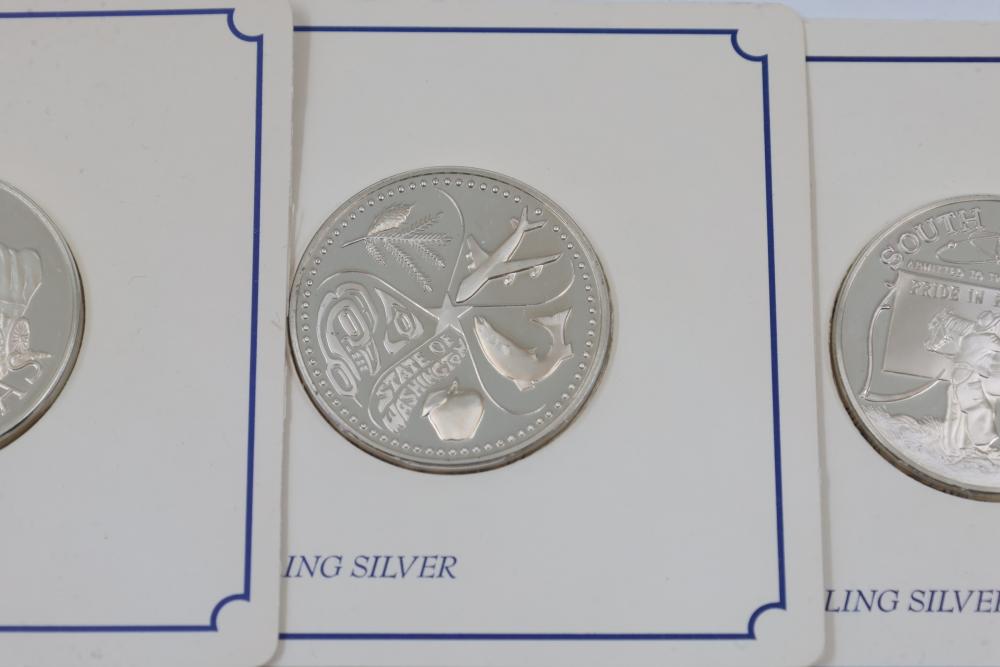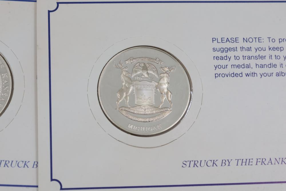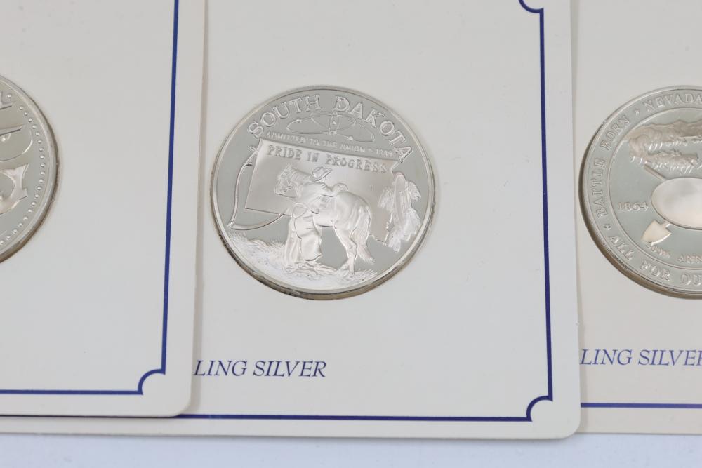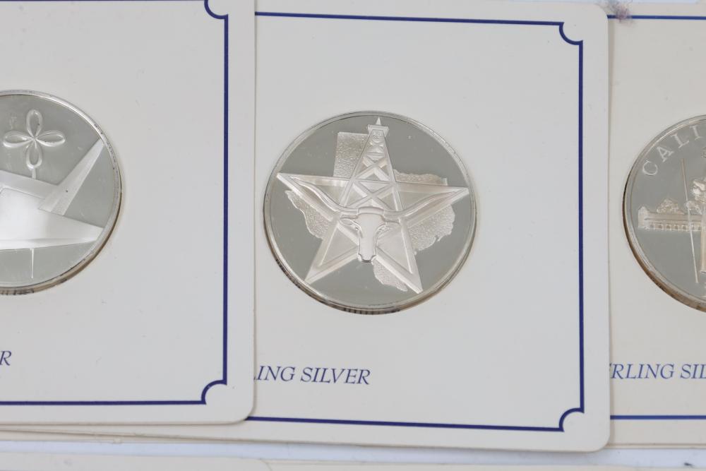 (10) Fifty-State Bicentennial Sterling Silver Proof Medals. Includes first-edition proof medals crafted from solid sterling silver, each representing a U.S. state. Medals are mounted on presentation cards with detailed inscriptions. 10 coins total. Total weight being 320 grams. Each coin weighs approximately 32 grams.