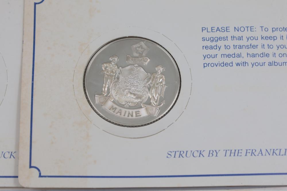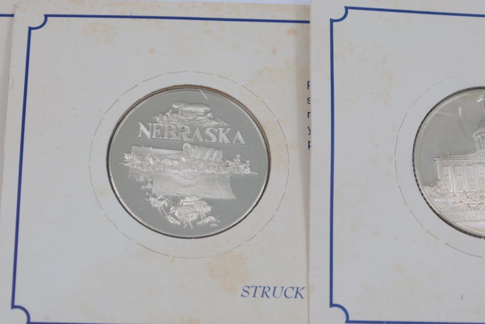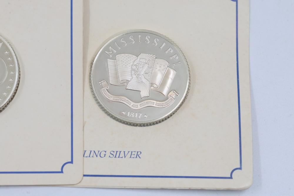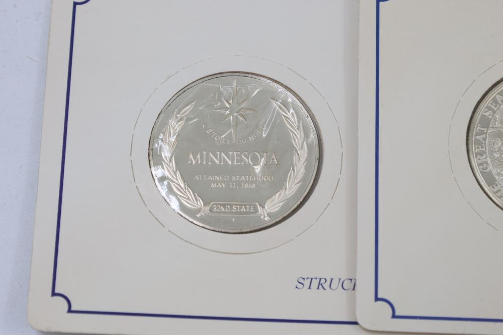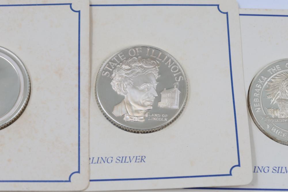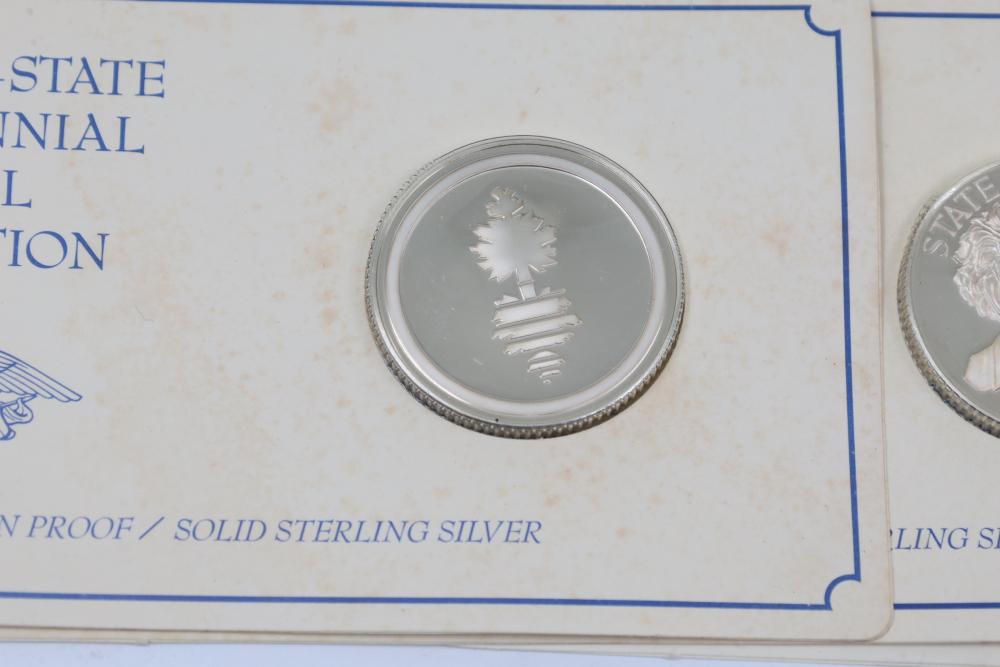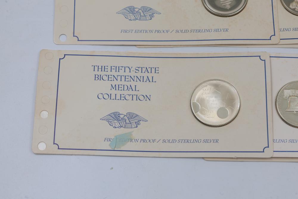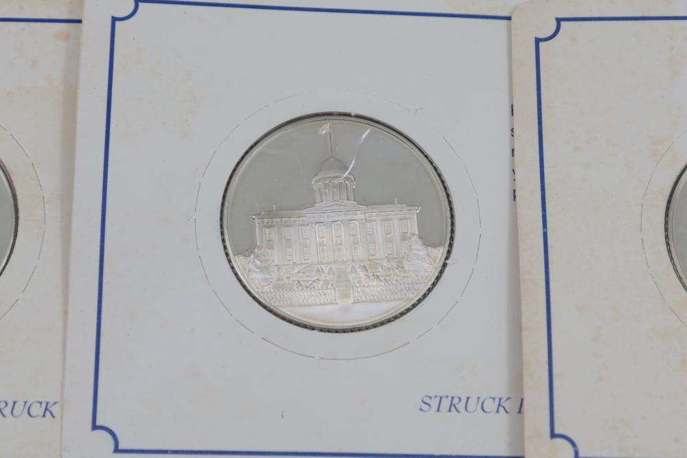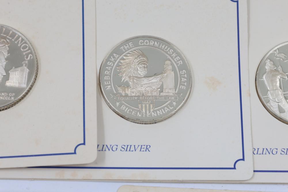 (10) Sterling Silver Bicentennial State Medals. Includes a series of sterling silver medals, each representing a different U.S. state, featuring various state-specific imagery and inscriptions. Medals are preserved in original display cards marked "Solid Sterling Silver" and "Struck in Proof." 10 coins total. Total weight being 320 grams. Each coin weighs approximately 32 grams.
