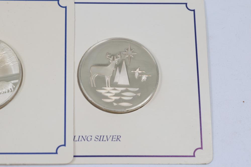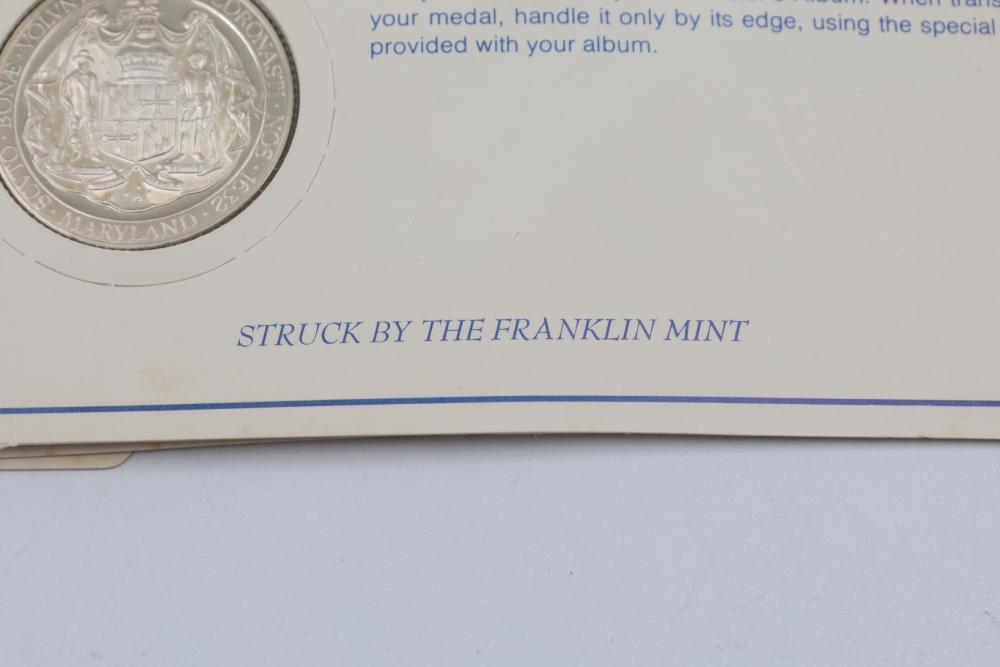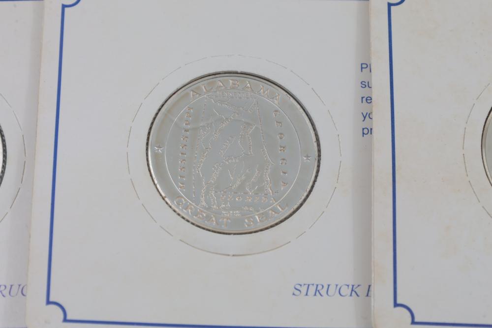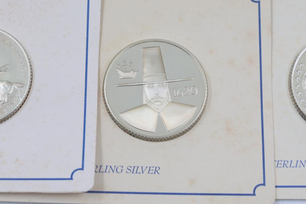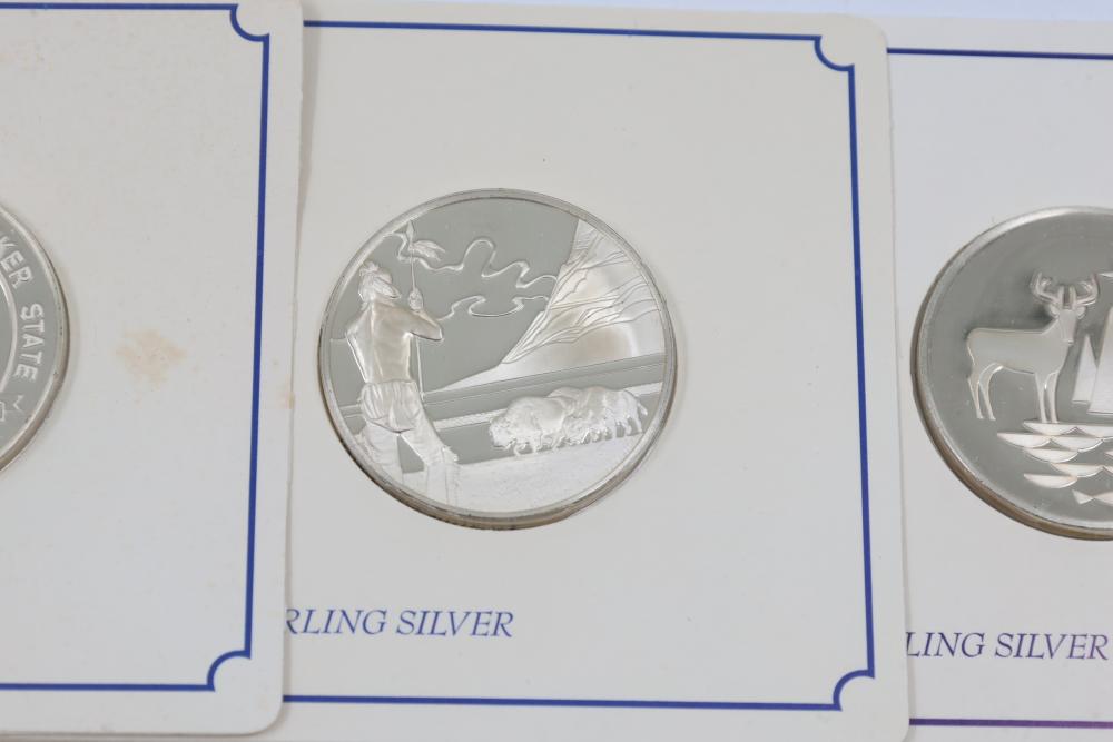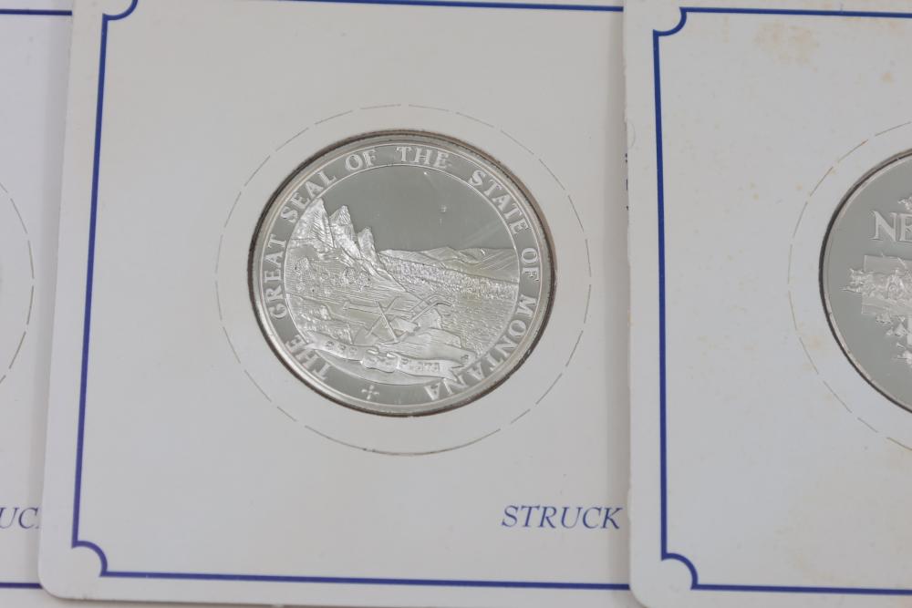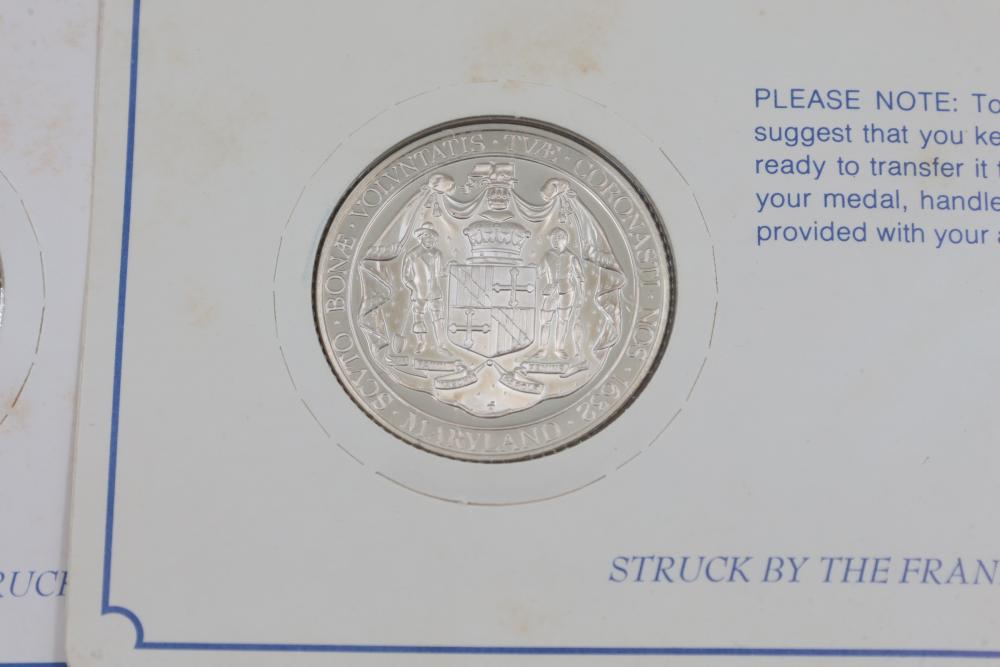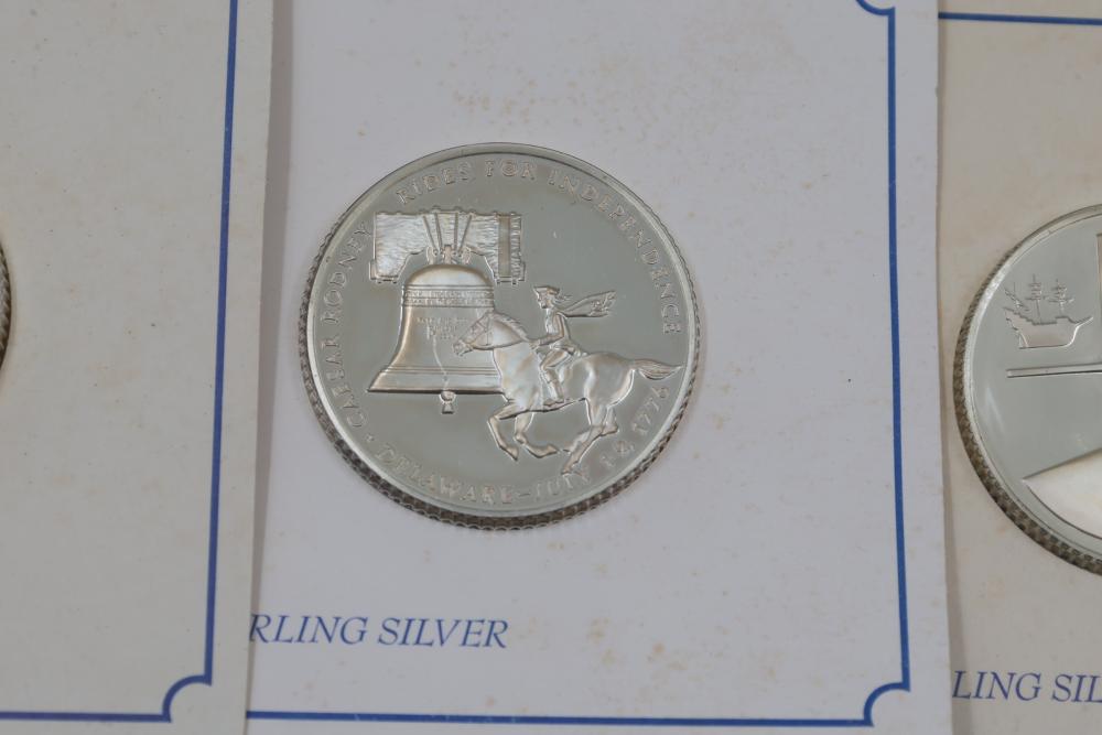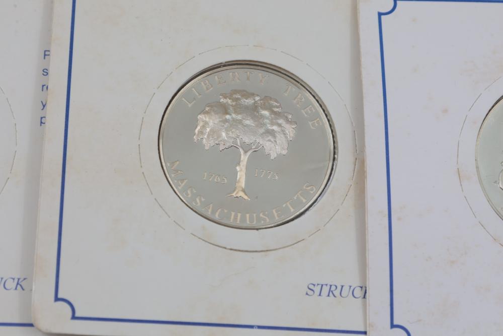(10) Sterling Silver Bicentennial State Medals. Includes a series of sterling silver medals, each representing a different U.S. state, featuring various state-specific imagery and inscriptions. Medals are preserved in original display cards marked "Solid Sterling Silver" and "Struck in Proof." 10 coins total. Total weight being 320 grams. Each coin weighs approximately 32 grams.