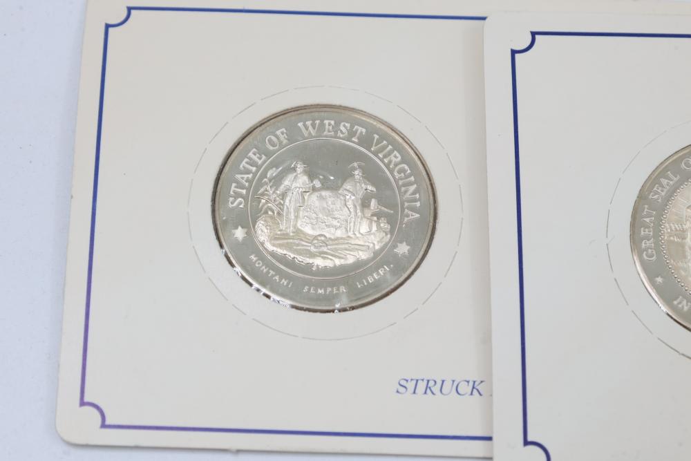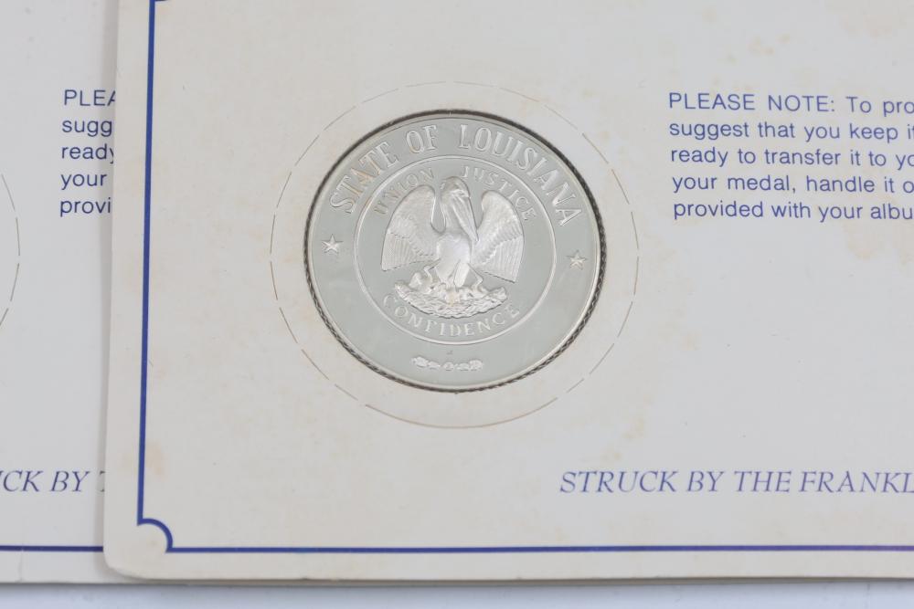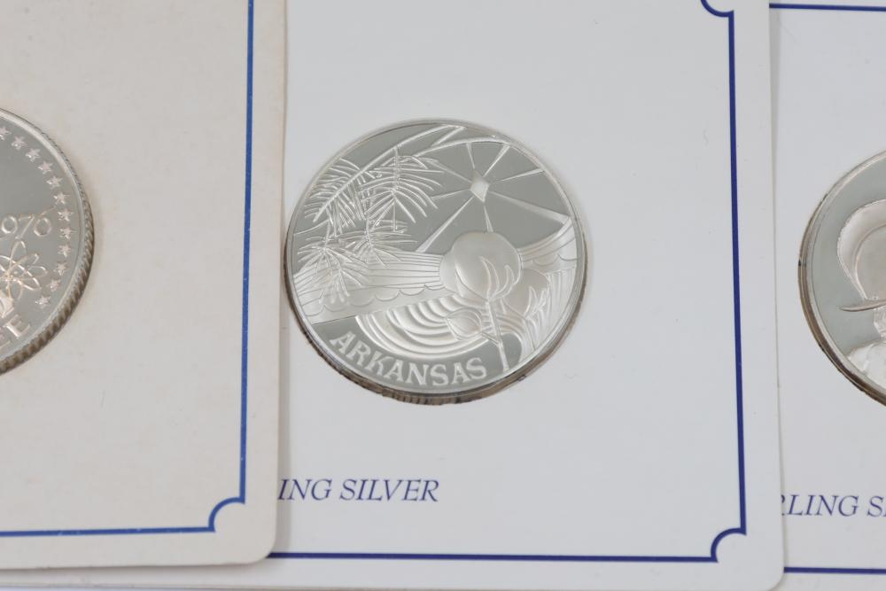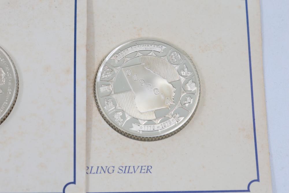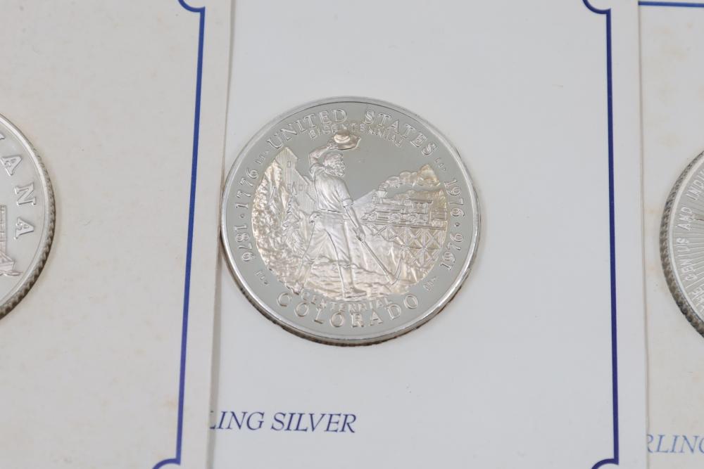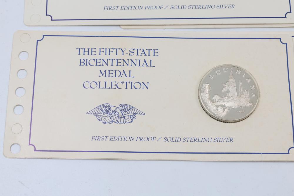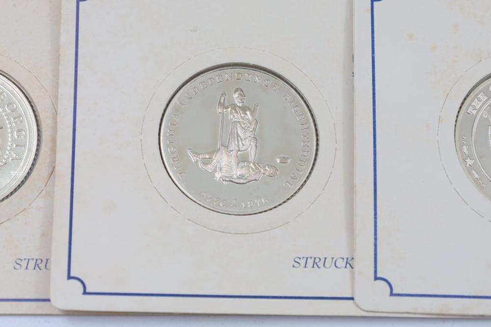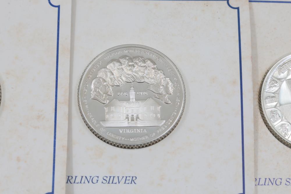 (10) Solid sterling silver bicentennial proof medals featuring detailed designs representing various states. Medals are housed in protective holders labeled with state names and include intricate depictions of each state's historical or cultural symbols. 10 coins total. Total weight 288 grams. Each coin weighs approximately 32 grams.