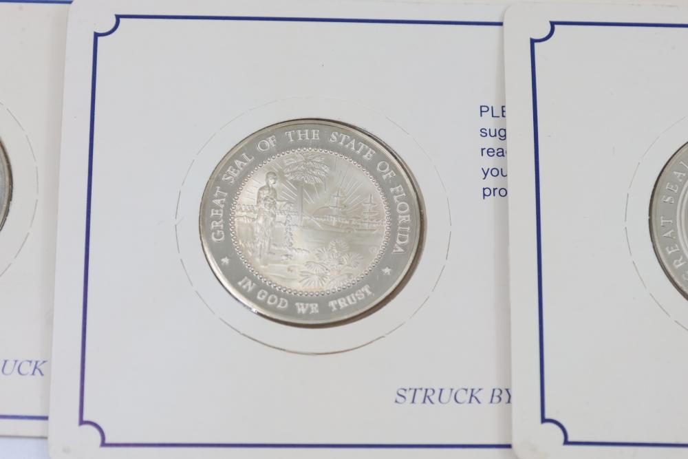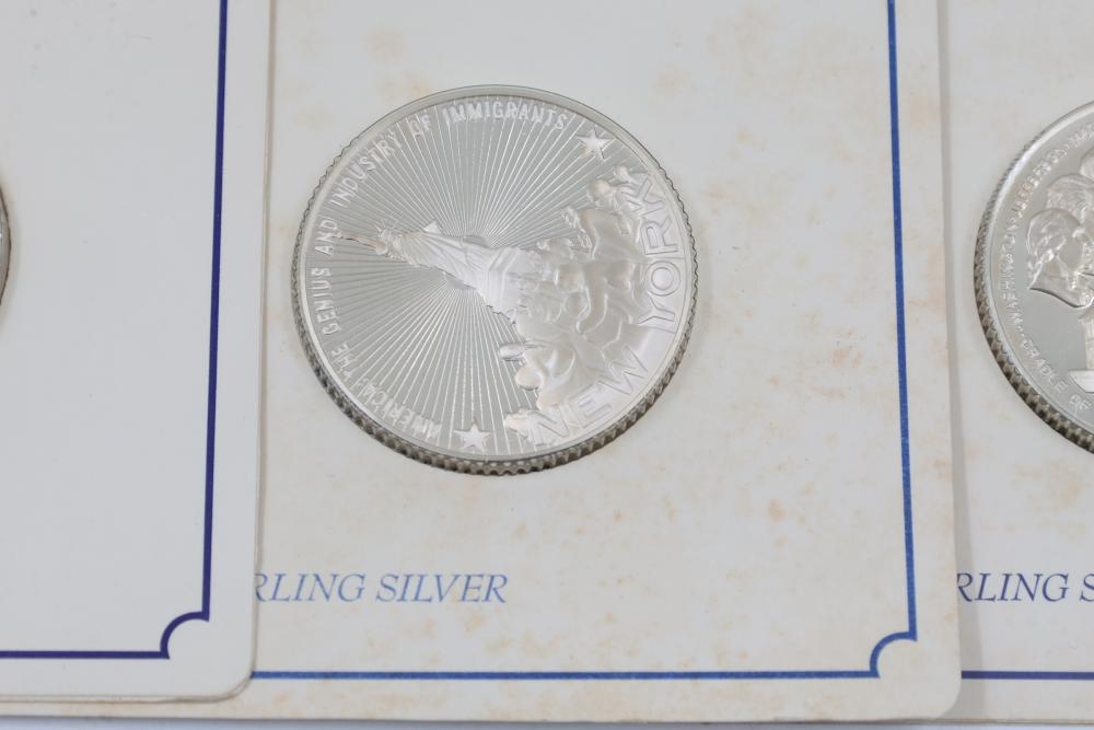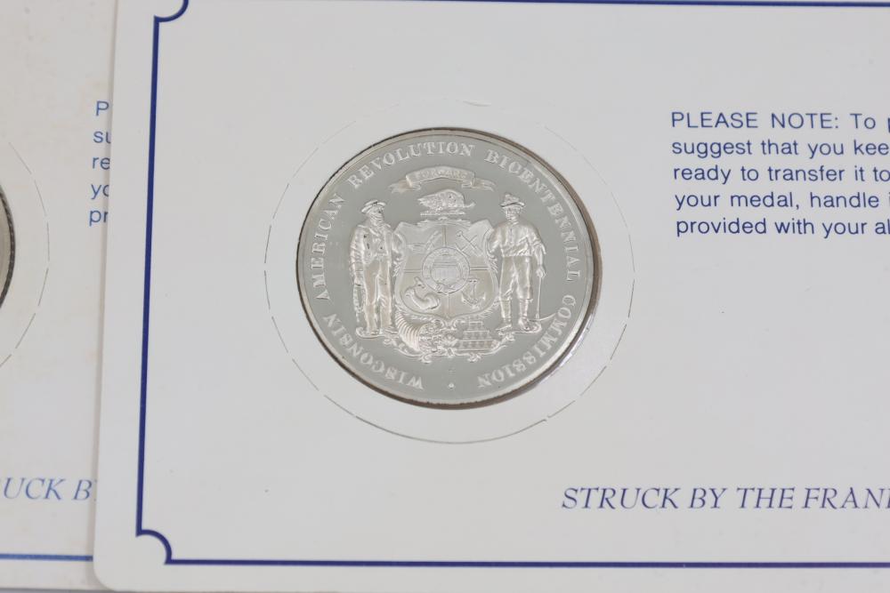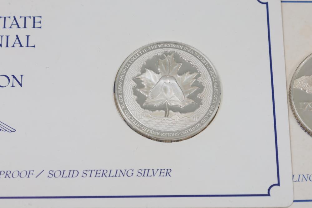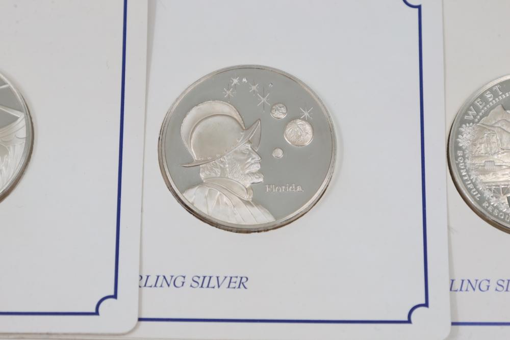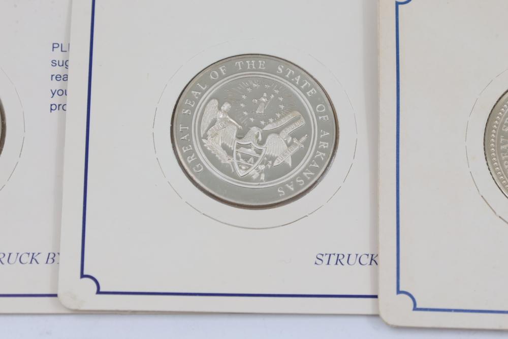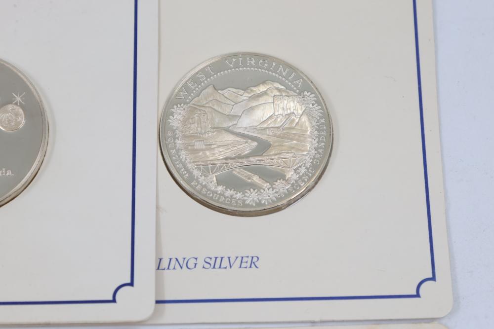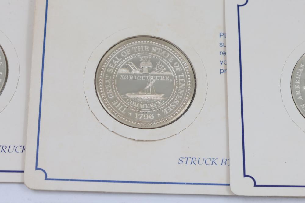 (10) Solid sterling silver bicentennial proof medals featuring detailed designs representing various states. Medals are housed in protective holders labeled with state names and include intricate depictions of each state's historical or cultural symbols. 10 coins total. Total weight 288 grams. Each coin weighs approximately 32 grams.